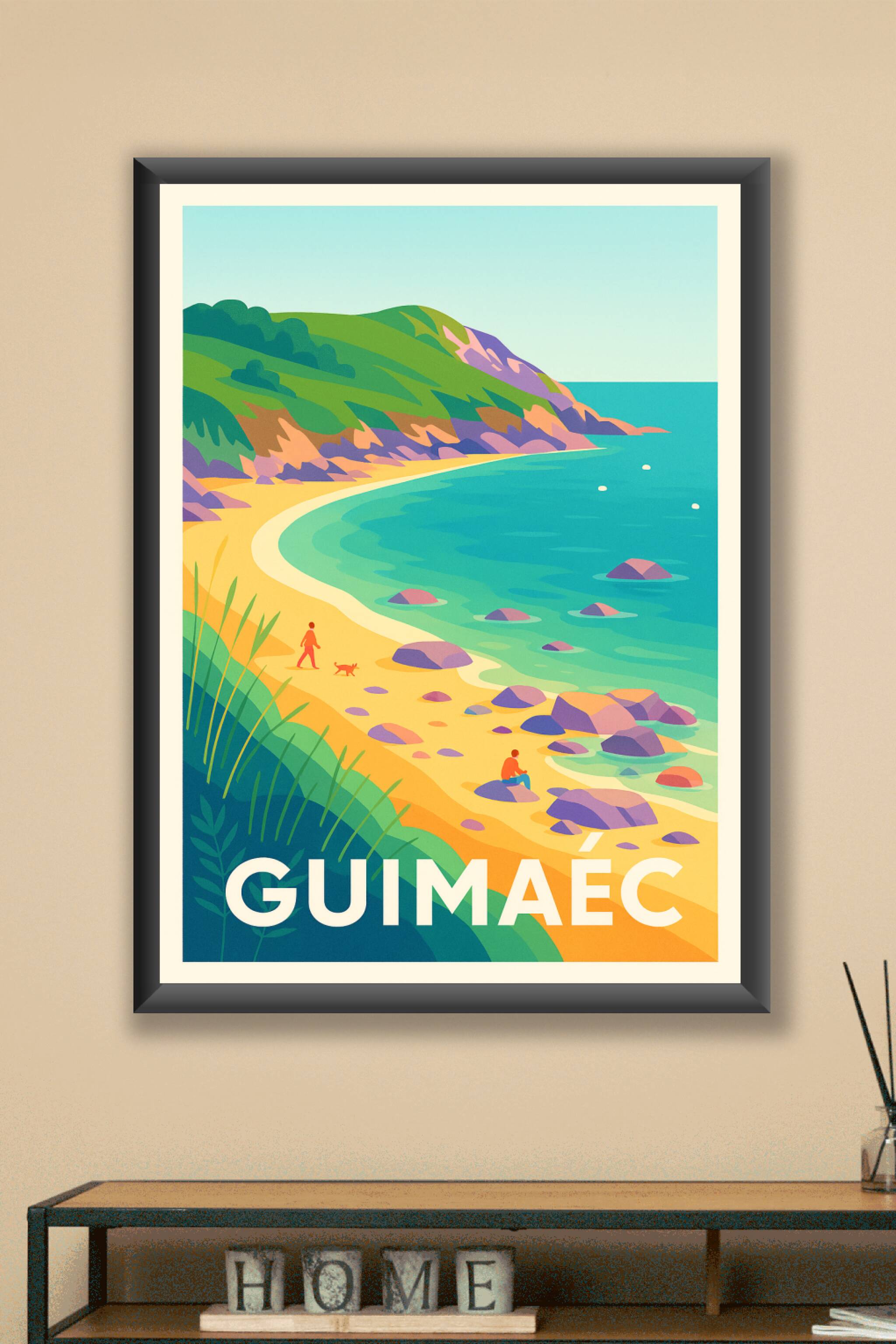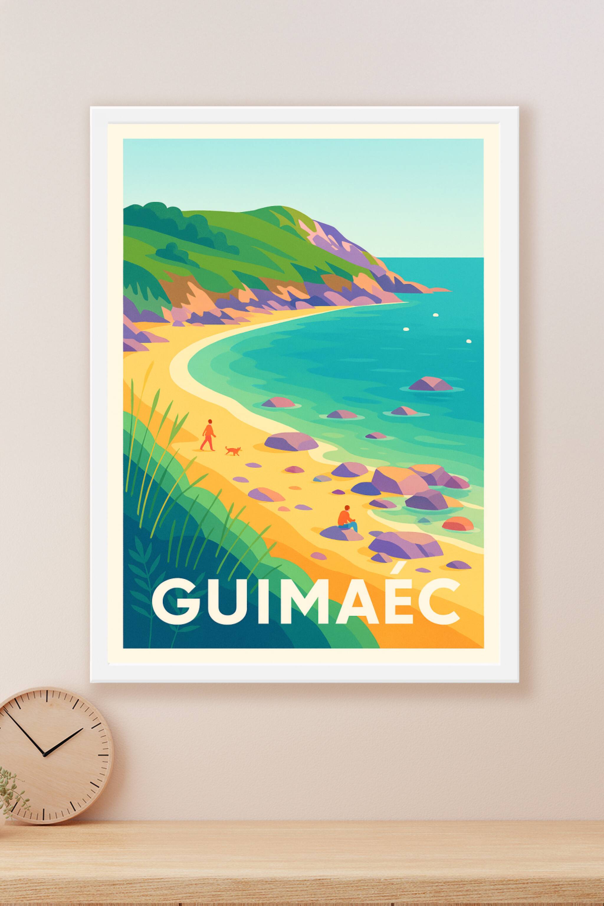 Découvrez la beauté sauvage de Guimaëc avec cette affiche illustrant sa côte aux couleurs vibrantes et lumineuses. Ce poster capture l'esprit paisi...