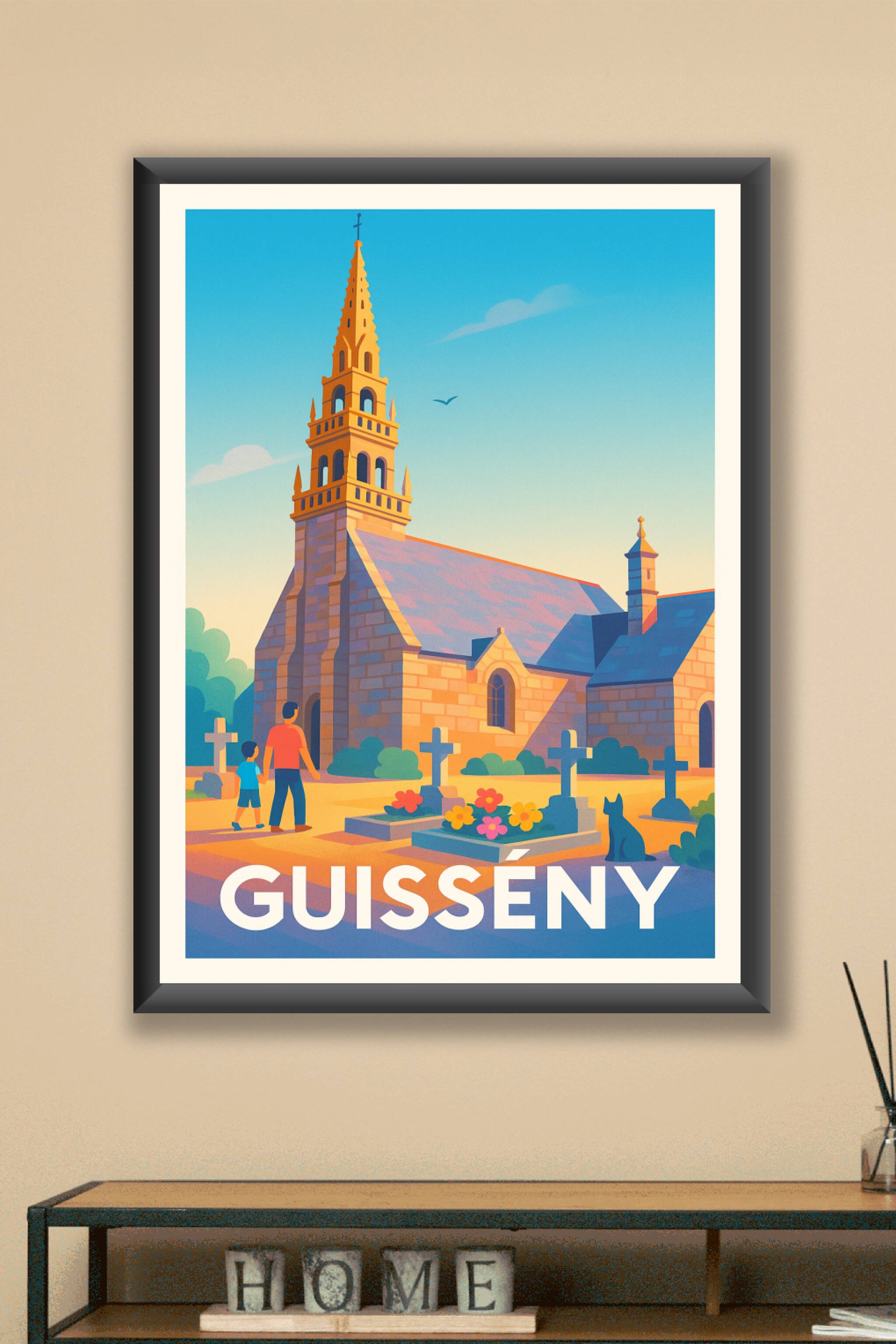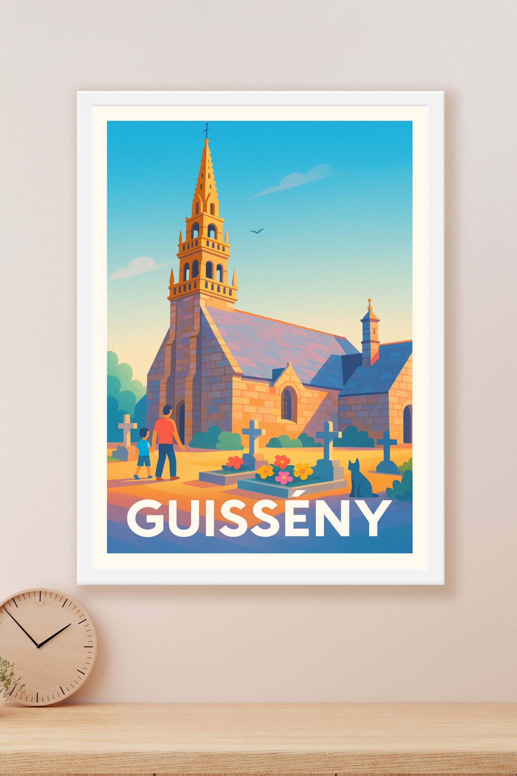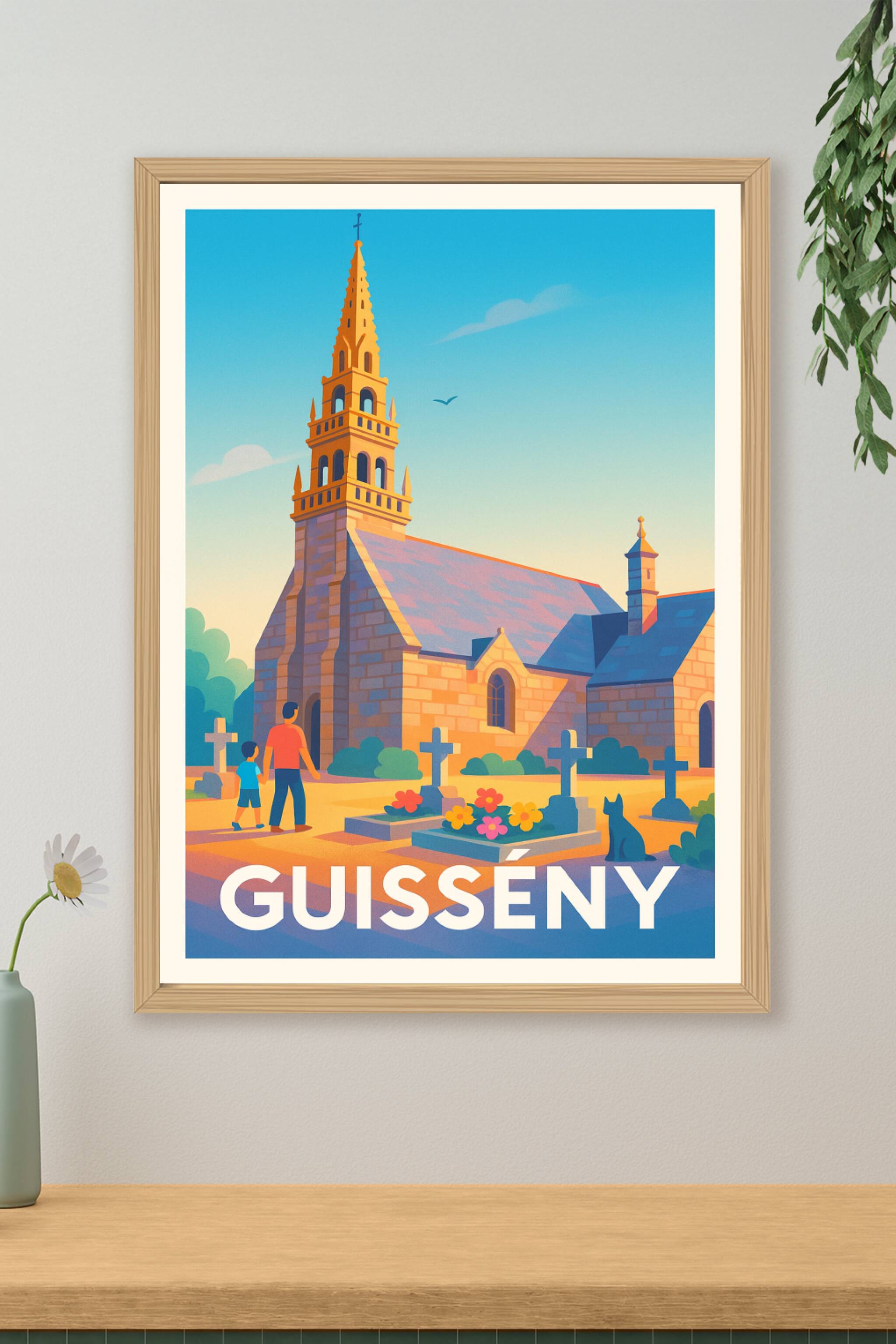 Découvrez l'atmosphère paisible et authentique de Guissény avec cette affiche illustrée mettant en scène son architecture traditionnelle et son amb...