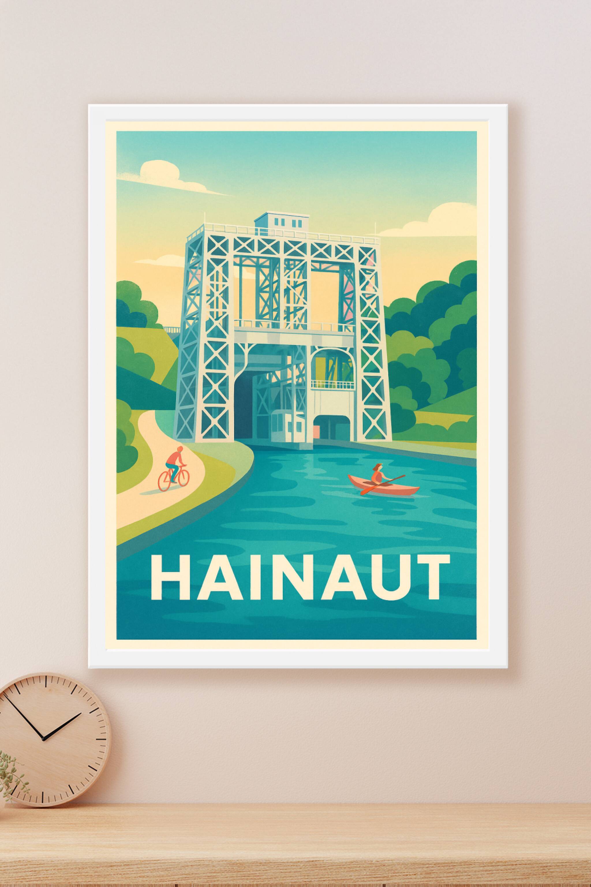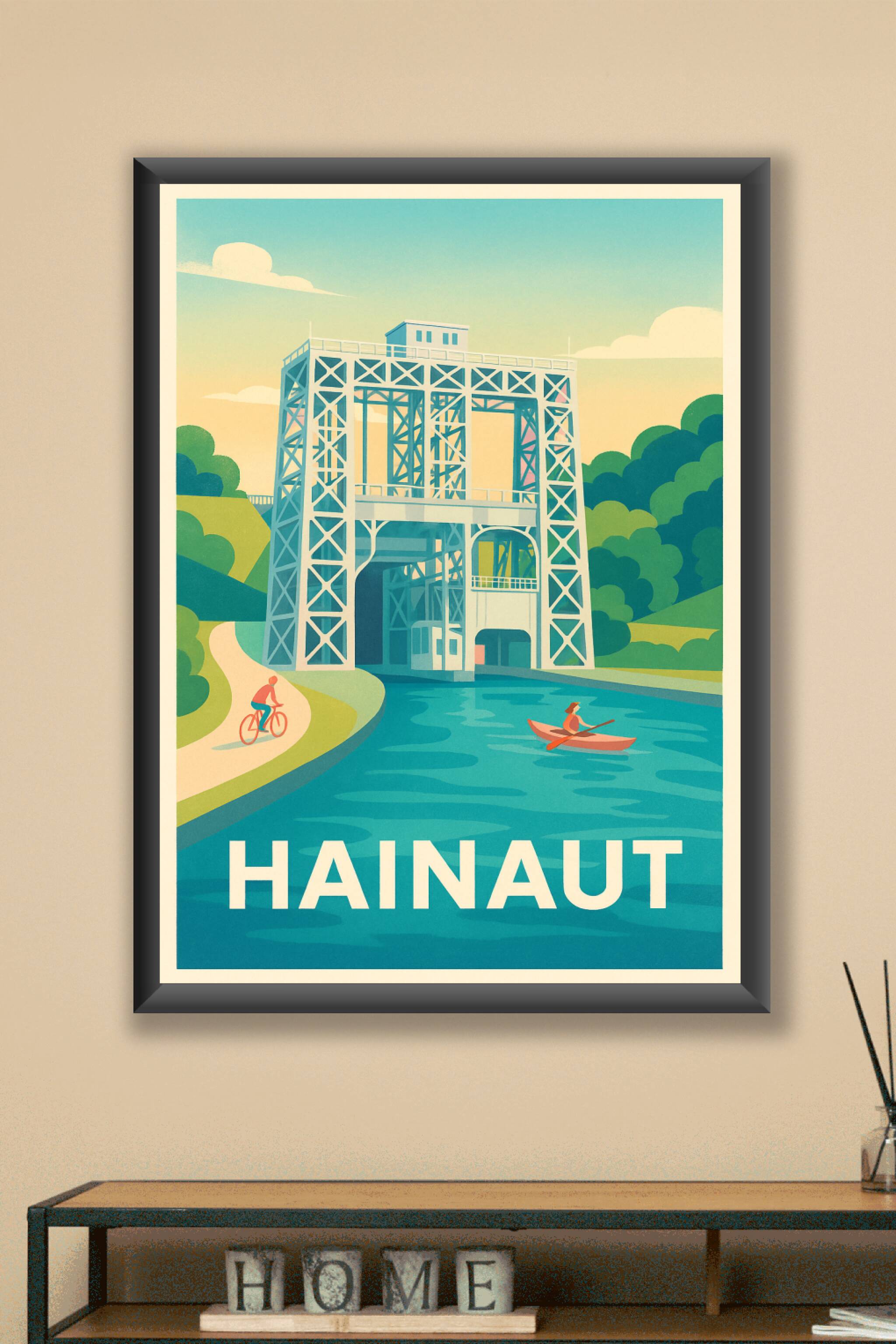 Plongez dans l'atmosphère unique du Hainaut avec ce poster illustré mettant en avant son patrimoine industriel et ses paysages apaisants. La scène met en lumière une construction métallique emblématique au bord d'un canal, idéale pour les amateurs de vélo et de kayak. Cette affiche est imprimée en tirage "Fine Art" sur papier coton 305g, garantissant une qualité d'impression exceptionnelle et une grande longévité des couleurs. Disponible en formats A1 à A4, avec ou sans cadre, elle s'intègre parfaitement à votre décoration intérieure ou offre un cadeau original pour les passionnés de la région. Profitez d'un produit 100% fabriqué en France pour sublimer votre espace de vie.