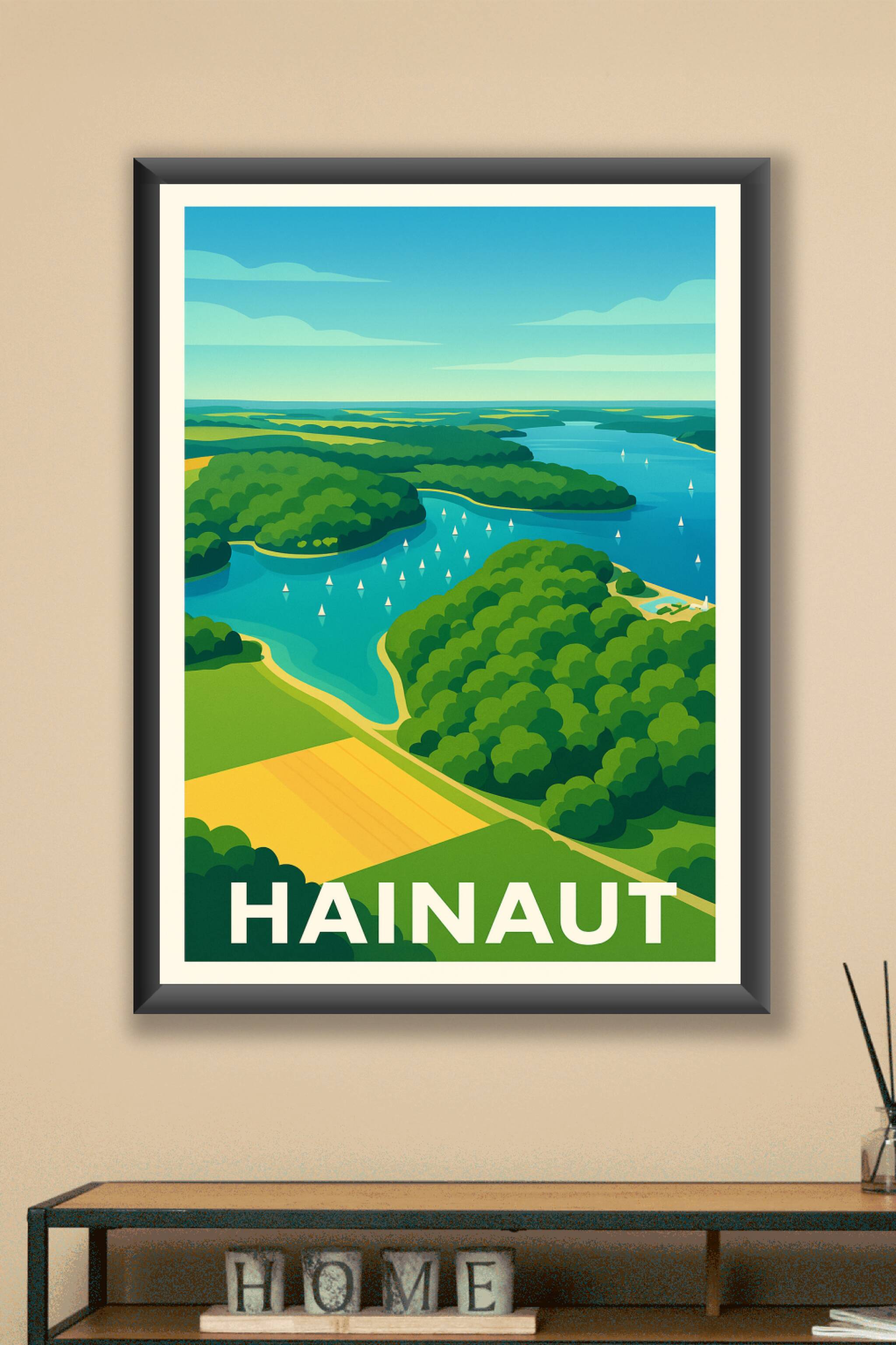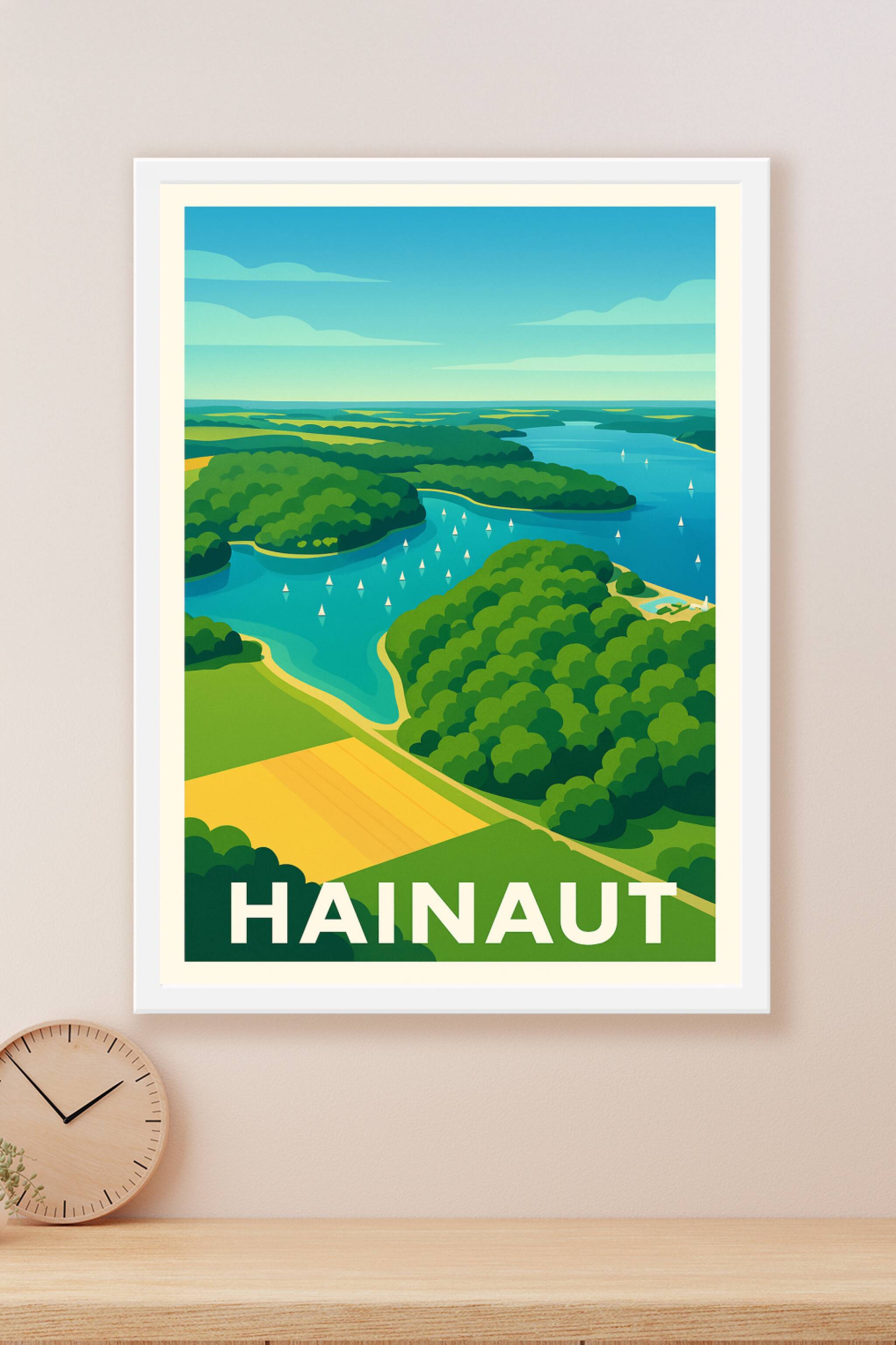 Découvrez la beauté paisible et verdoyante du Hainaut avec cette affiche illustrée mettant en avant ses paysages lacustres et ses forêts luxuriante...