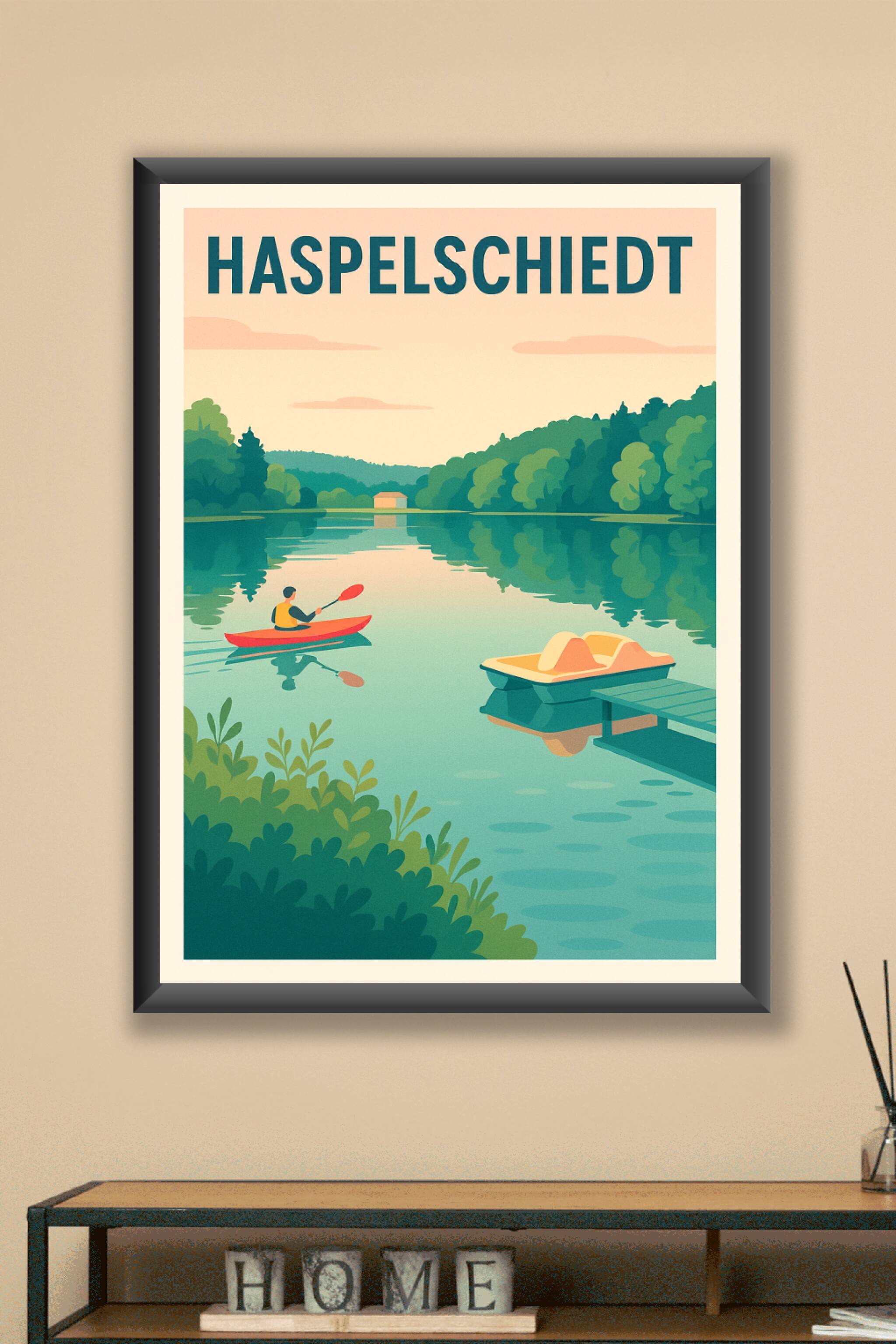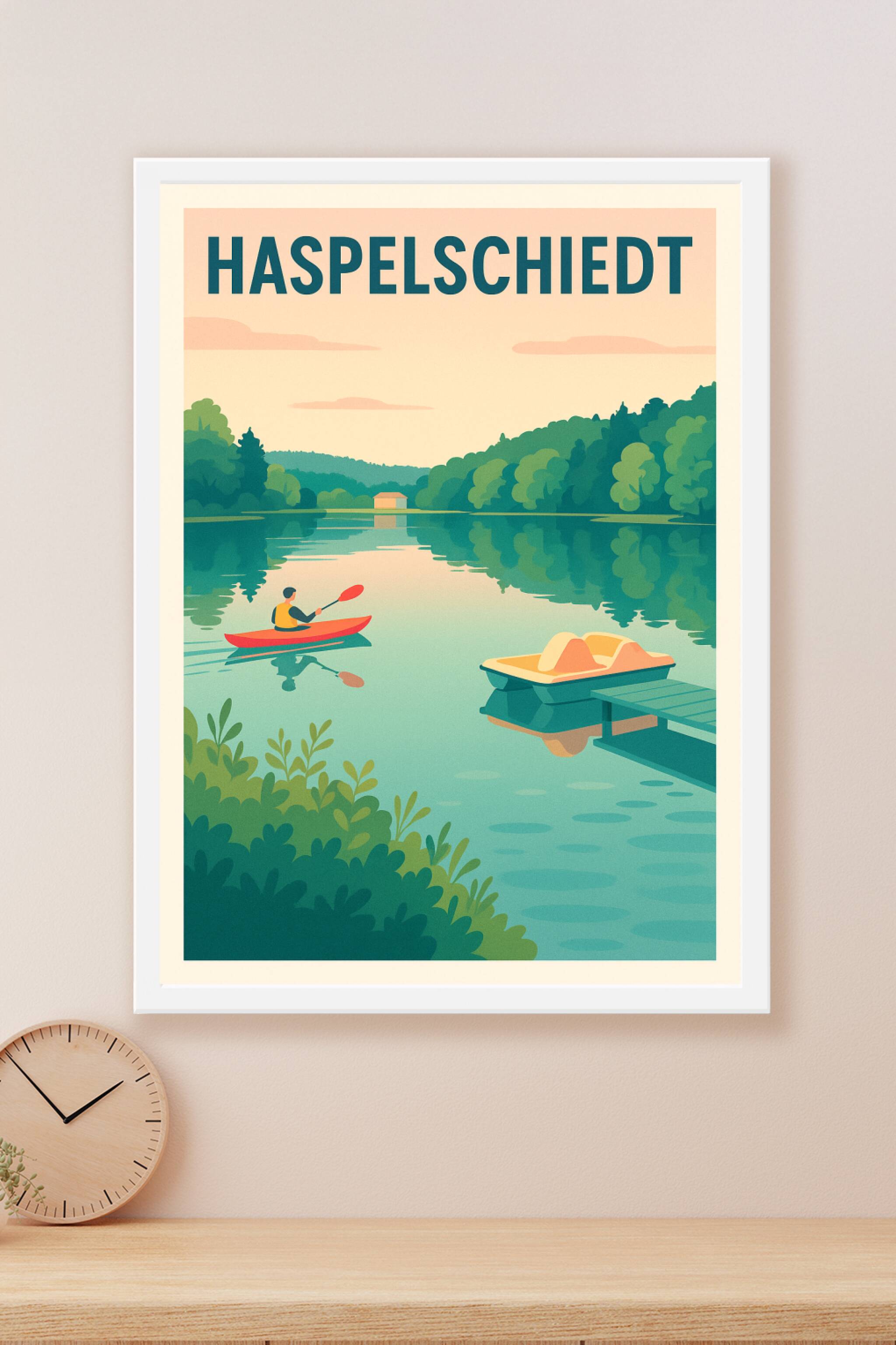 Découvrez la sérénité des paysages aquatiques d'Haspelschiedt avec cette affiche au style vintage et épuré. Le poster montre un moment de calme sur...
