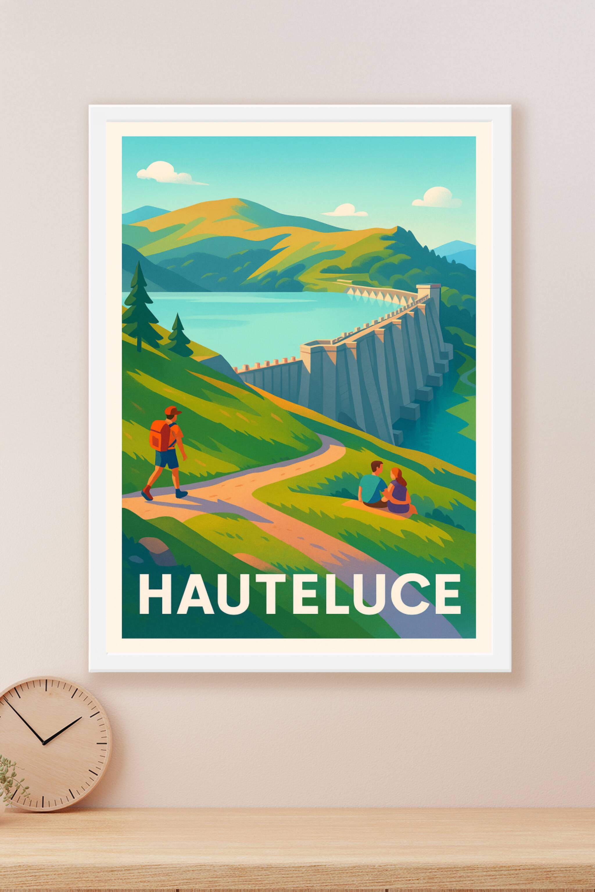 Découvrez la beauté naturelle de Hauteluce à travers ce poster illustré, qui capture l'harmonie entre paysages verdoyants, randonneurs et le majest...
