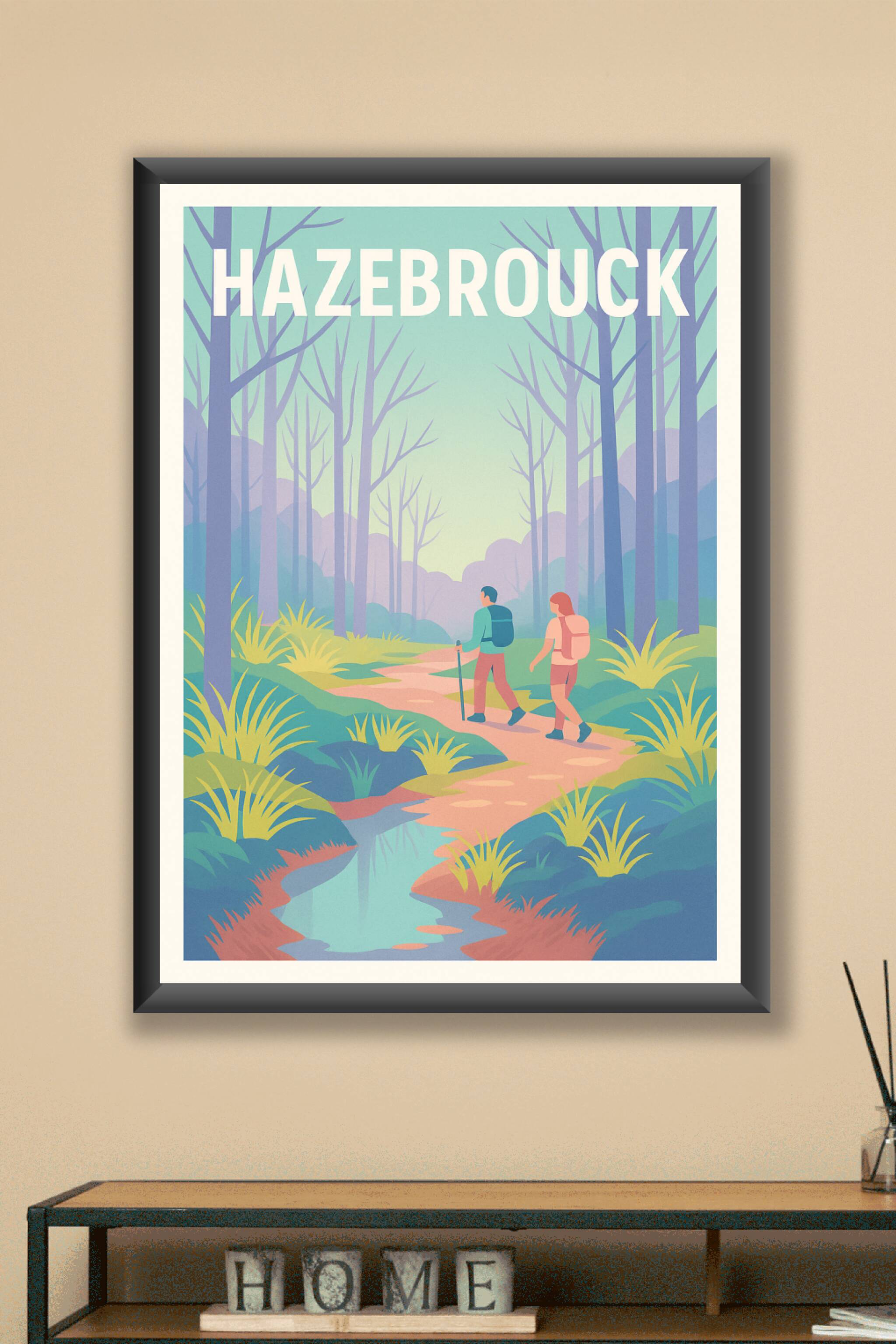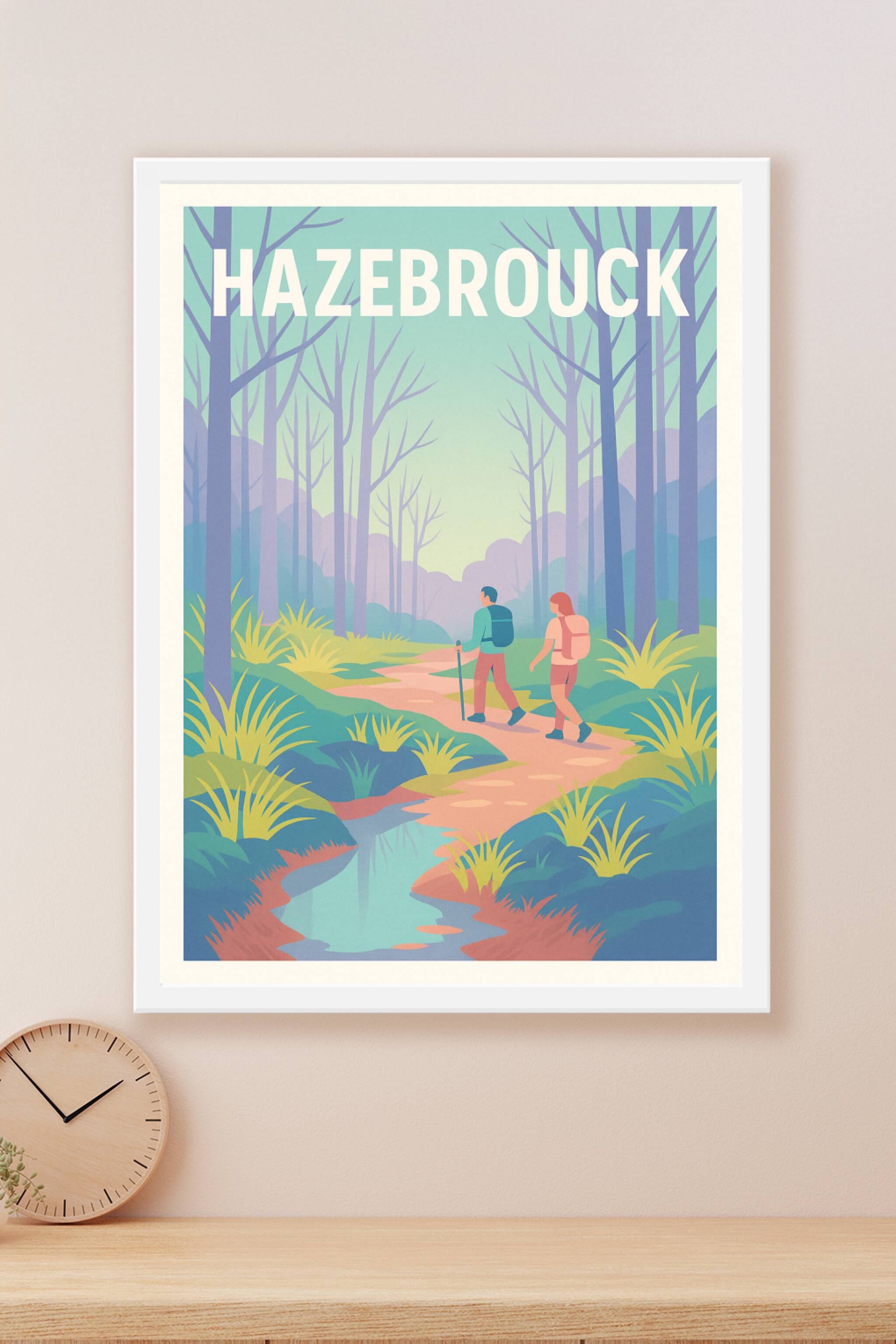 Découvrez la sérénité des paysages d'Hazebrouck avec cette affiche illustrée mettant en scène une promenade paisible à travers une forêt apaisante....