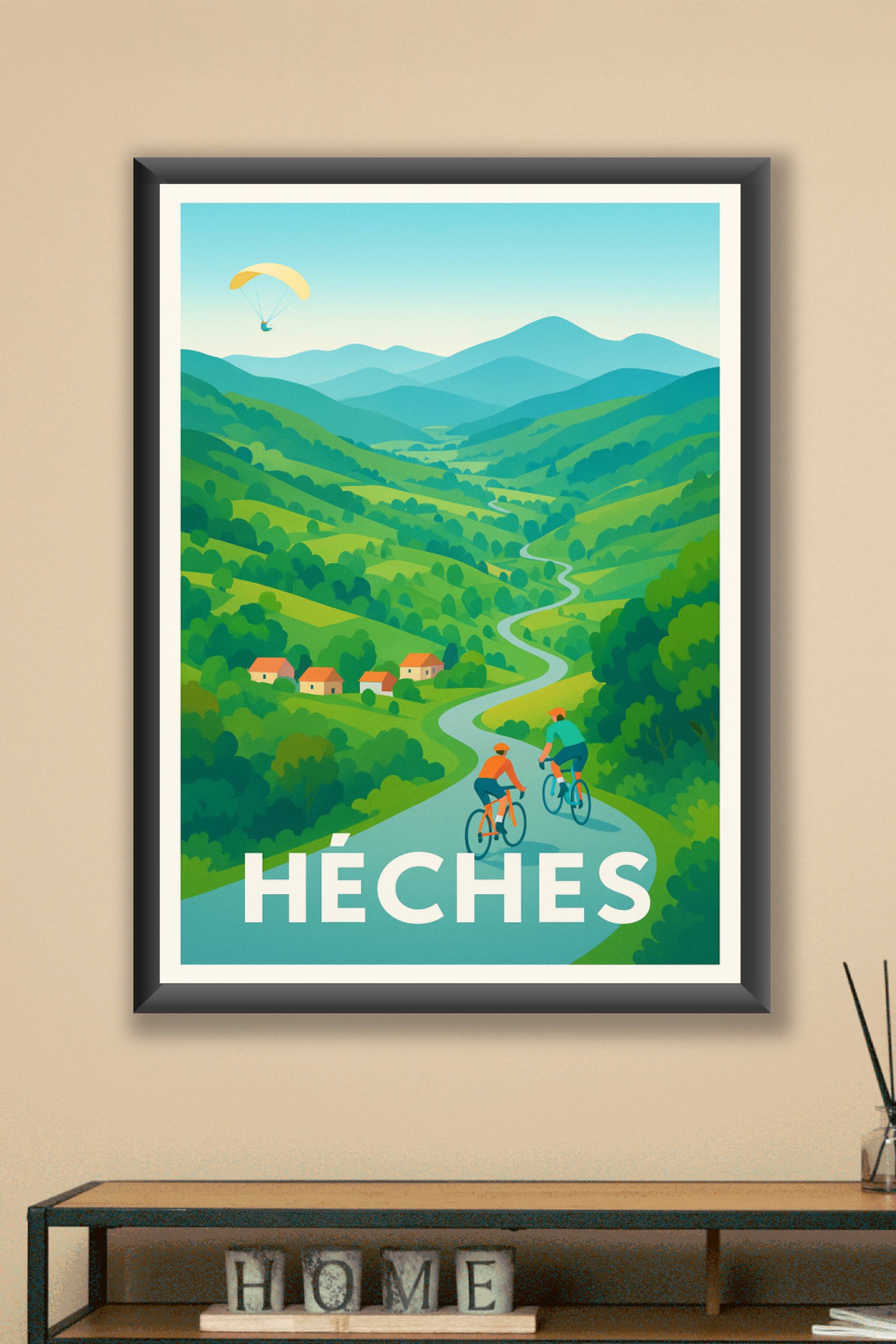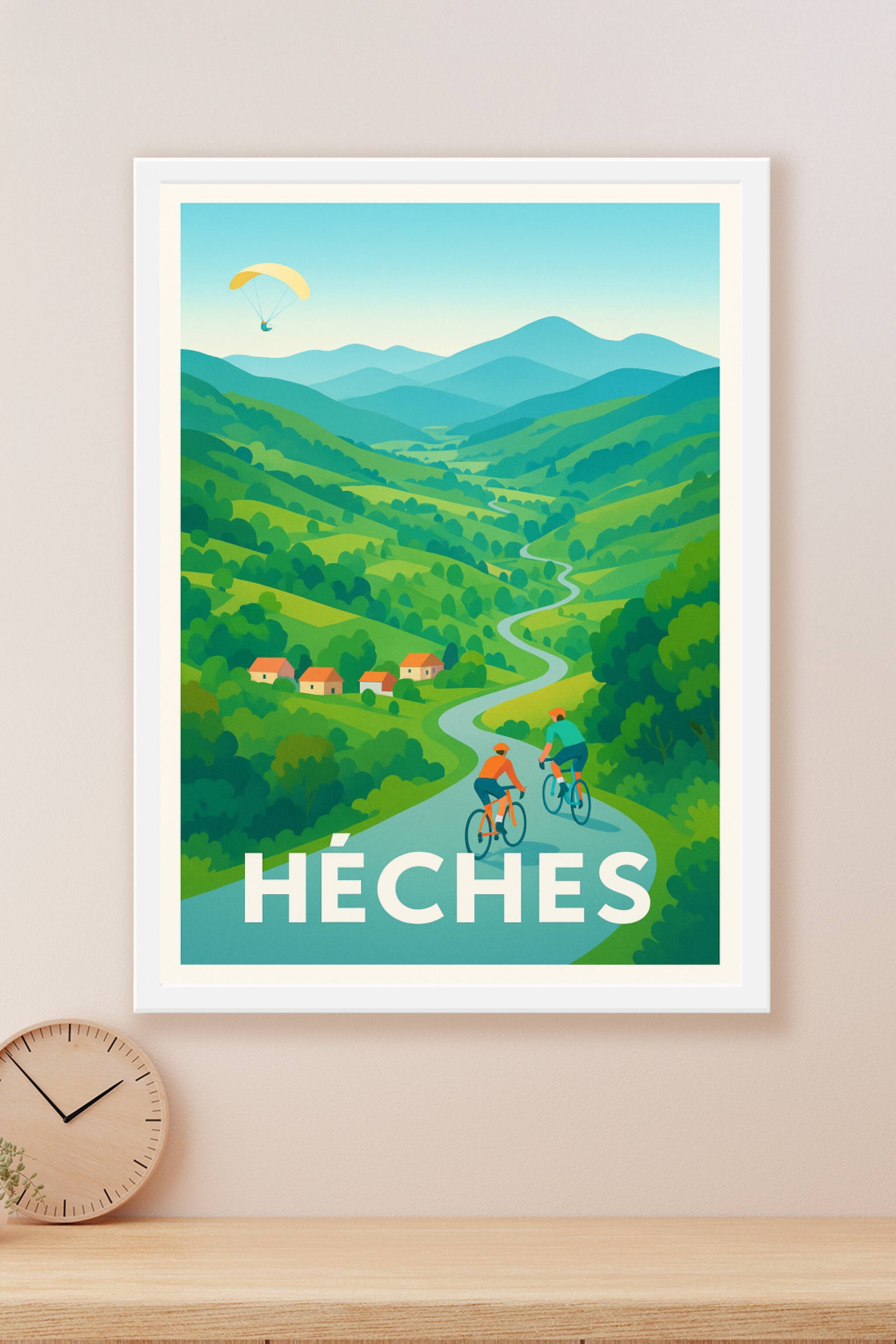 Découvrez la beauté paisible des vallées verdoyantes d'Héches avec cette affiche au style graphique et moderne. Deux cyclistes parcourent une route...