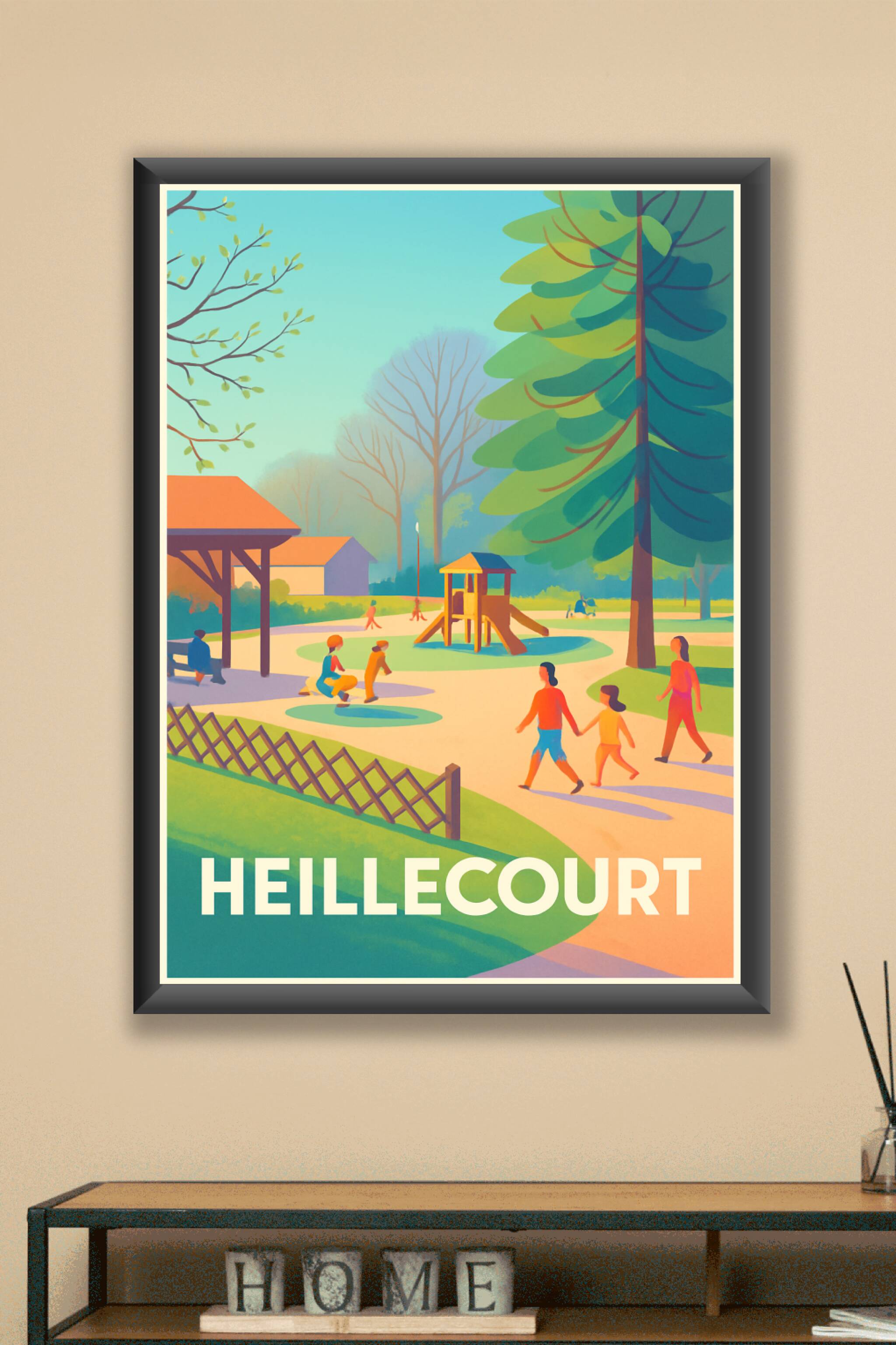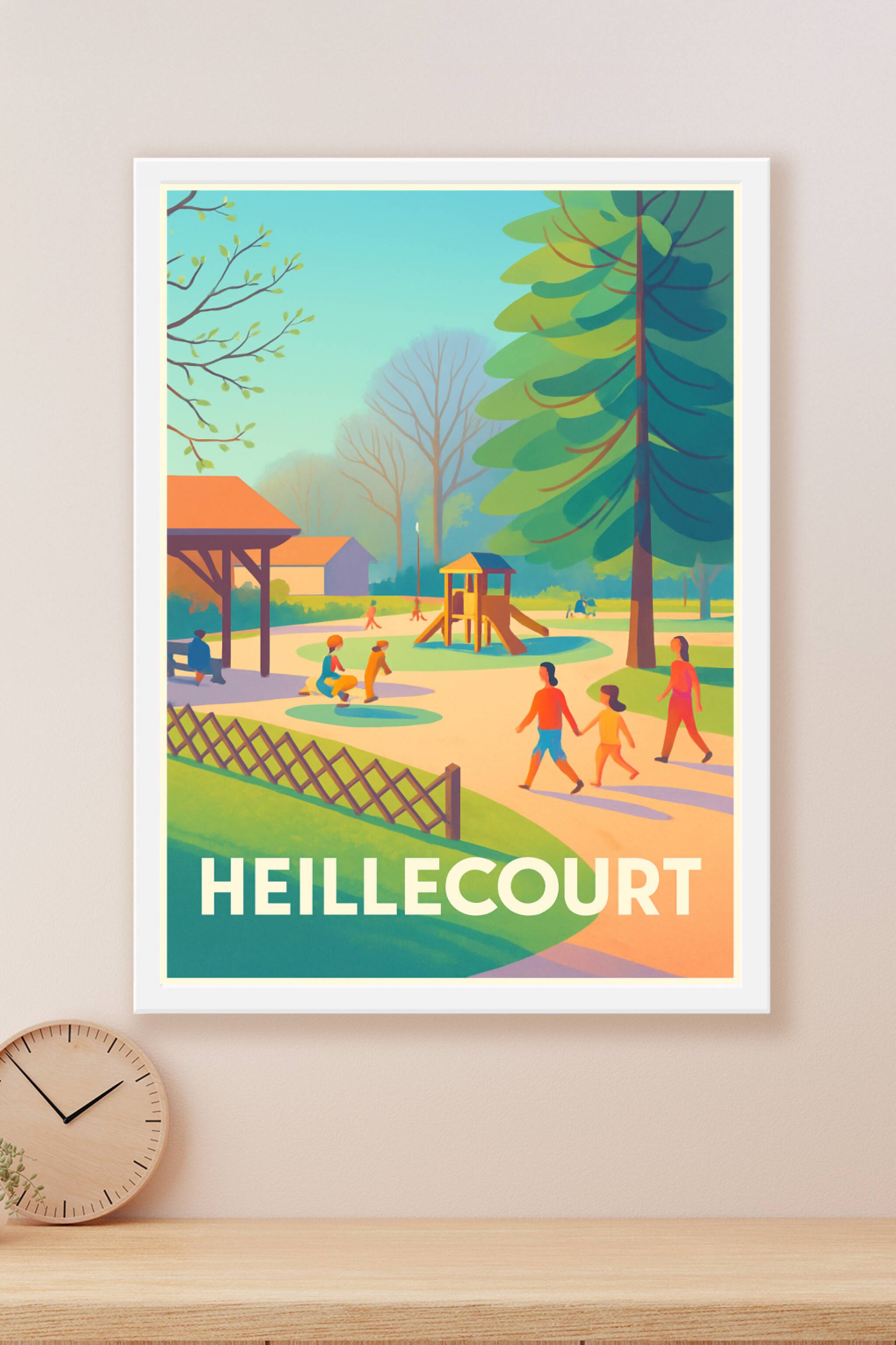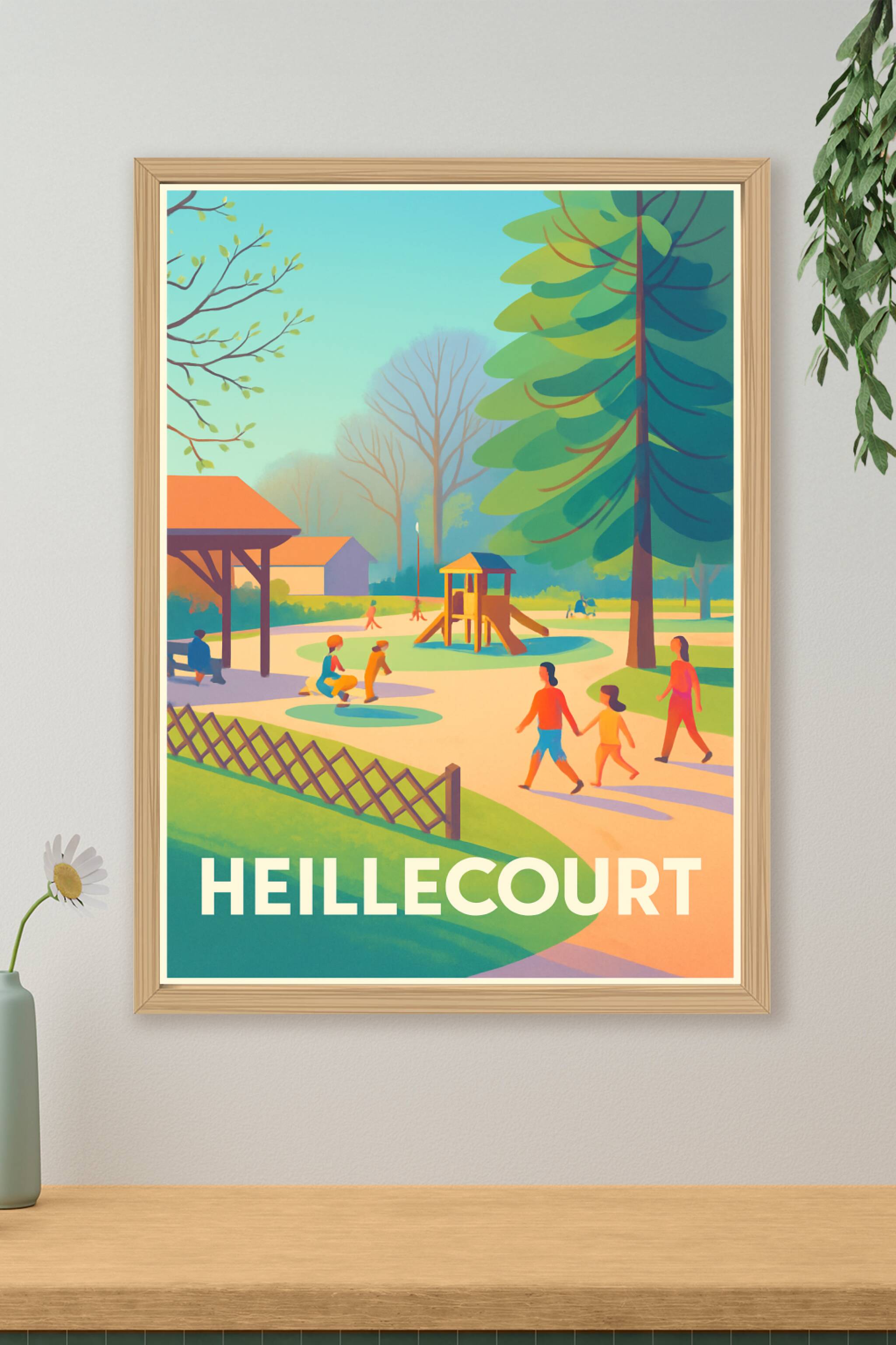 Découvrez la douceur de vivre à Heillecourt avec cette affiche colorée représentant un parc paisible où familles et enfants profitent d'un moment d...