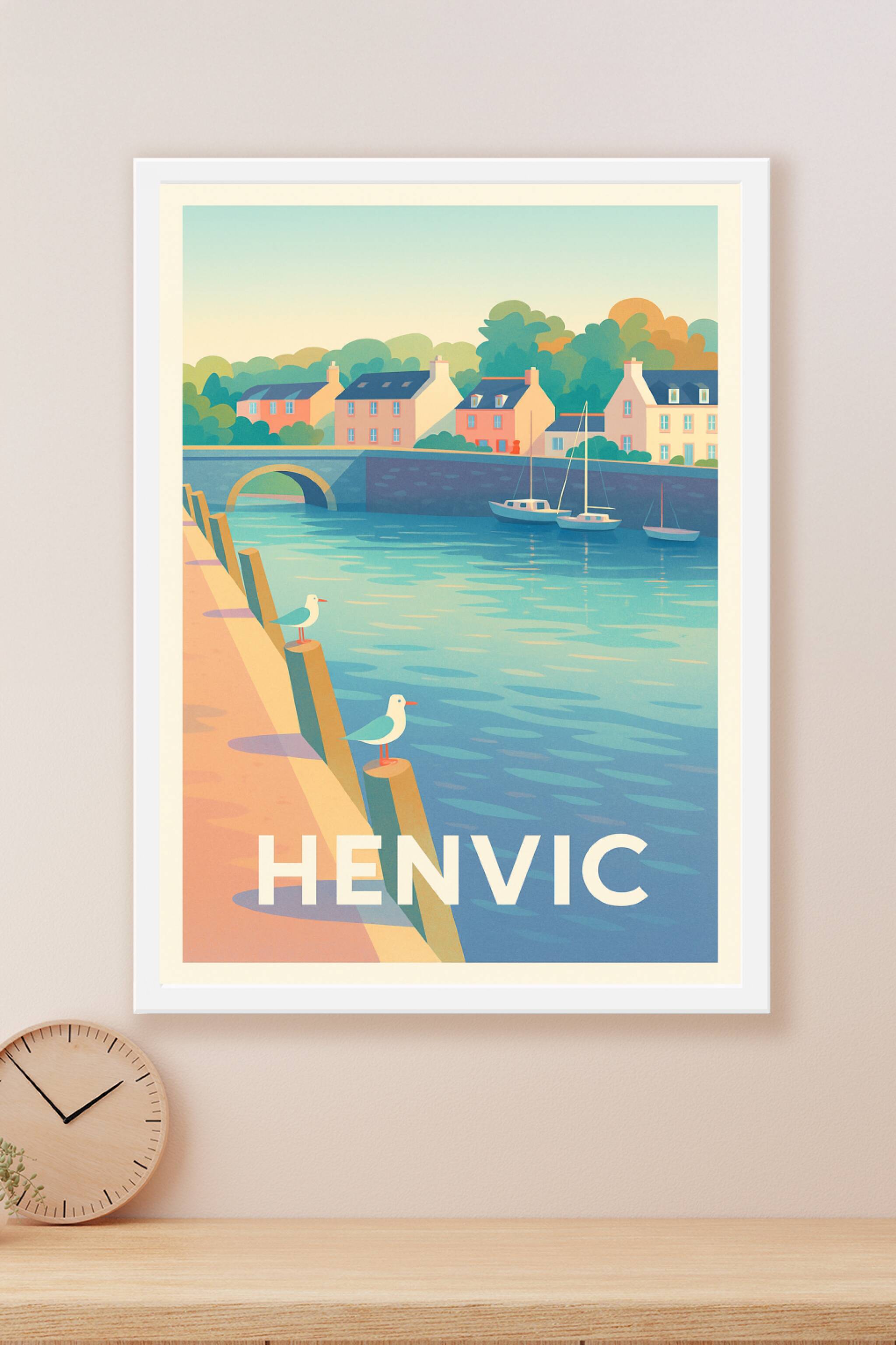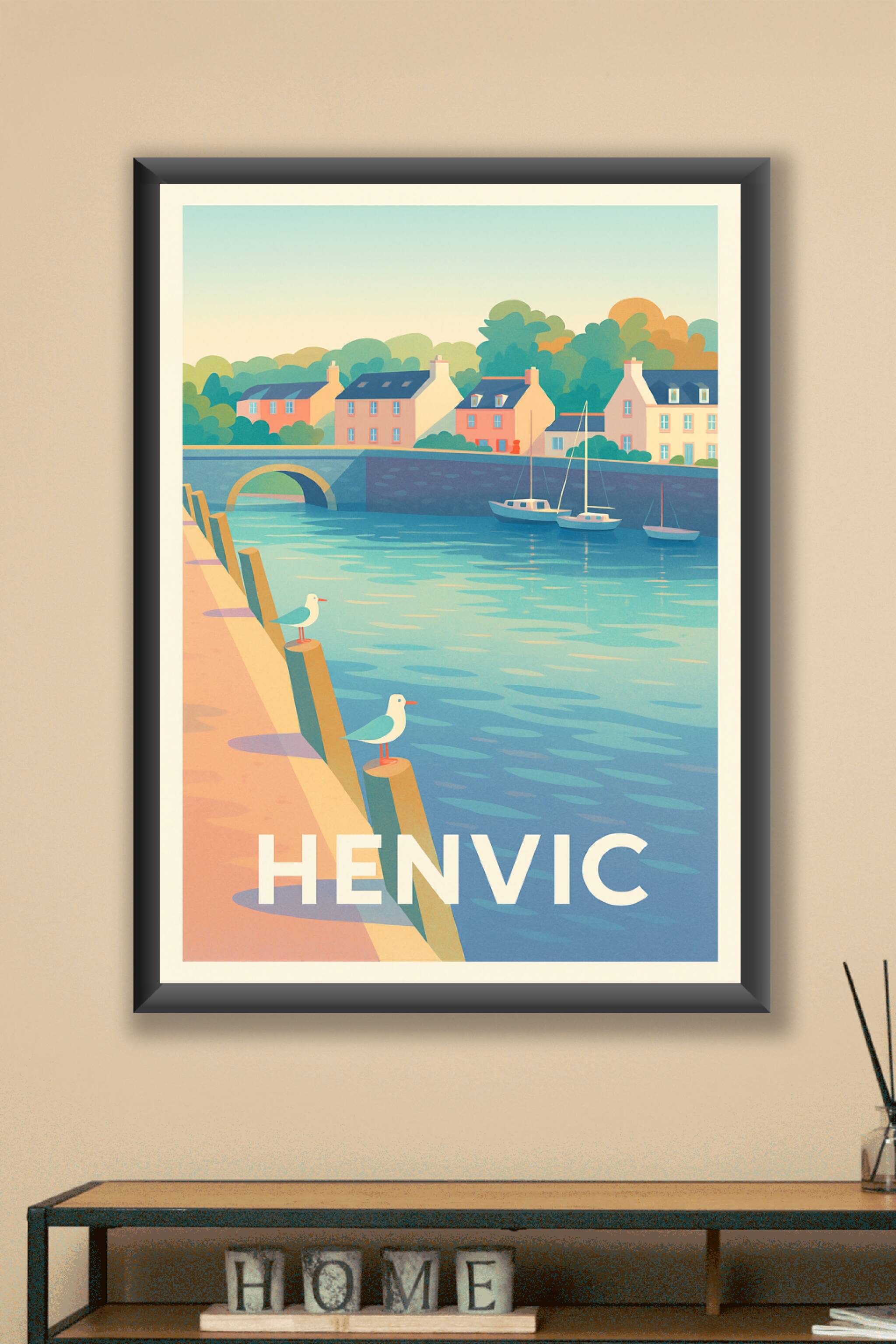 Découvrez la douce tranquillité de Henvic avec cette affiche illustrée mettant en scène un charmant quai bordé de mouettes et de voiliers paisibles...