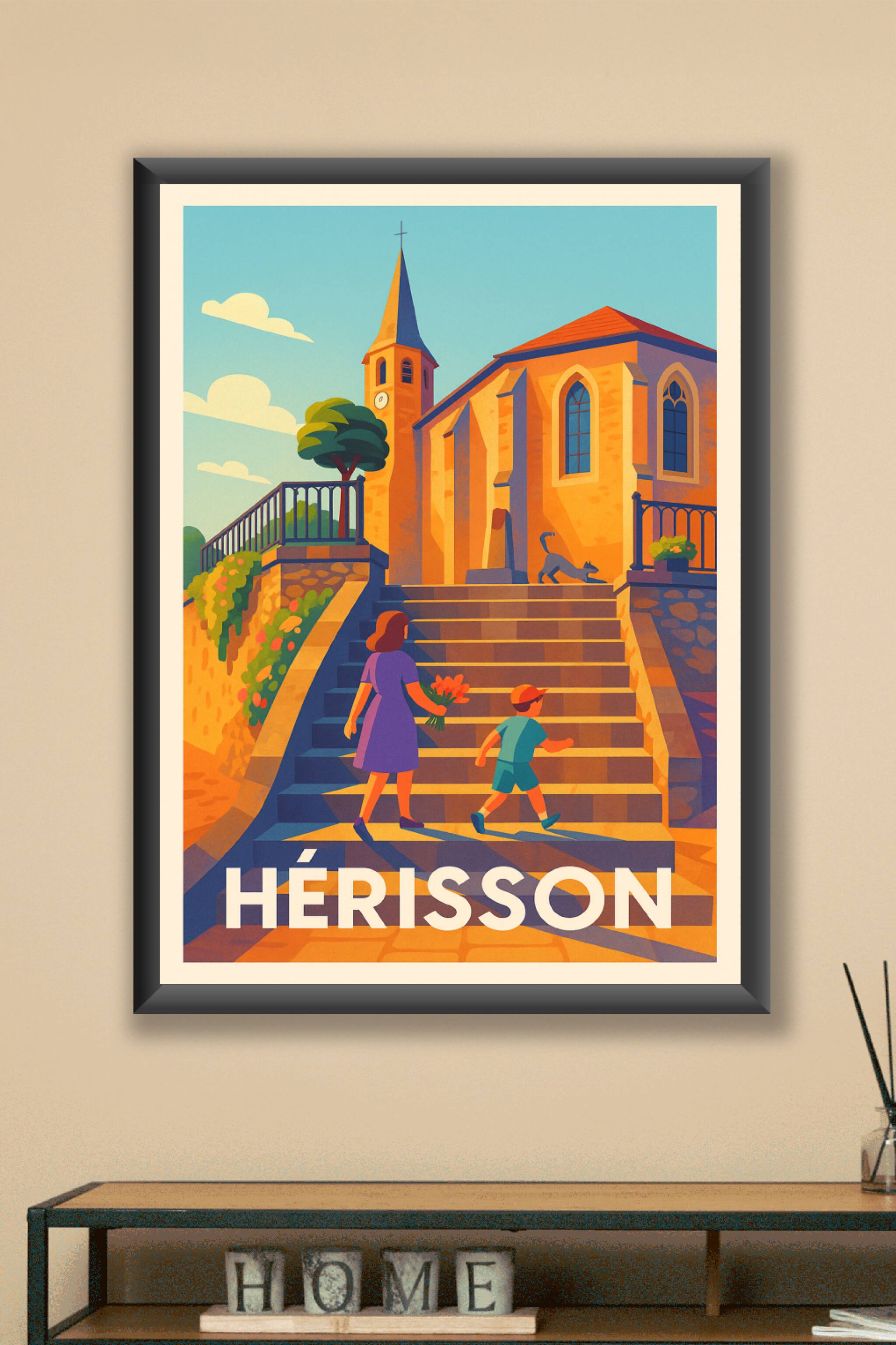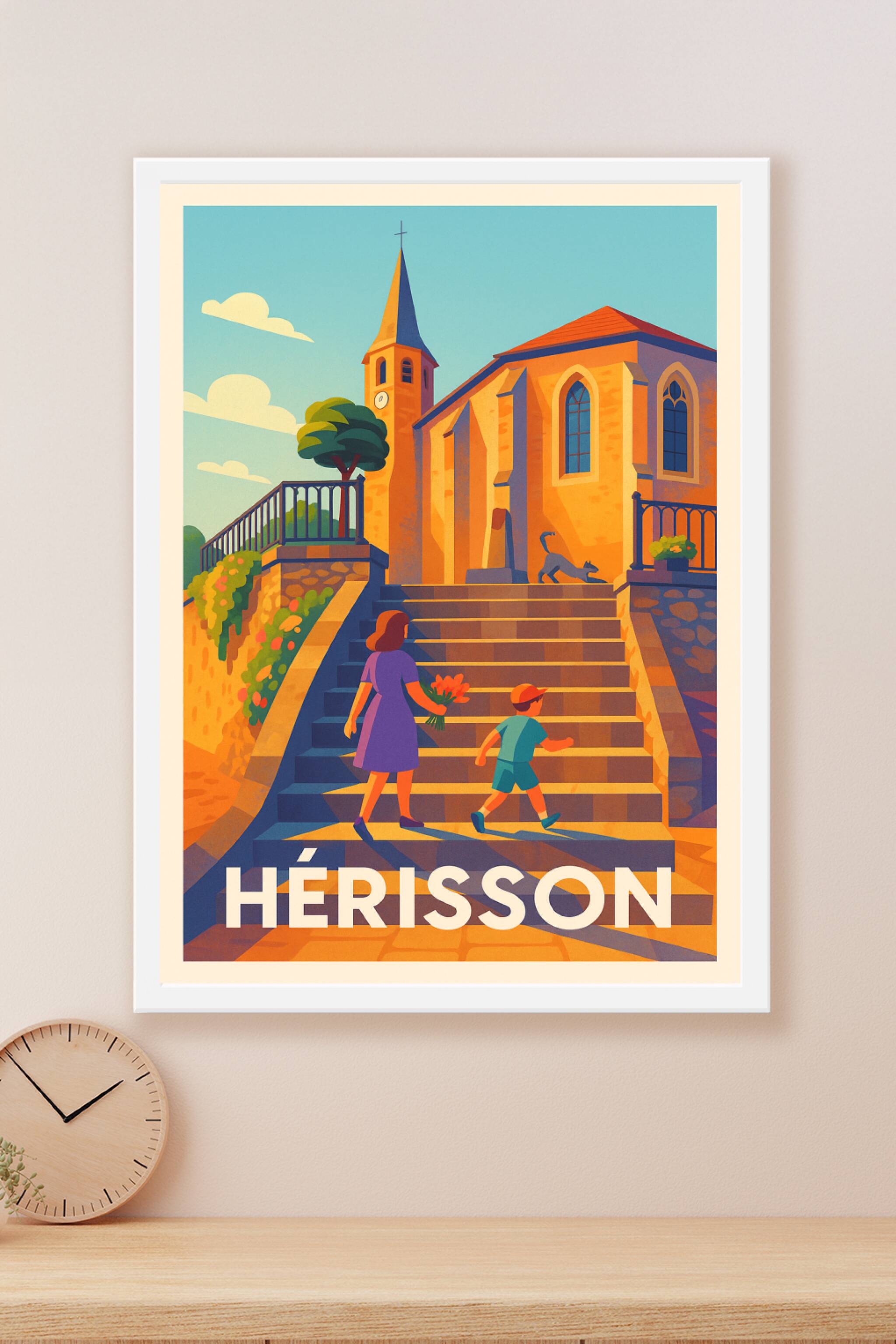 Découvrez la douce ambiance provençale d'Hérisson avec cette affiche aux couleurs chaudes et au style illustratif vintage. Cette scène paisible, représentant une mère et son enfant gravissant les marches face à l'église du village, évoque la beauté et la sérénité de cette charmante commune. Ce poster est imprimé en tirage "Fine Art" sur papier 305g coton garantissant une qualité d'impression exceptionnelle et des couleurs vibrantes, parfait pour embellir votre intérieur. Disponible en formats A1 à A4, avec ou sans cadre, cette affiche est une invitation à un voyage nostalgique et intime, idéale pour les amoureux de l'art et du patrimoine français. Profitez d'une fabrication 100% française pour un rendu haut de gamme qui sublimera votre décoration.