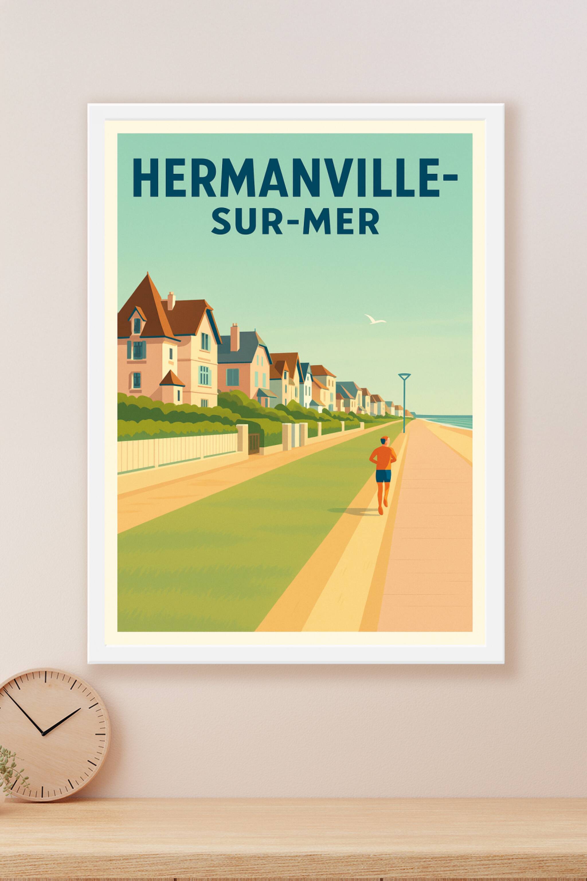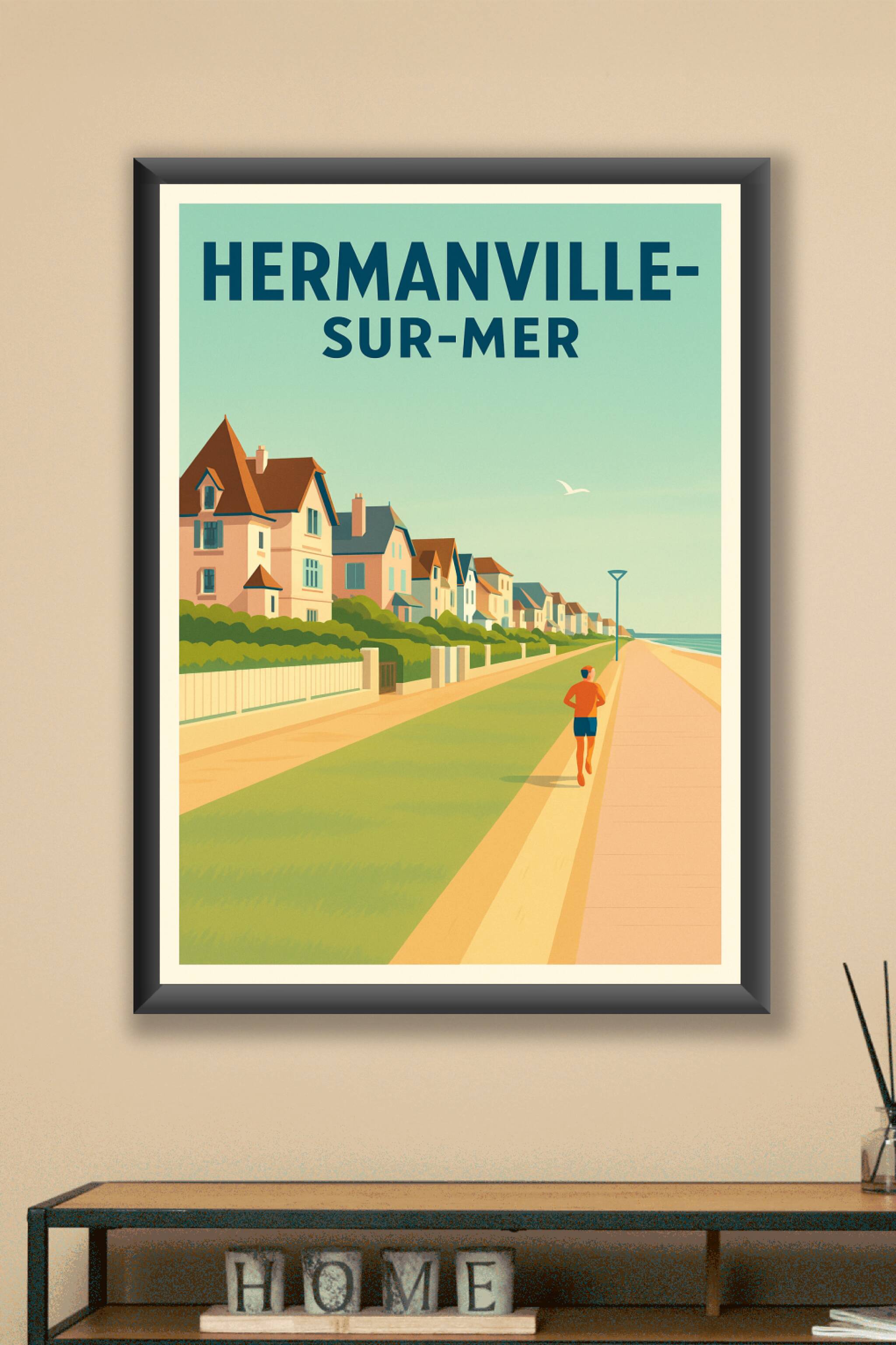 Découvrez le charme paisible d'Hermanville-sur-Mer à travers cette affiche illustrée d'un coureur longeant la promenade ensoleillée face à la mer. ...