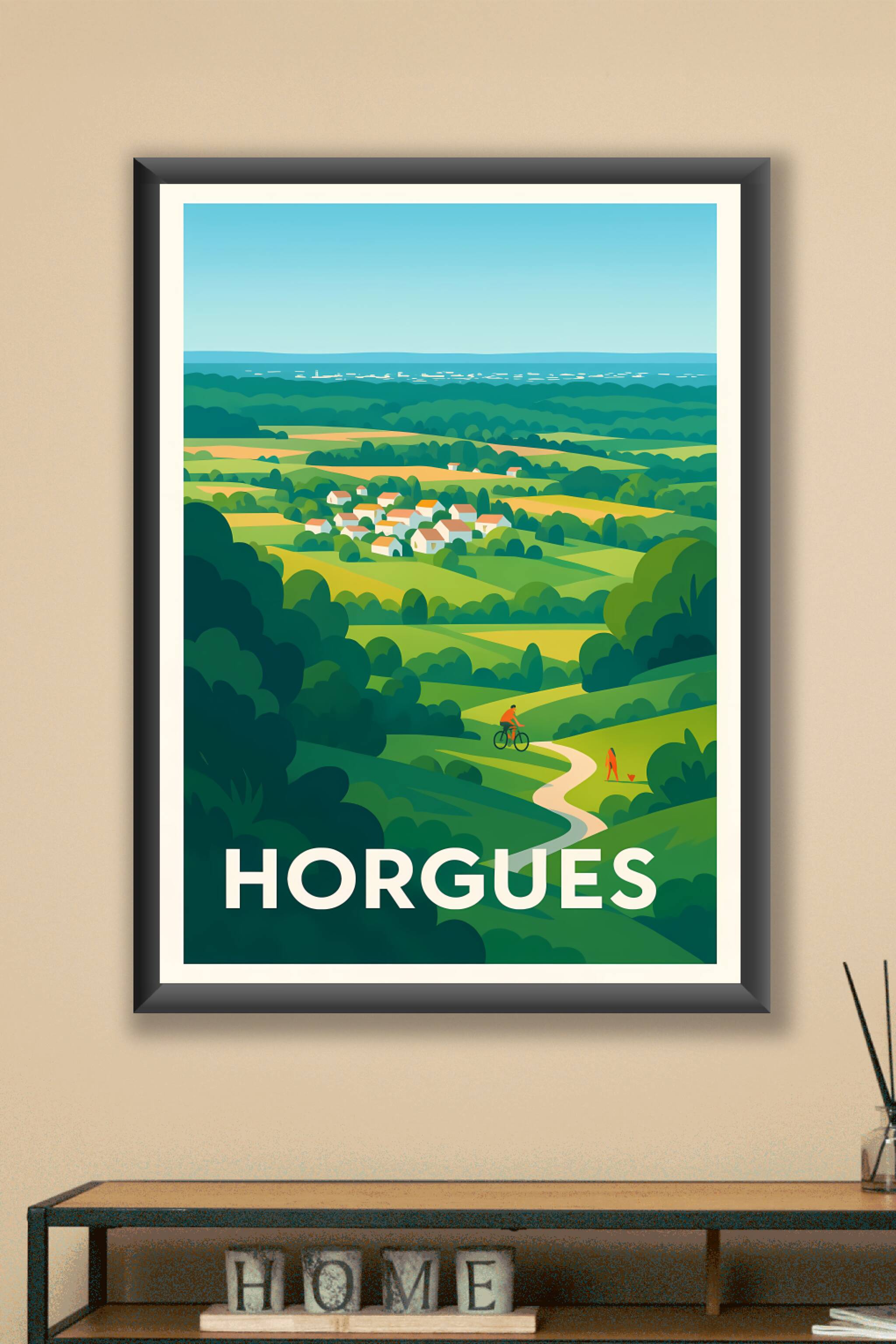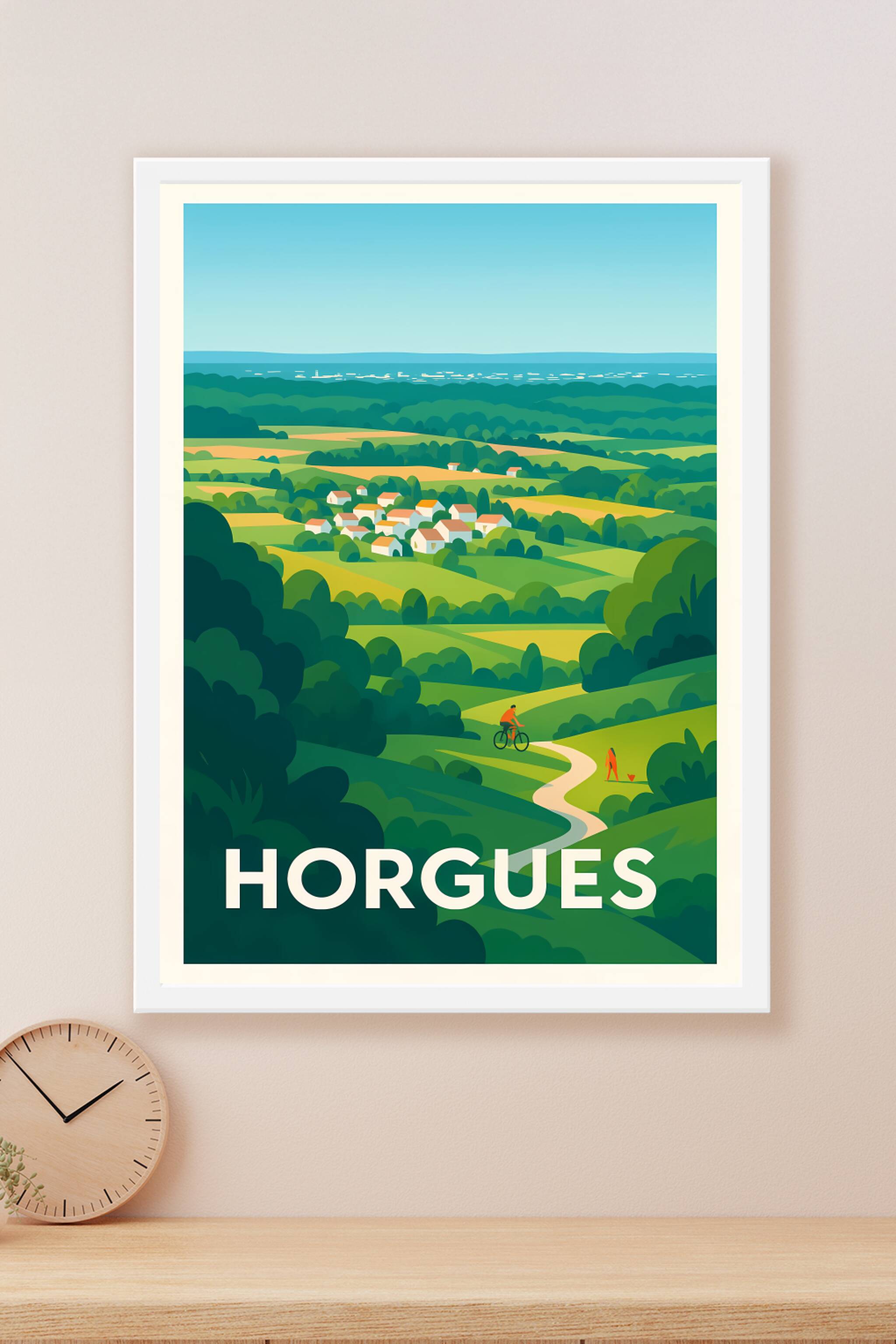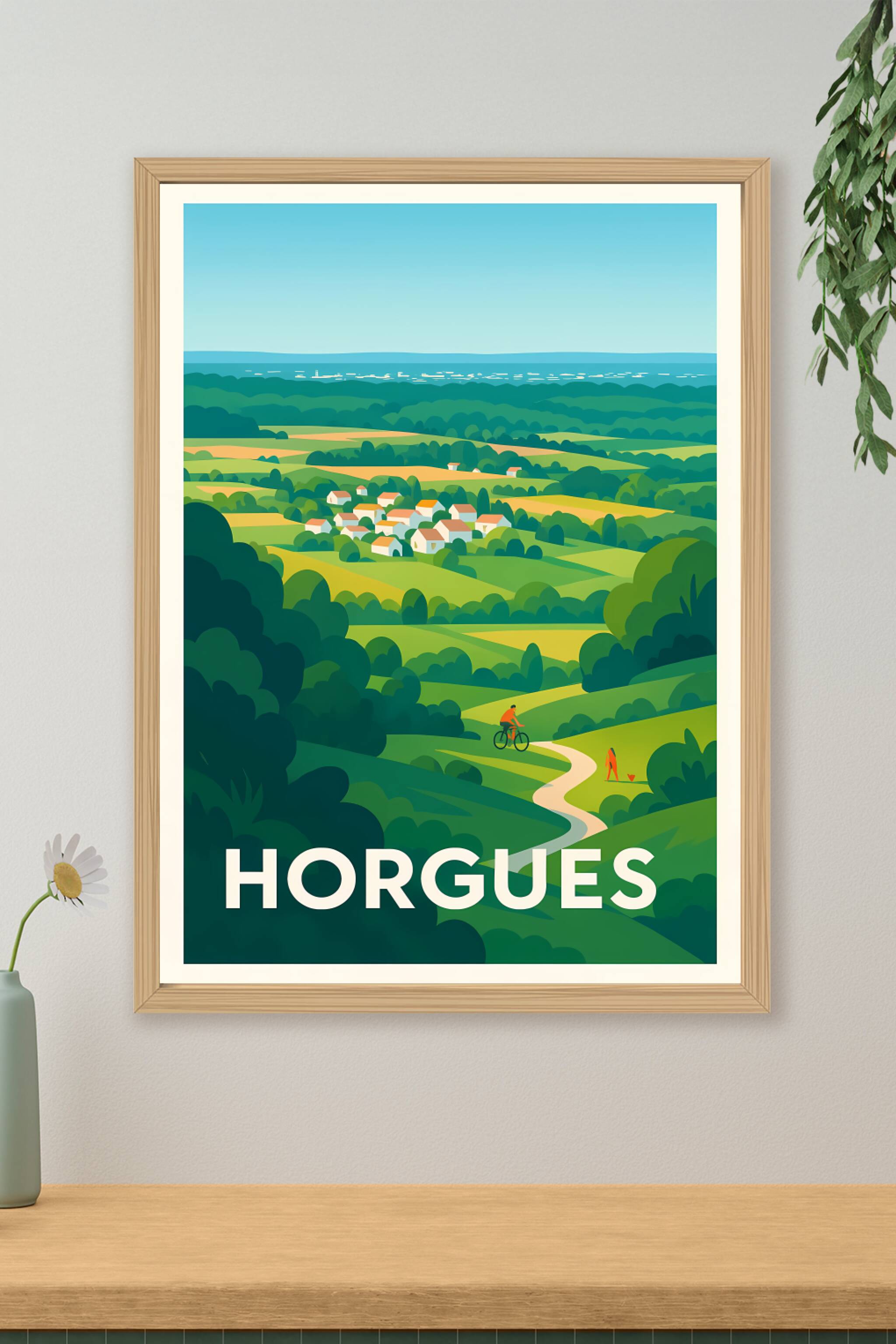 Laissez-vous séduire par cette affiche illustrée, qui dépeint avec douceur et couleurs vibrantes les paysages verdoyants d'Horgues, village paisibl...