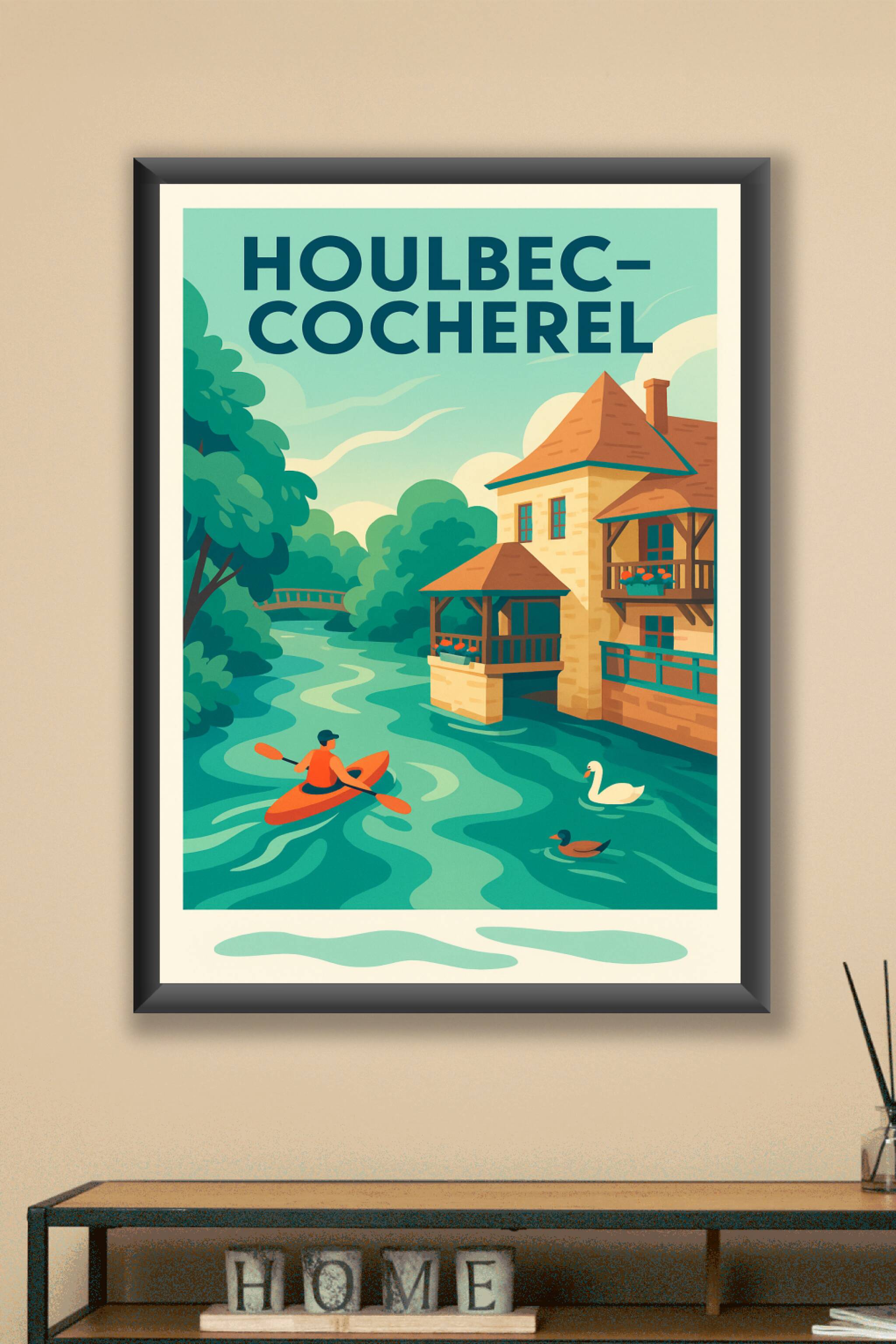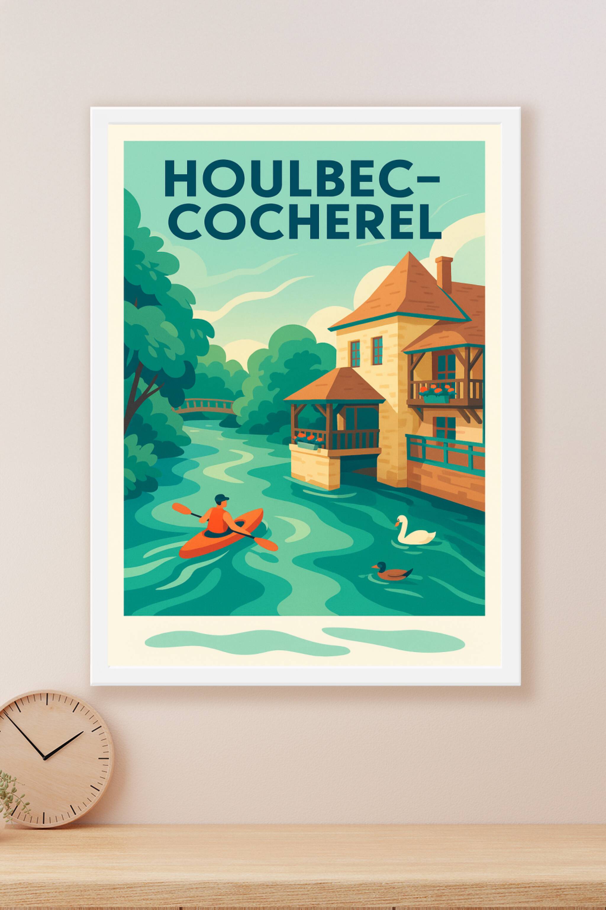 Découvrez le charme bucolique de Houlbec-Cocherel à travers cette magnifique affiche illustrée mettant en scène un kayakiste naviguant sur une rivi...