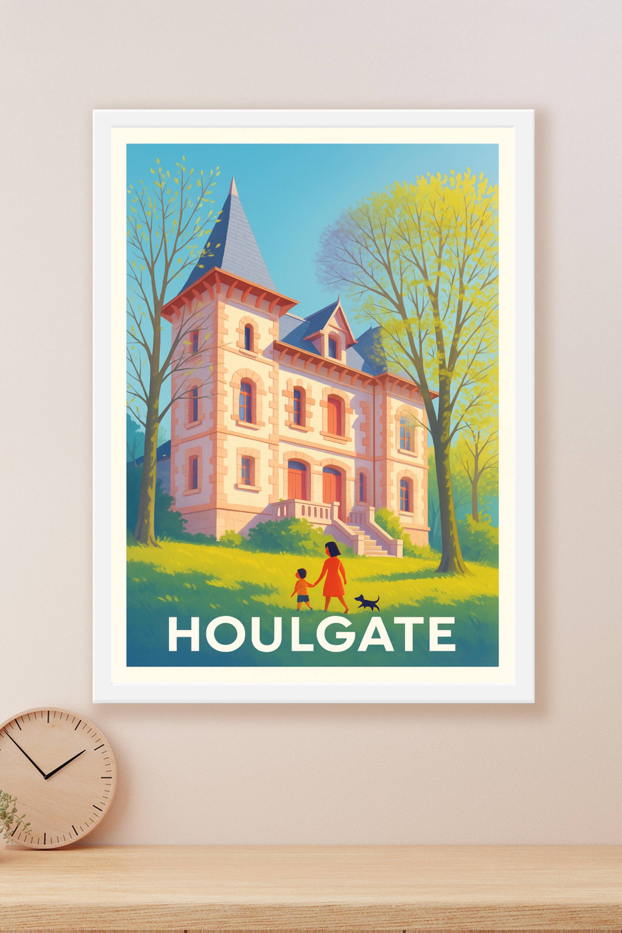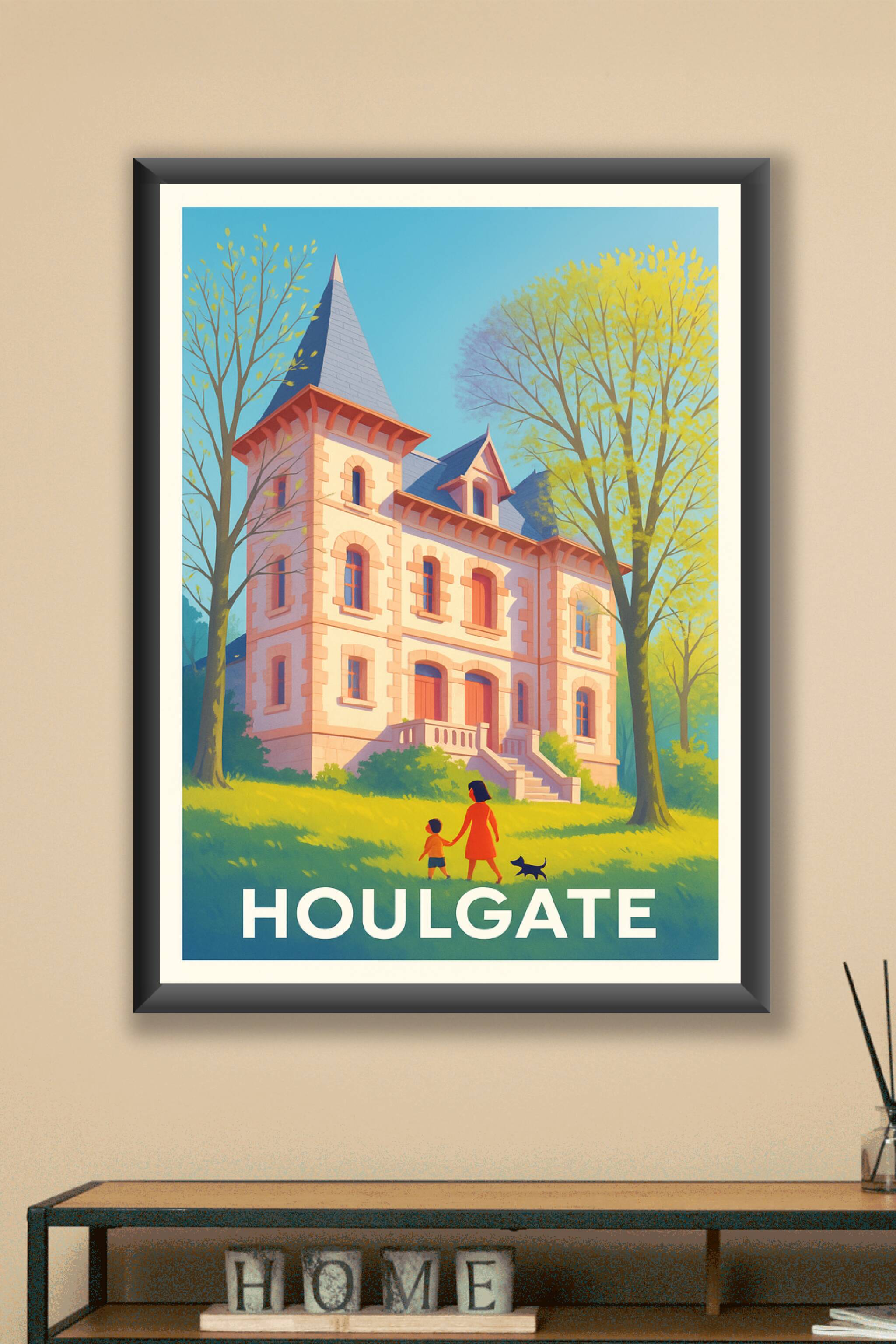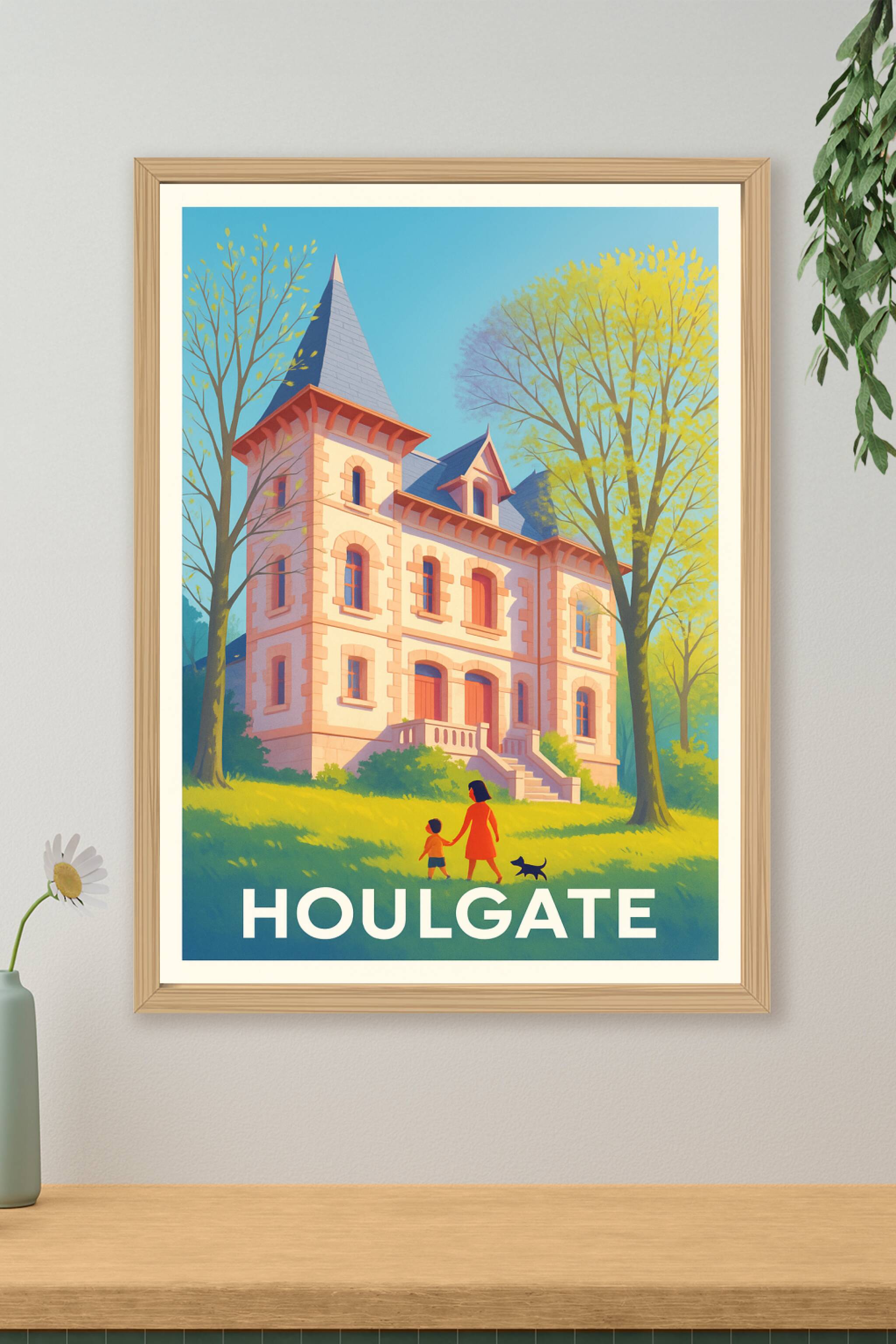 Découvrez le charme paisible de Houlgate avec cette affiche illustrée, mettant en scène une demeure élégante baignée par la lumière douce du soleil...