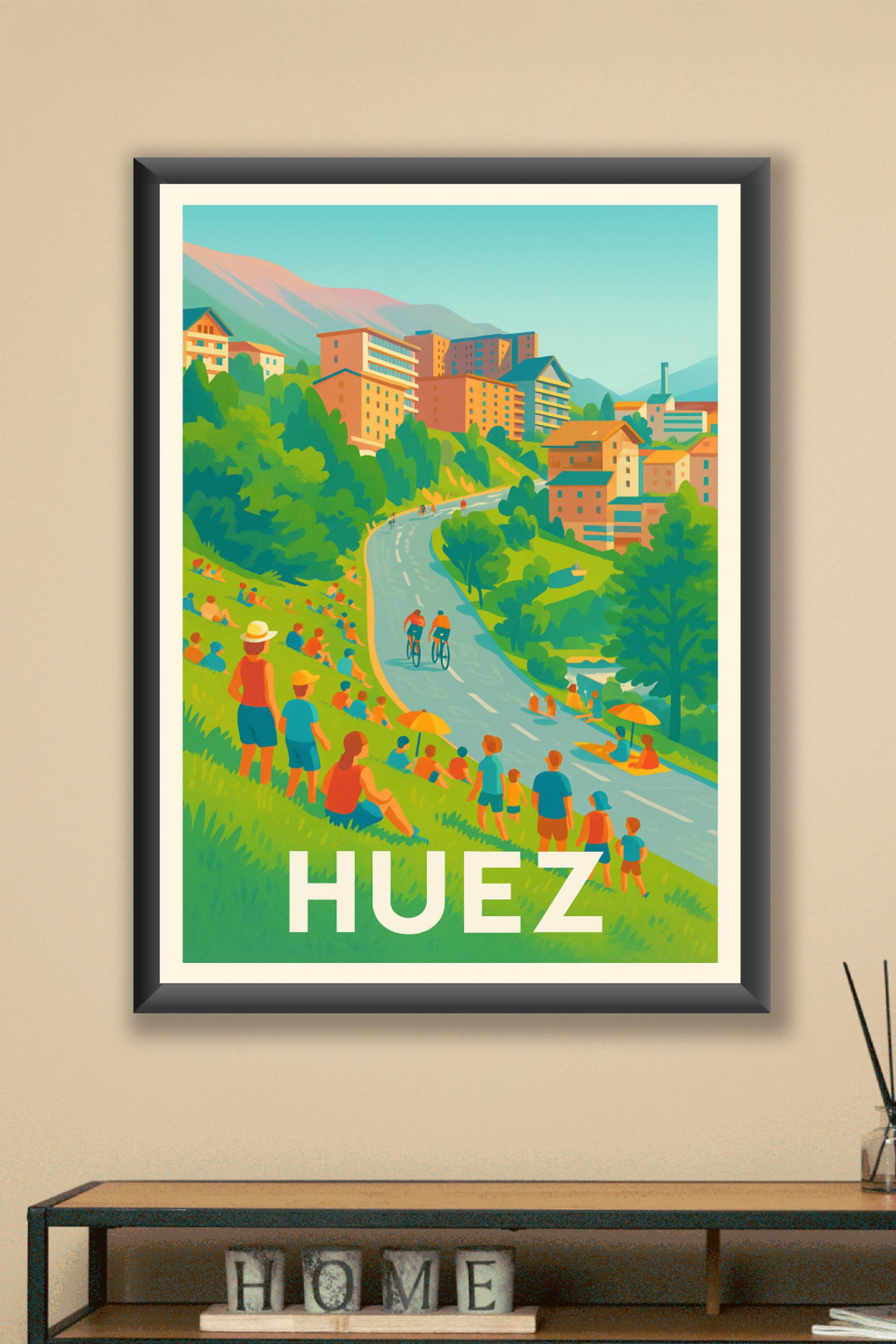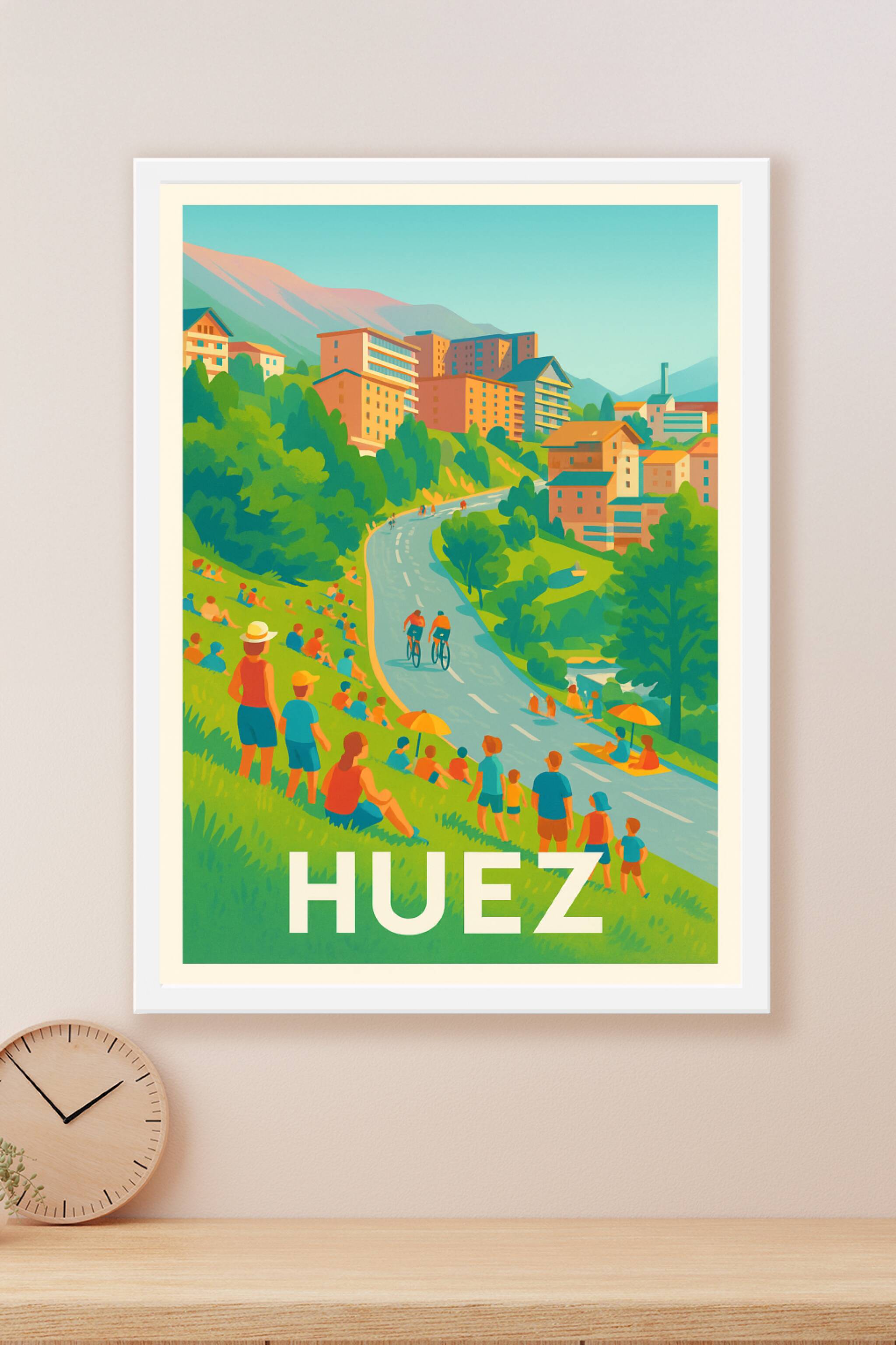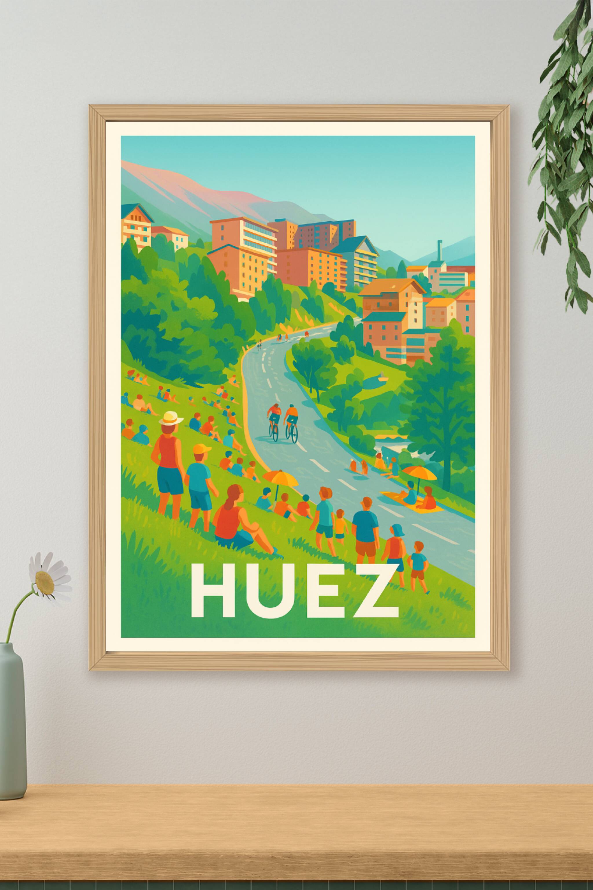 Découvrez l’effervescence estivale de l'Alpe d'Huez avec cette affiche colorée et vivante qui capture l’esprit des journées ensoleillées au pied des montagnes. Le poster met en scène les cyclistes sur la célèbre route, entourés par une foule qui profite de la nature et des paysages alpins. Imprimée en tirage "Fine Art" sur papier 305g coton, cette affiche garantit une qualité d'impression exceptionnelle et une grande longévité. Disponible du format A1 au format A4, avec ou sans cadre, cette pièce apportera une touche dynamique et chaleureuse à votre décoration intérieure. Offrez-vous un souvenir unique ou un cadeau parfait avec cette création 100% fabriquée en France, idéale pour les amateurs d’aventure et de montagne.