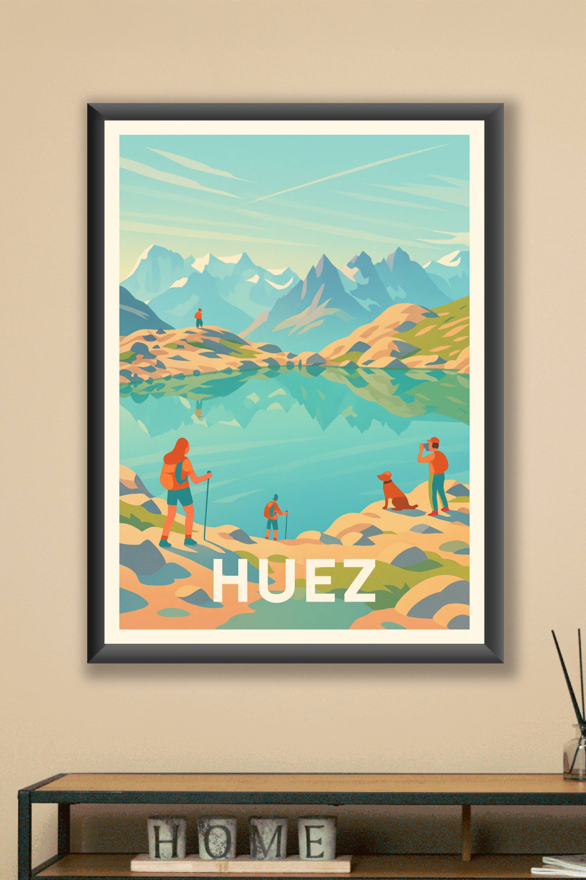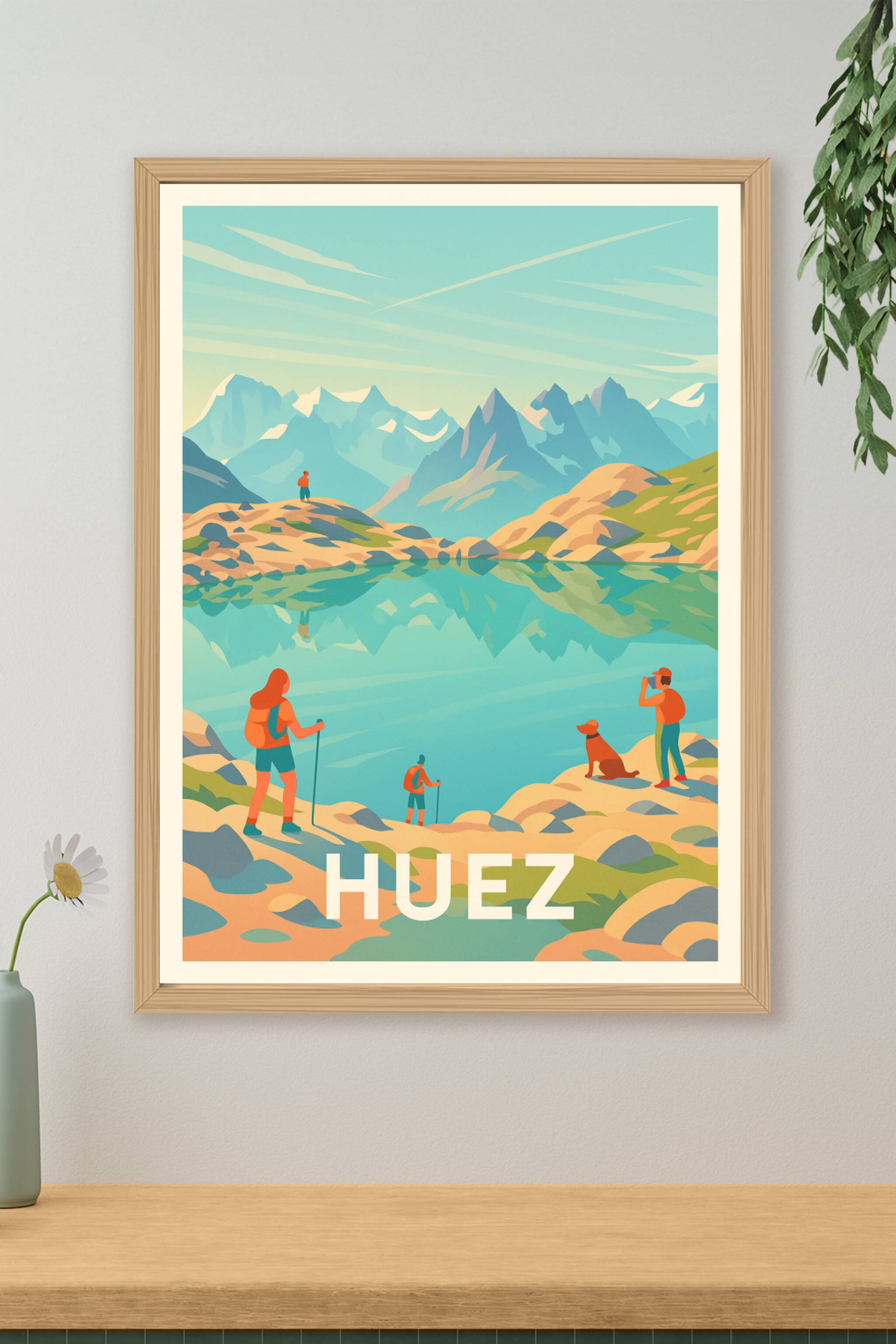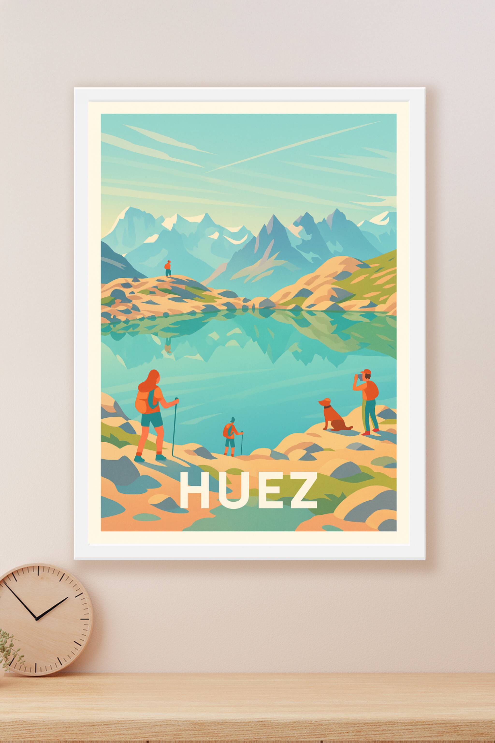 Découvrez la beauté sereine des paysages alpins d'Huez à travers cette affiche au style vintage et épuré. Cette scène de randonnée au bord d'un lac...