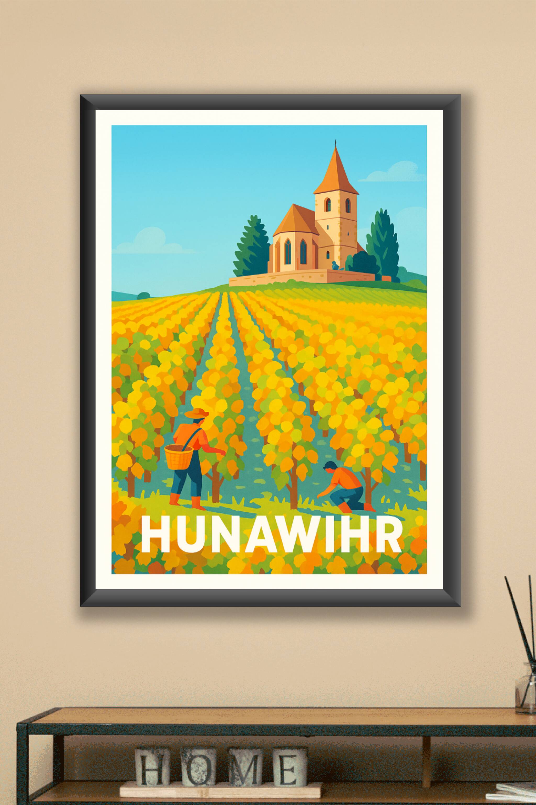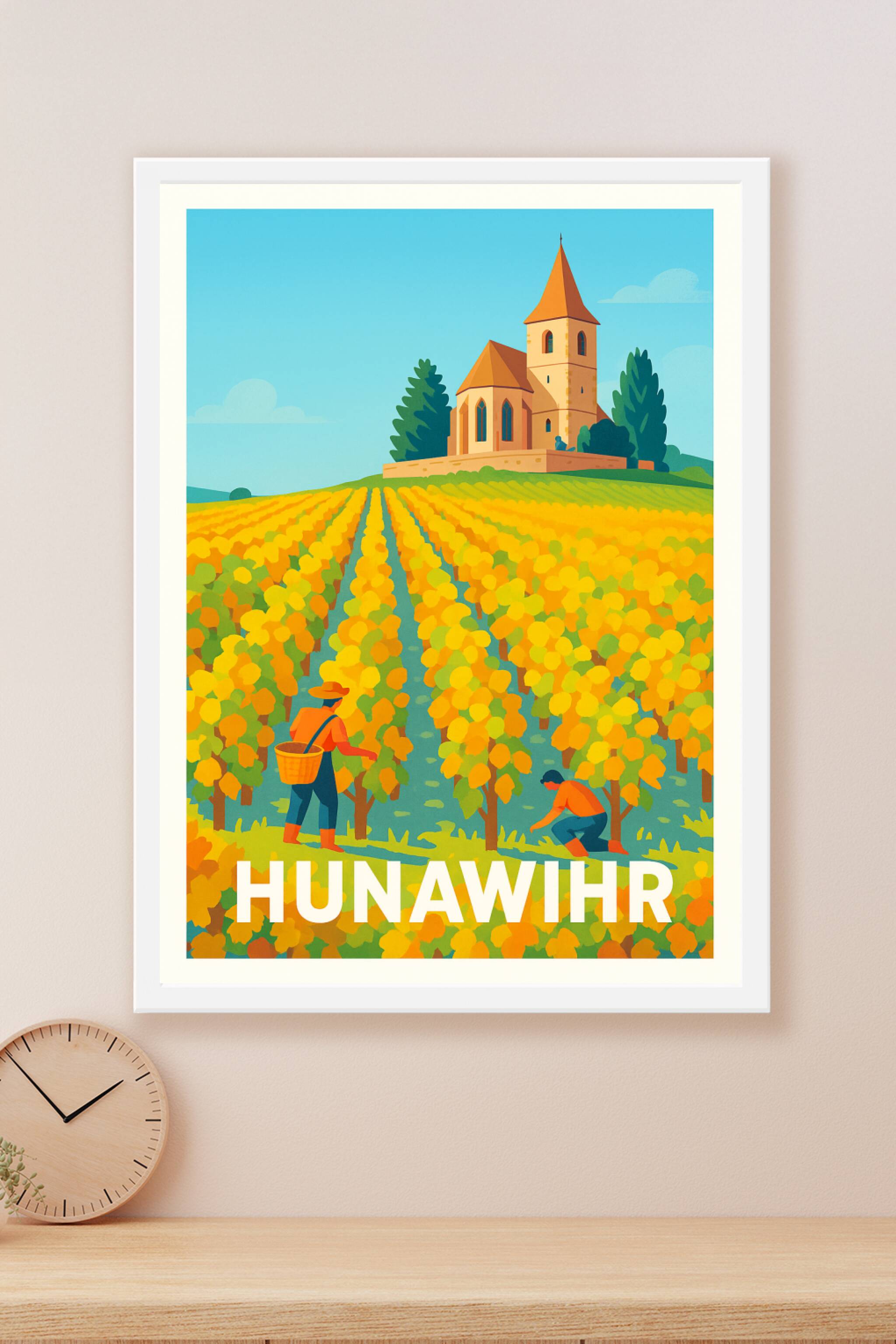 Découvrez l'authenticité d'Hunawihir à travers cette affiche vibrante qui capture un vignoble doré sous un ciel limpide, avec l'église emblématique...