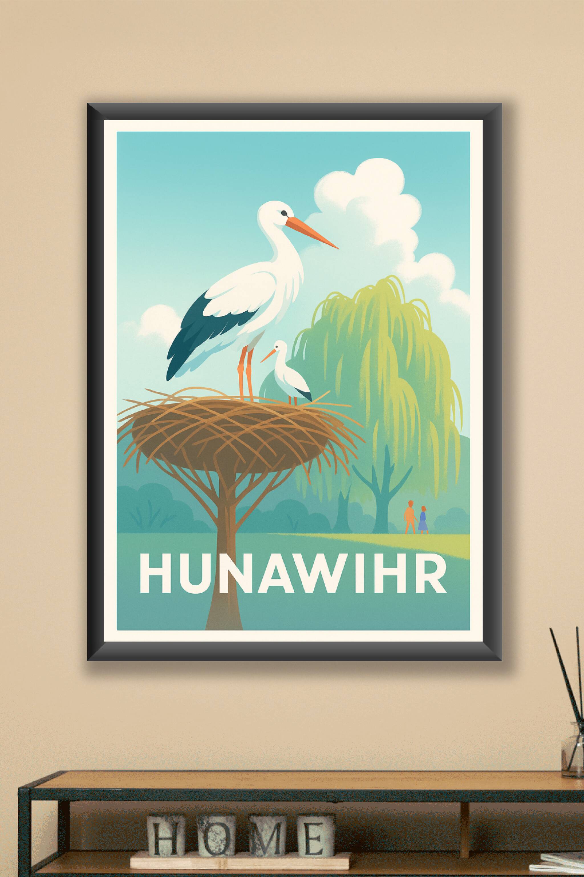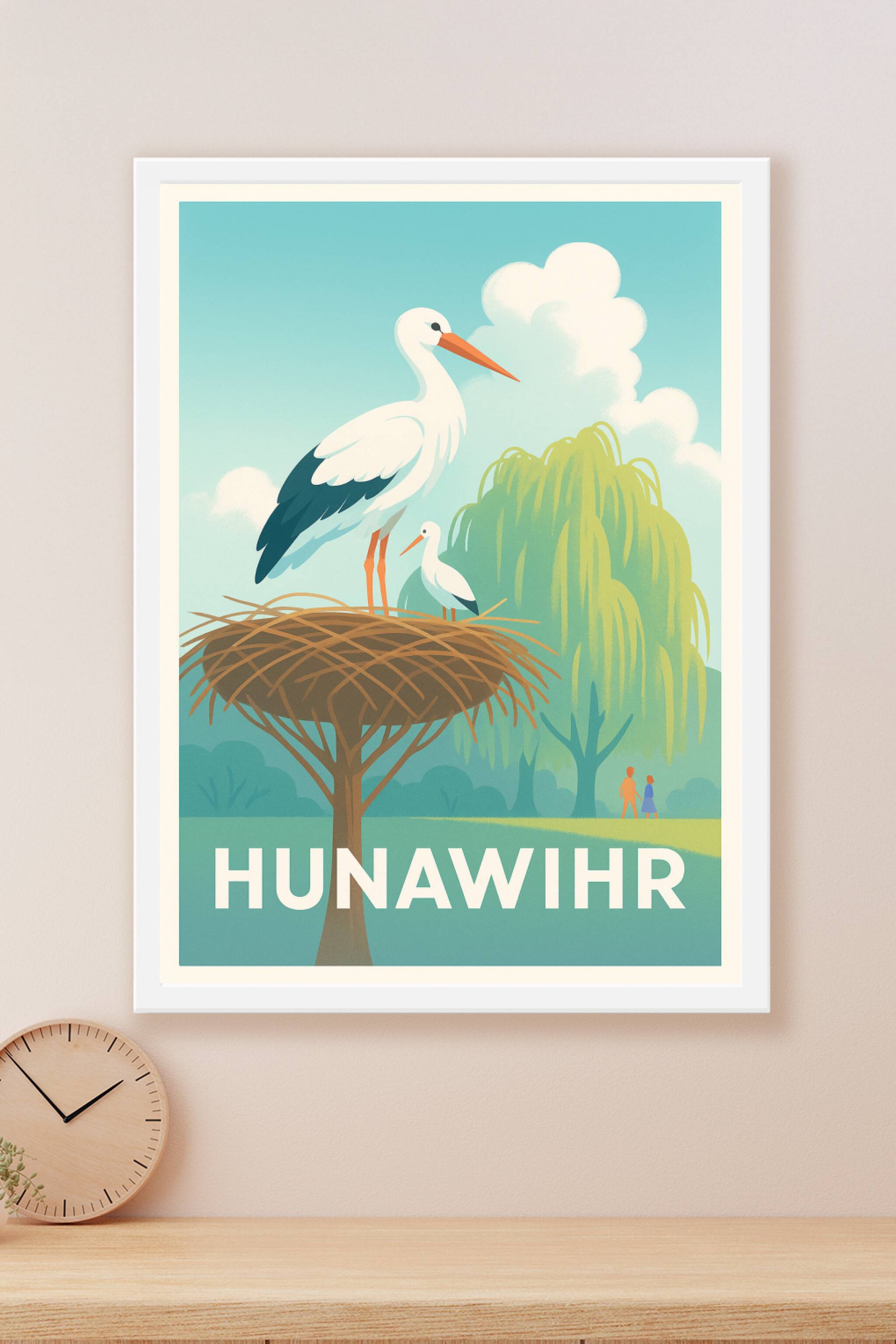 Découvrez la douceur et la quiétude d'Hunawihr à travers cette affiche poétique mettant en scène la célèbre cigogne, symbole régional, perchée sur ...