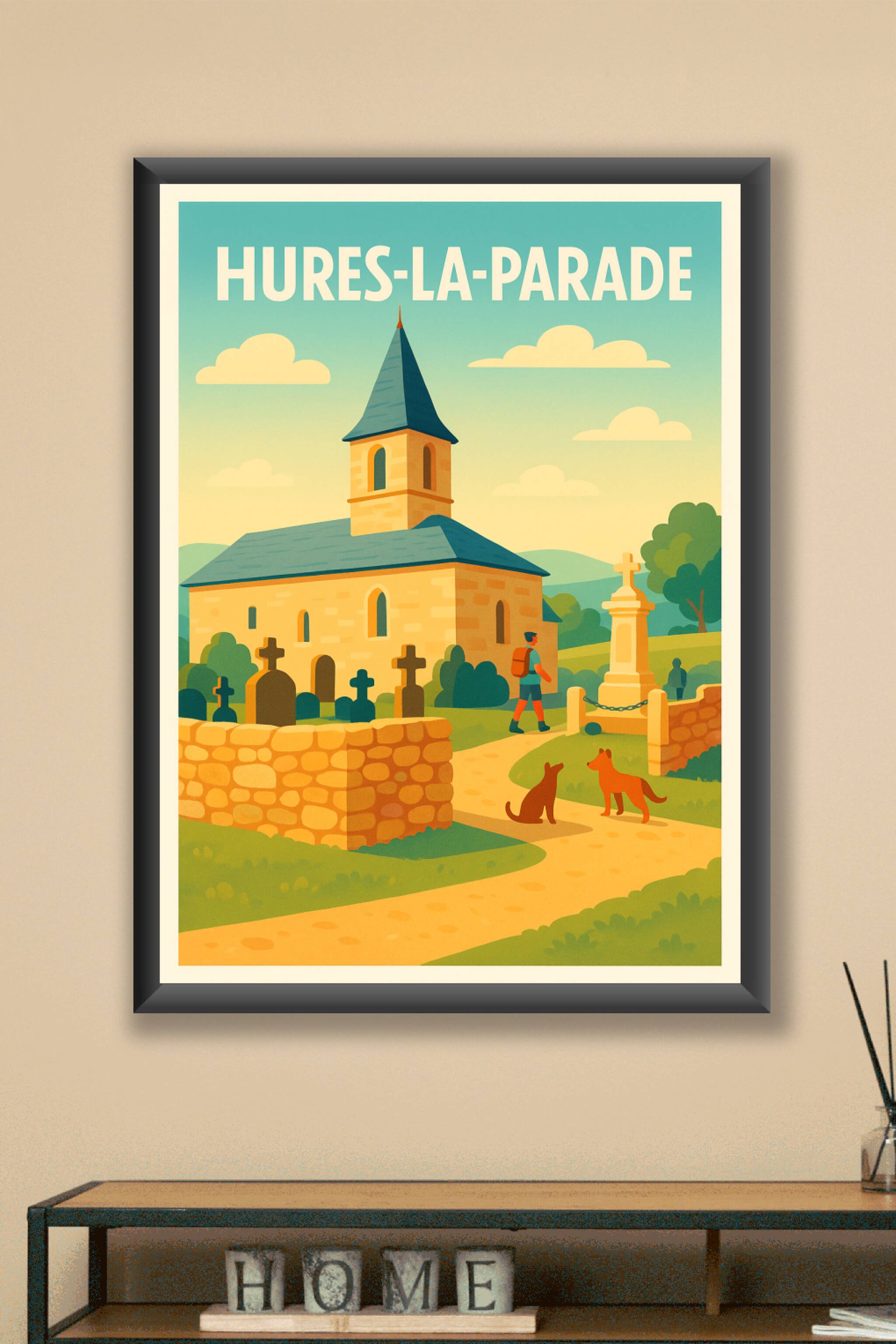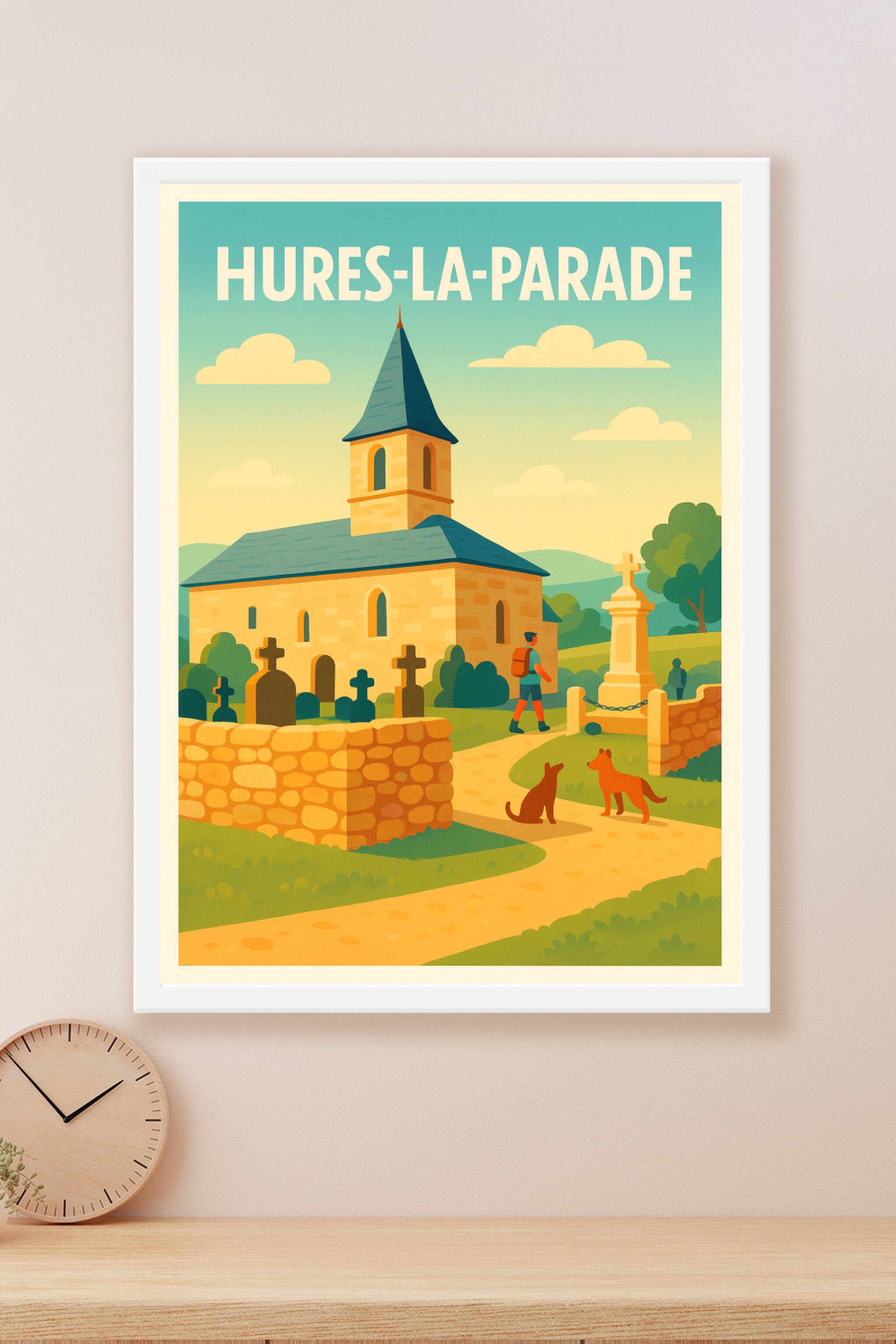 Découvrez le calme et la beauté bucolique de Hures-la-Parade avec cette affiche illustrée dans un style doux et chaleureux. Le poster met en scène ...