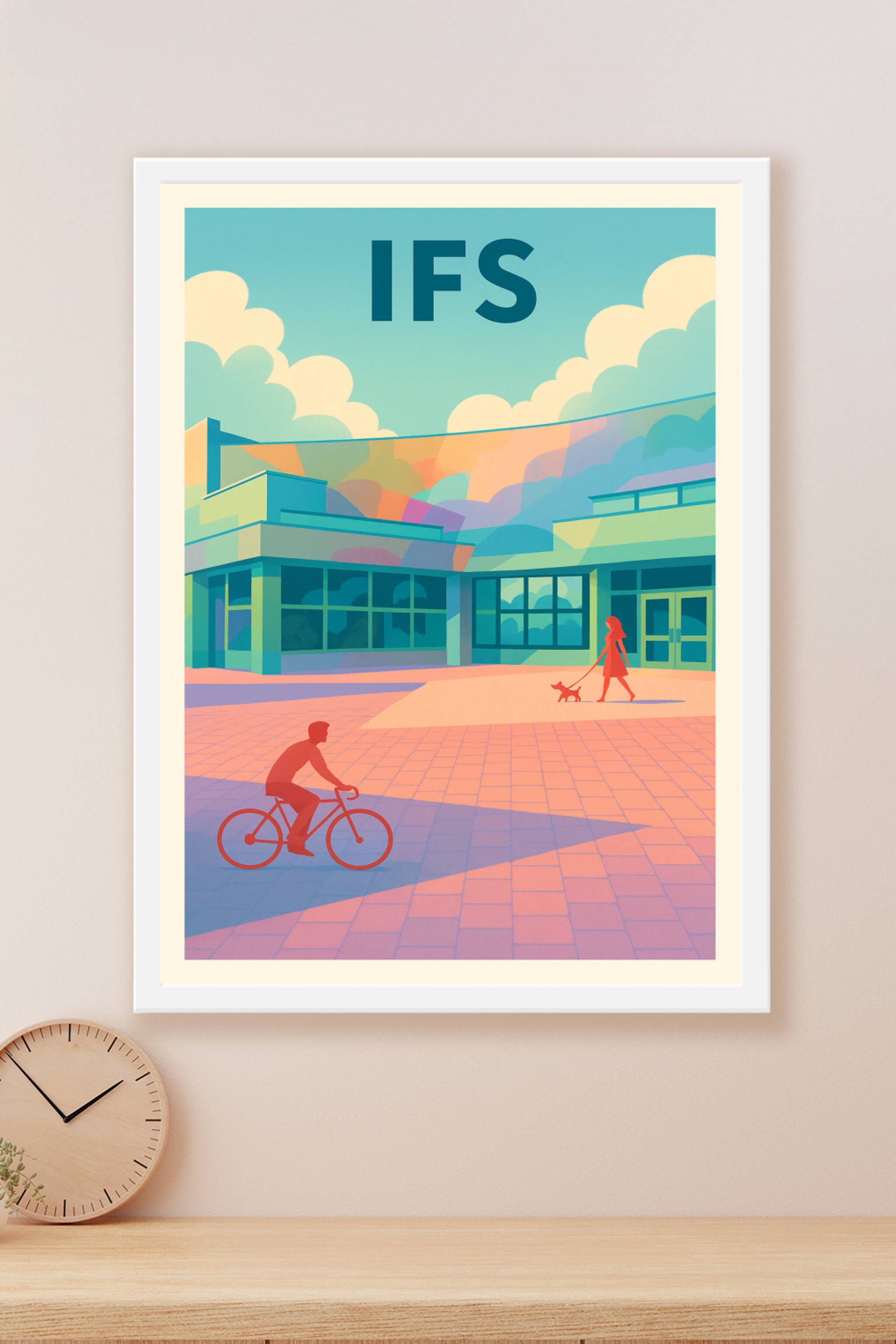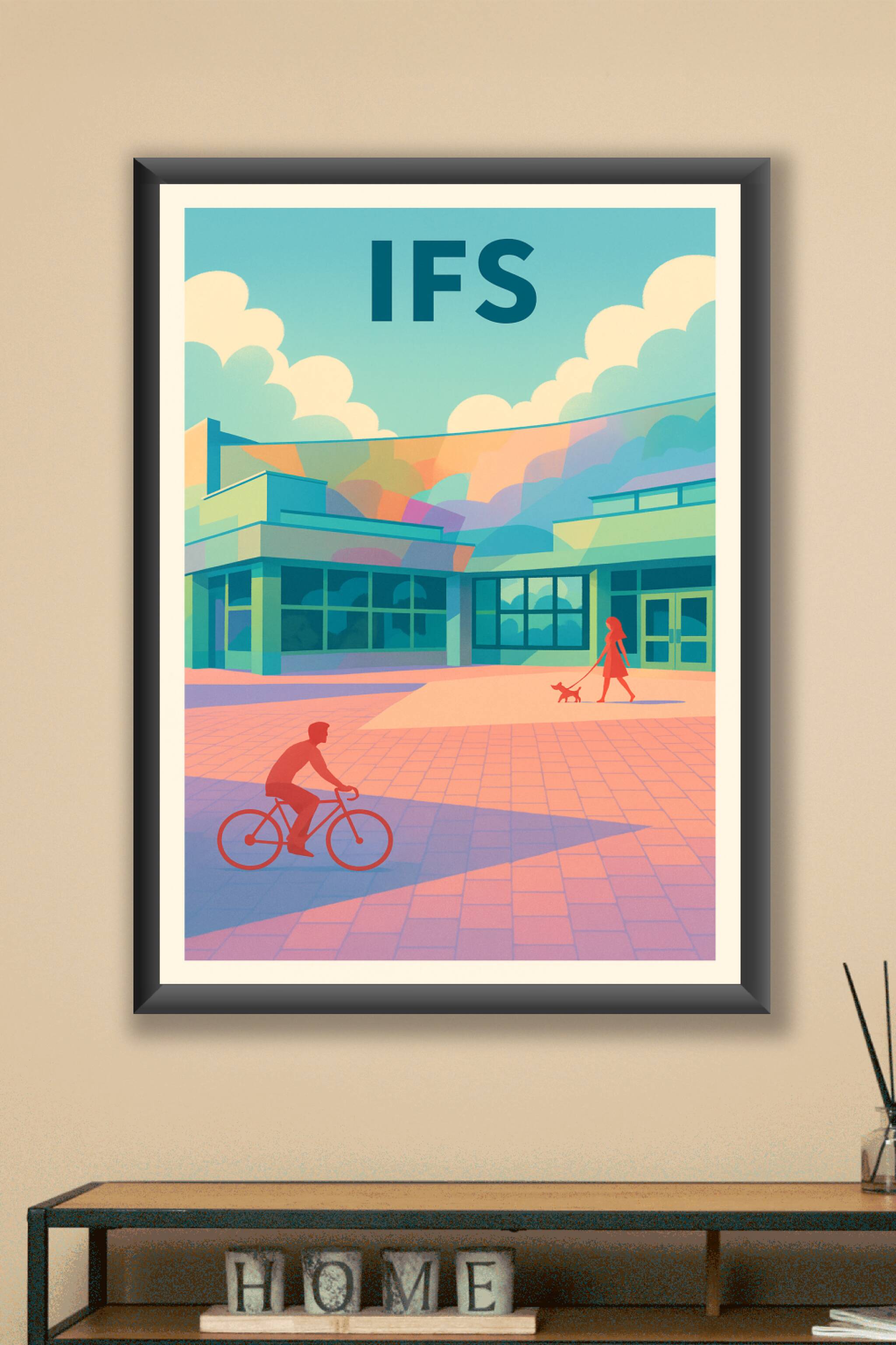 Découvrez cette affiche au style moderne et coloré qui capture l’ambiance sereine d’Ifs, avec ses espaces urbains harmonieux et son quotidien tranq...