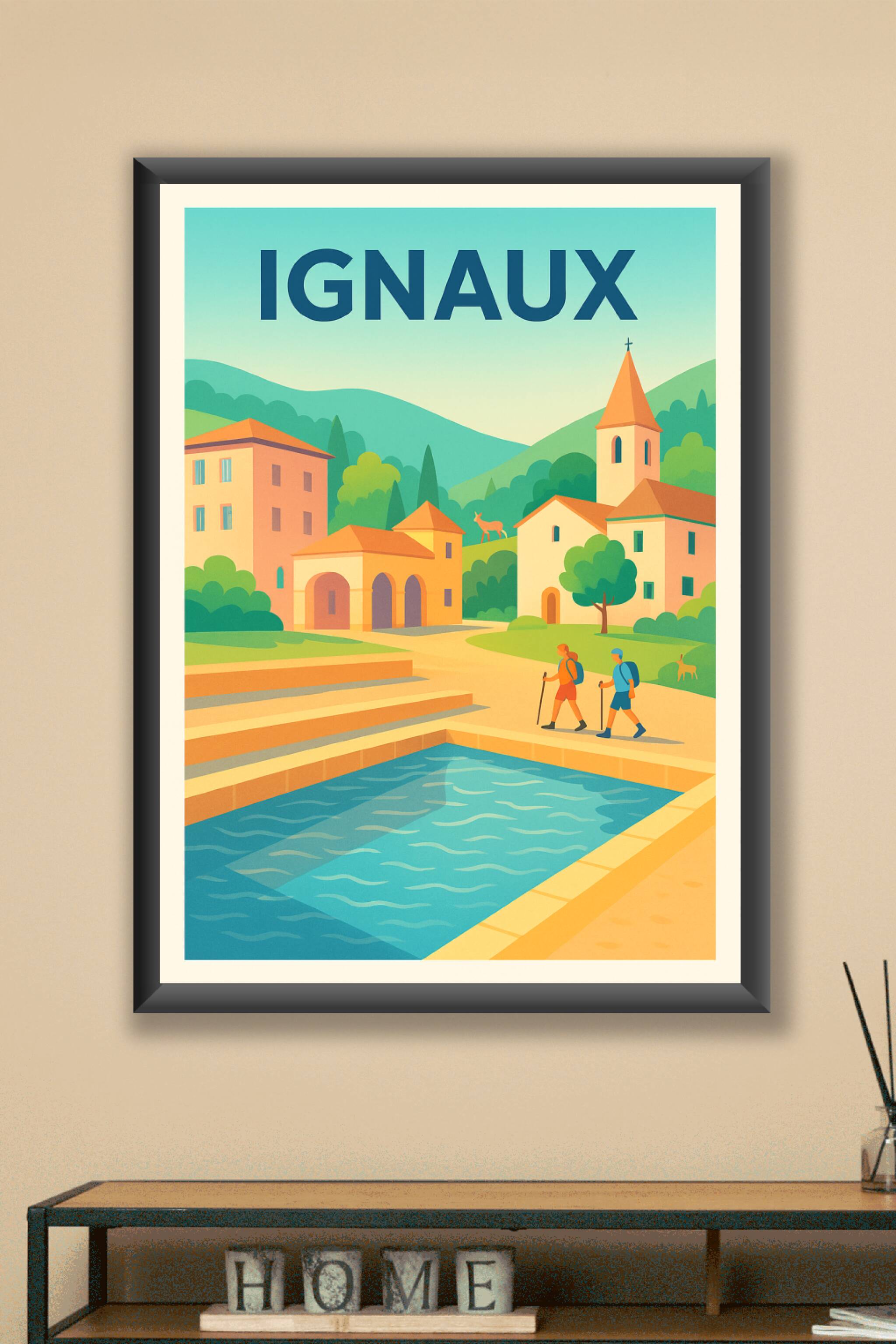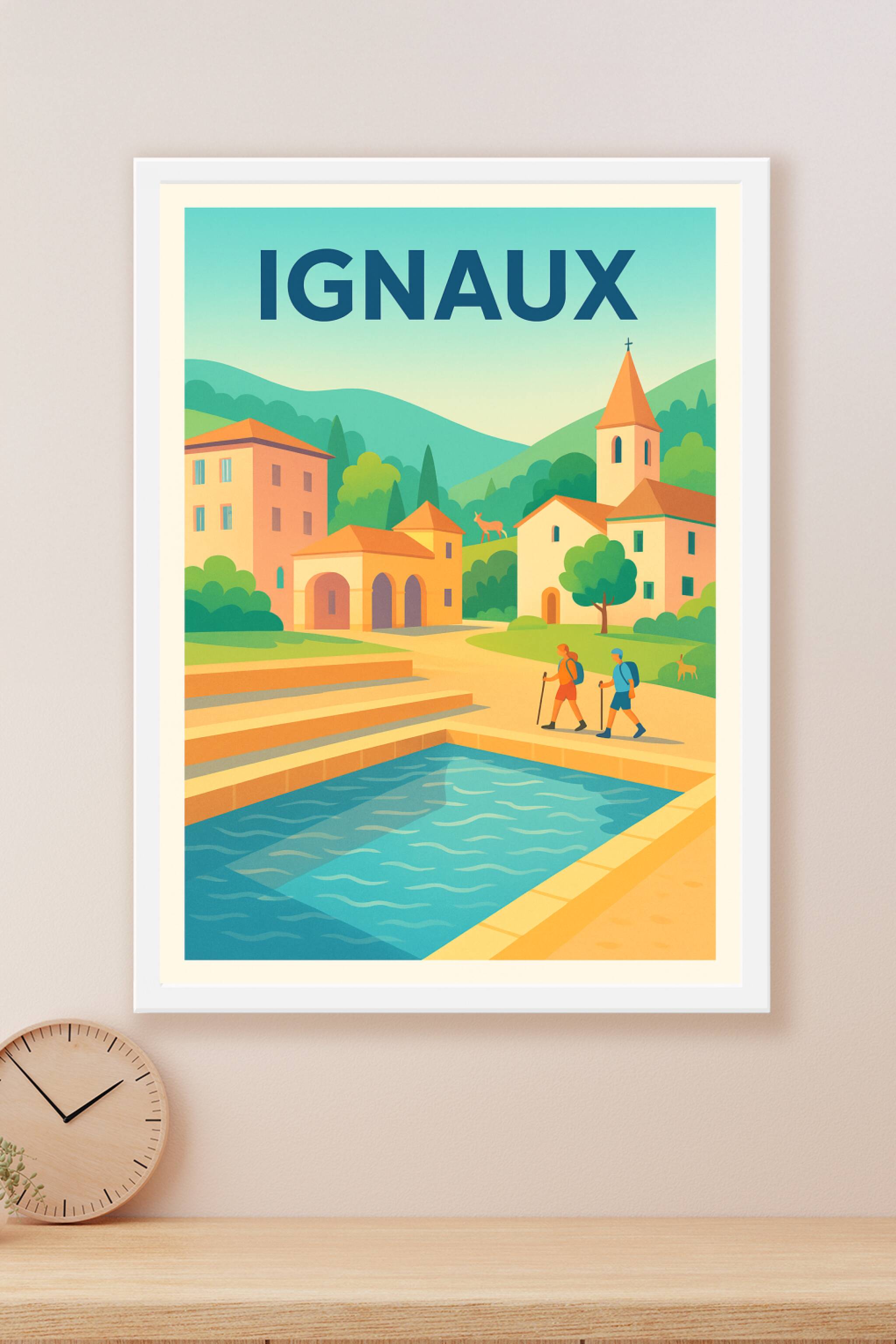 Découvrez l'essence paisible d'Ignaux à travers cette affiche illustrée, qui met en scène un village pittoresque entouré de collines verdoyantes, p...
