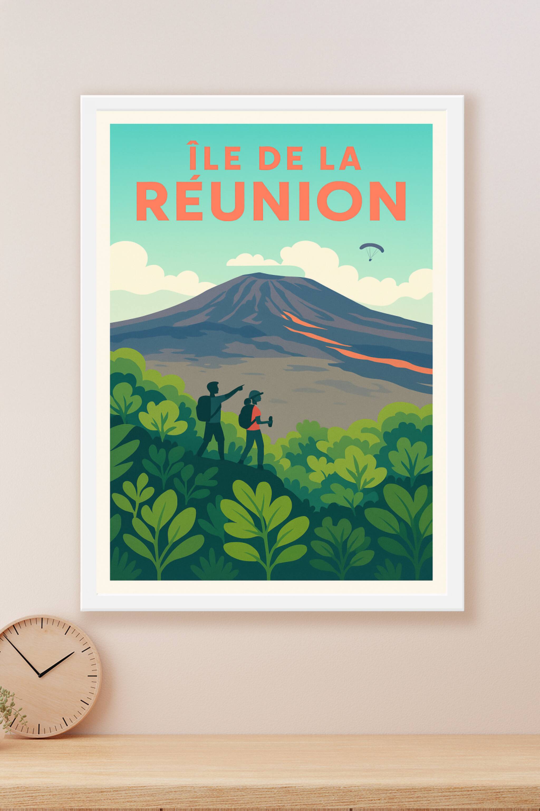 Découvrez la beauté sauvage et exceptionnelle de l'Île de la Réunion avec cette affiche illustrée représentant deux randonneurs admirant le majestu...