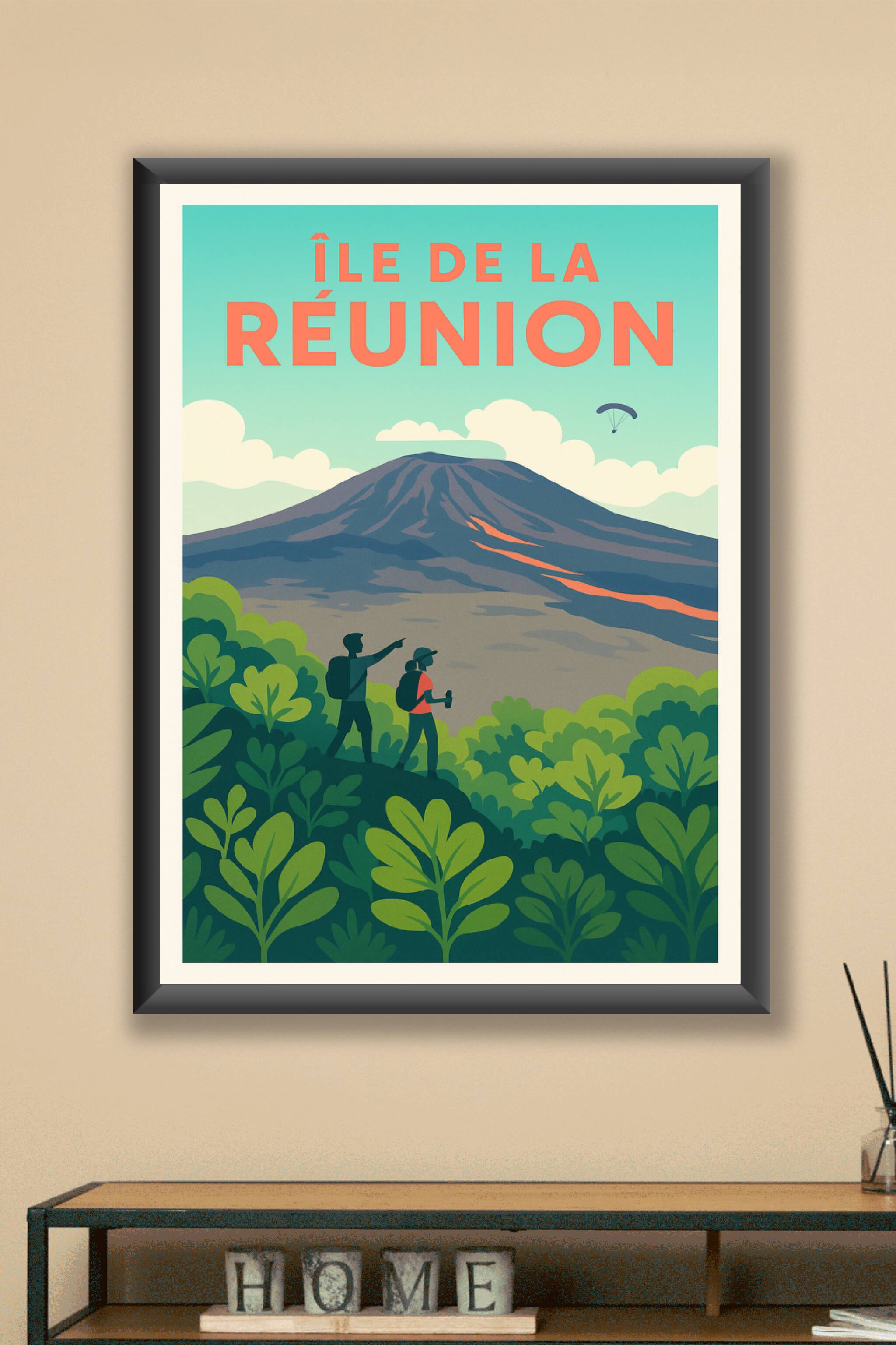 Découvrez la beauté sauvage et exceptionnelle de l'Île de la Réunion avec cette affiche illustrée représentant deux randonneurs admirant le majestueux volcan en éruption. Ce poster capture l'esprit d'aventure et la richesse naturelle de cette île tropicale. Imprimée en tirage "Fine Art" sur papier coton 305g, cette affiche garantit une qualité d'impression remarquable et une durabilité optimale. Disponible en formats A1 à A4, avec ou sans cadre, elle apportera une touche de fraîcheur et d'exotisme à votre décoration intérieure. Profitez de cette impression premium, 100% fabriquée en France, pour vous offrir ou offrir un souvenir élégant et authentique de l'Île de la Réunion.