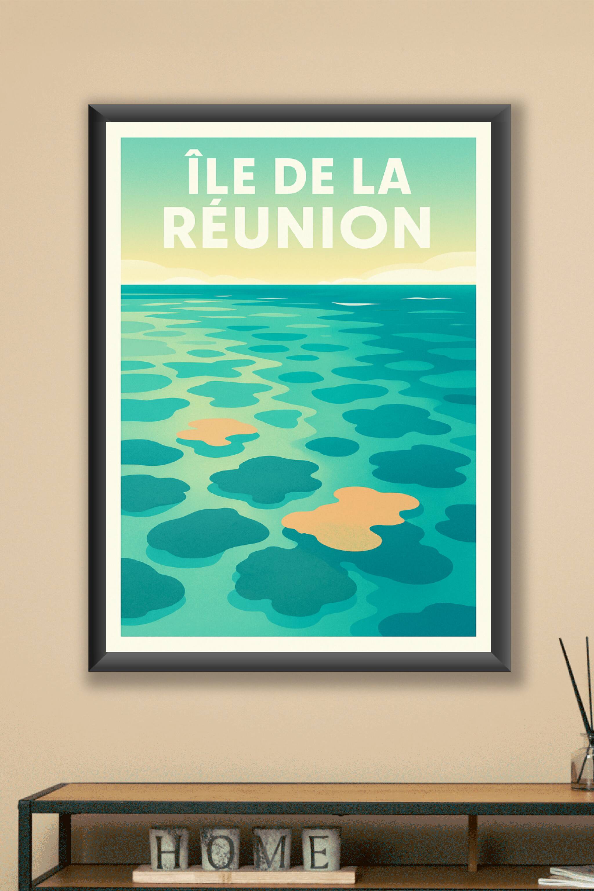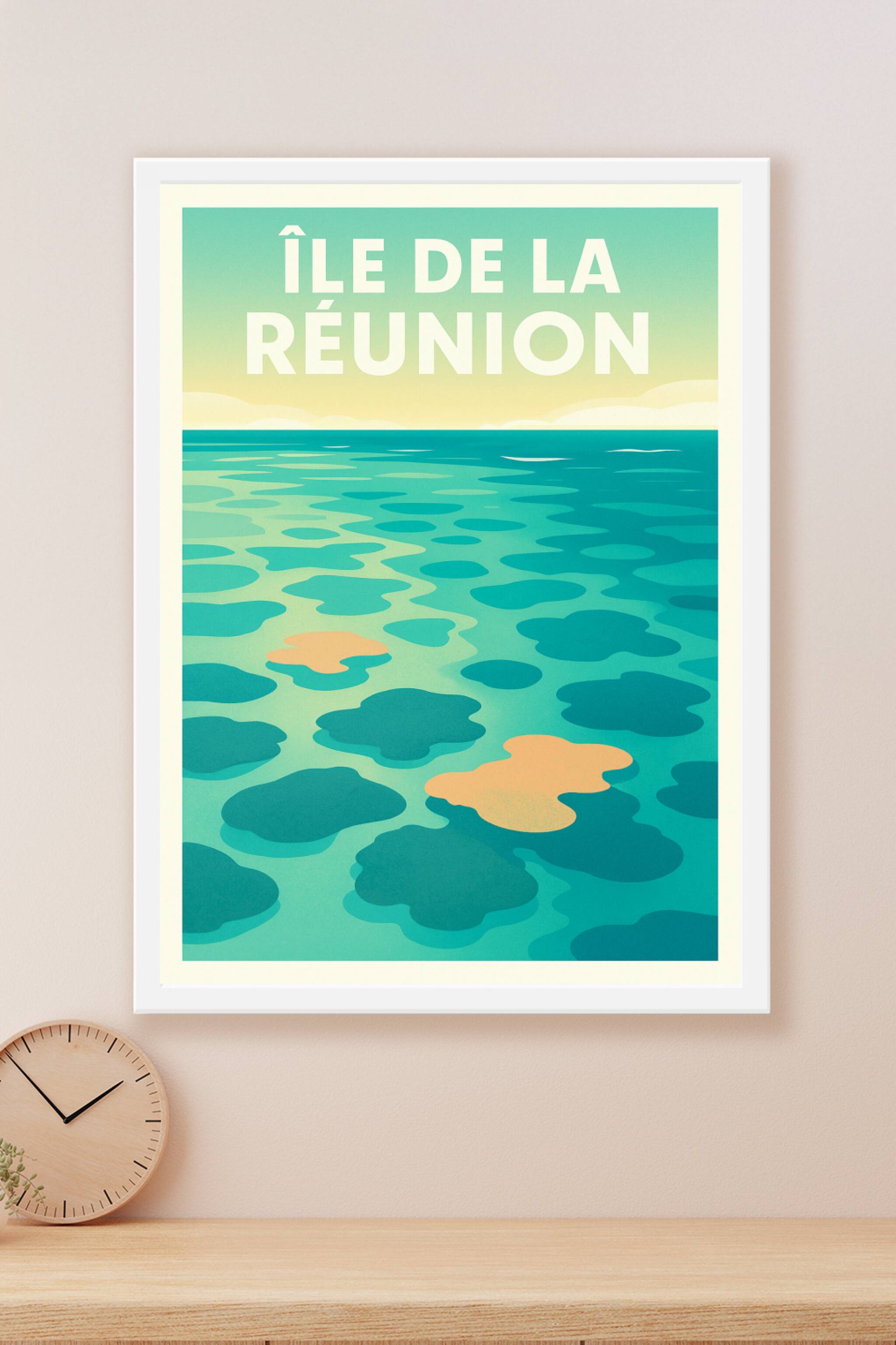 Découvrez l'atmosphère enchanteresse de l'Île de la Réunion à travers cette affiche au style rétro qui capture la beauté unique de ses eaux turquoi...