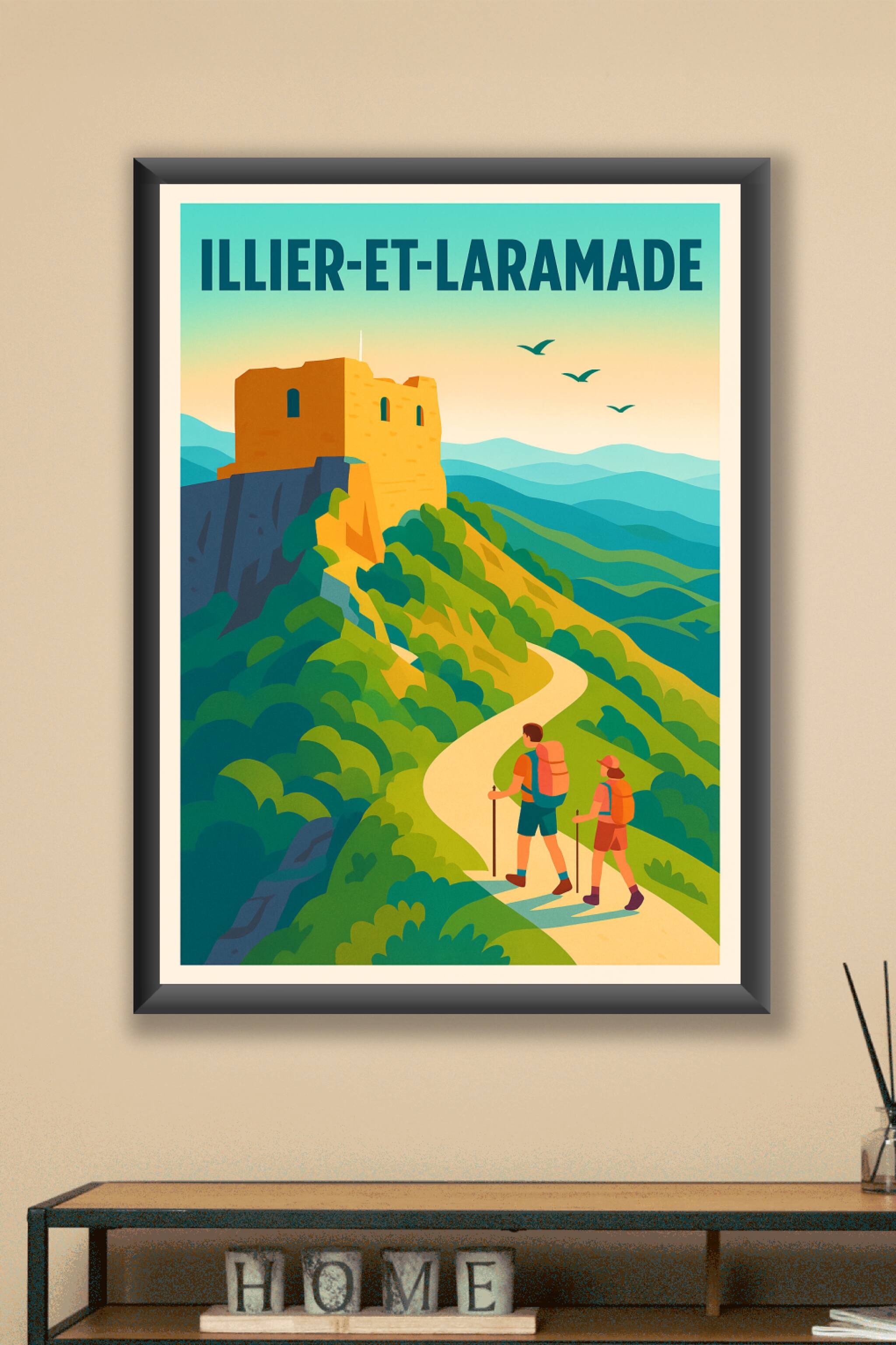 Découvrez l'appel de la nature sauvage avec cette affiche illustrée représentant une randonnée au cœur des paysages montagneux d'Illier-et-Laramade...