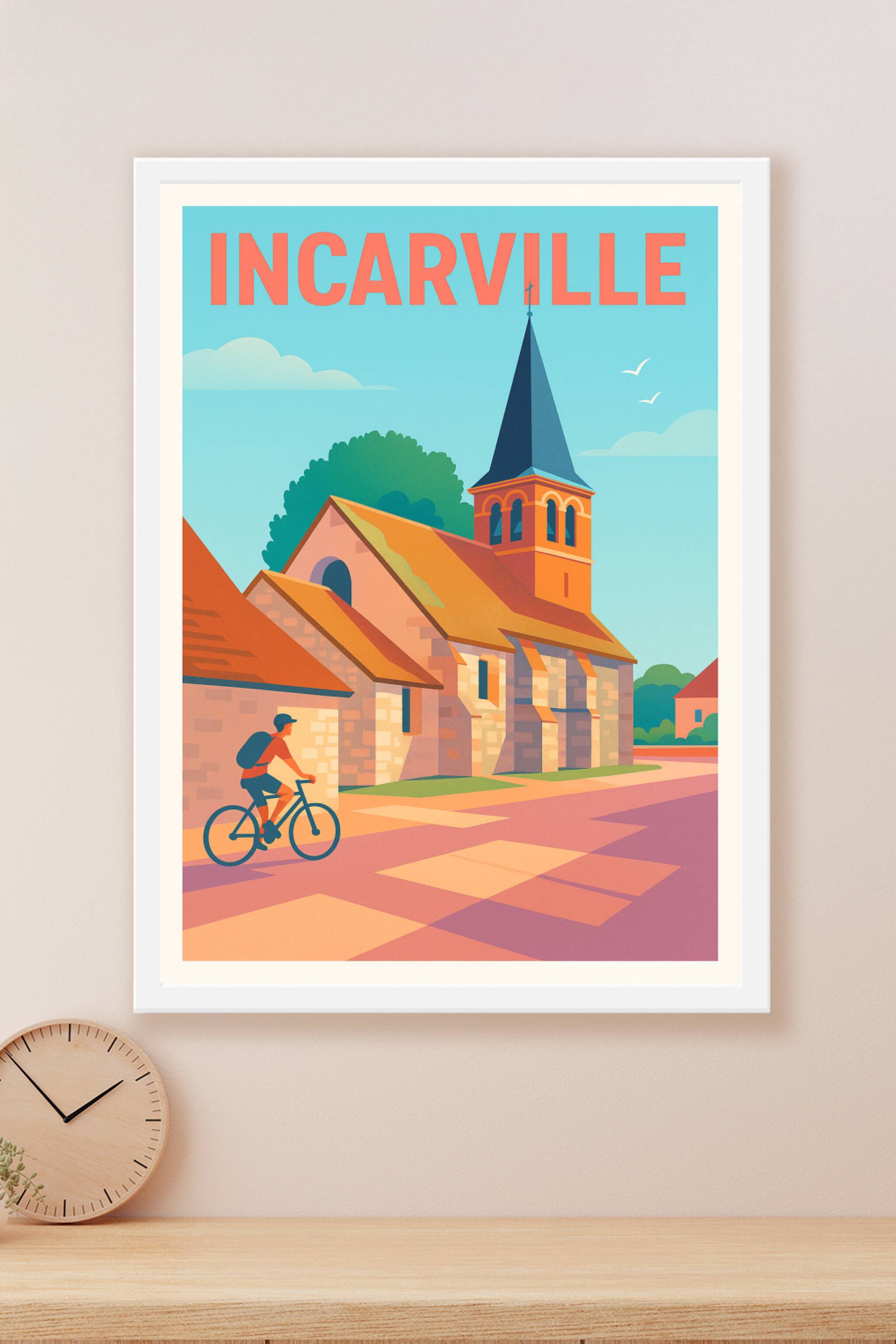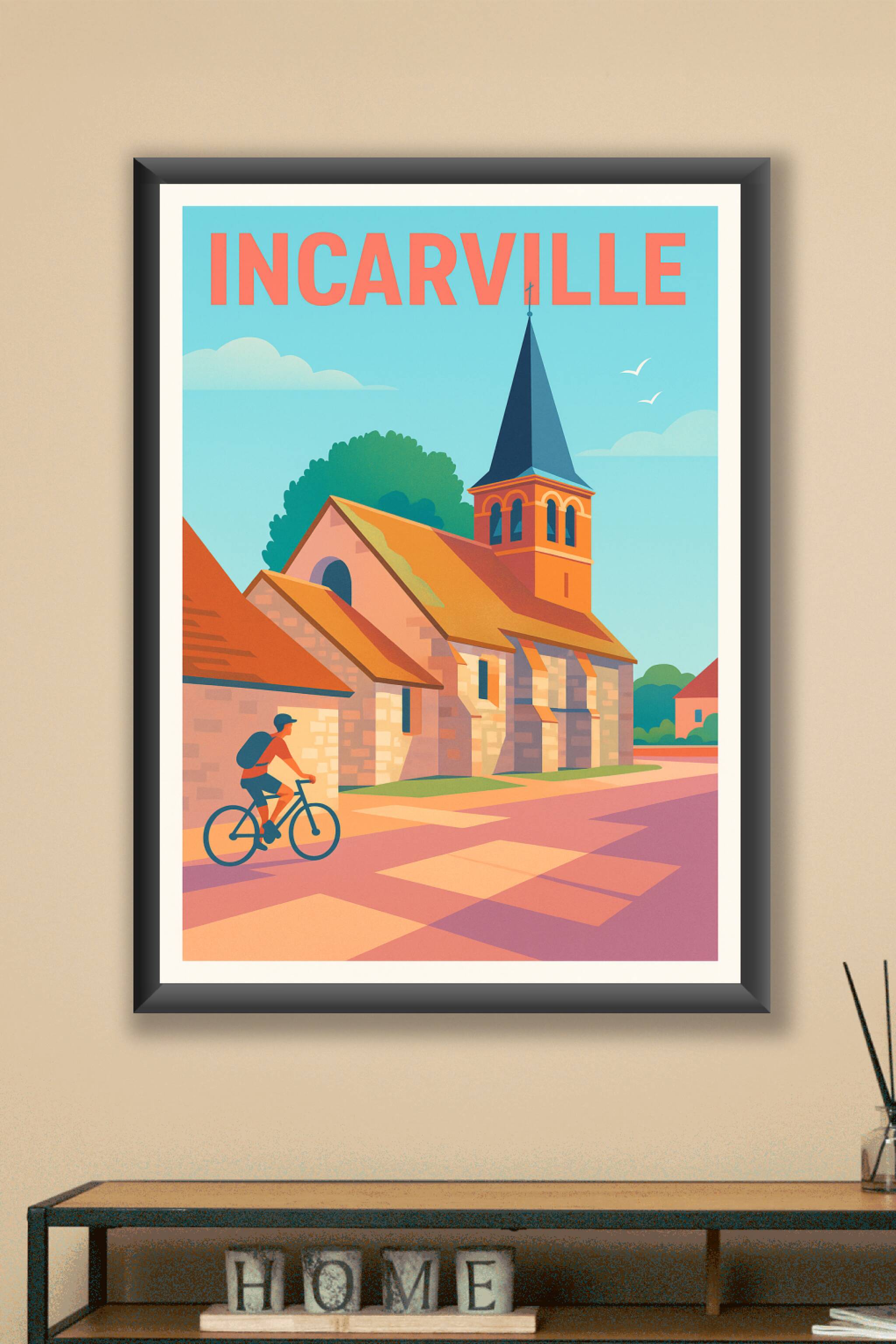 Découvrez l'ambiance paisible et authentique d'Incarville à travers cette affiche illustrée avec douceur et élégance. Représentant un charmant bâti...