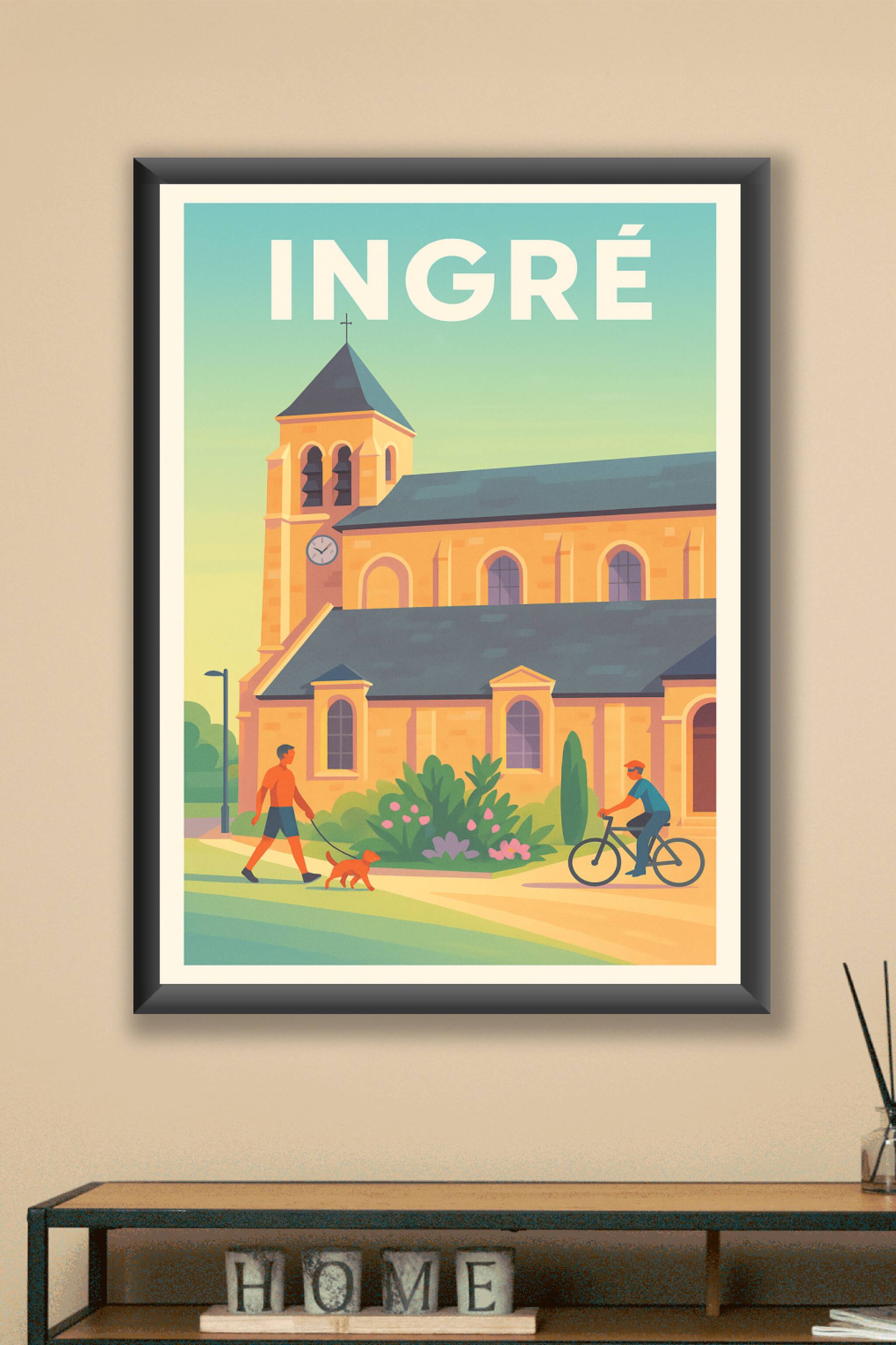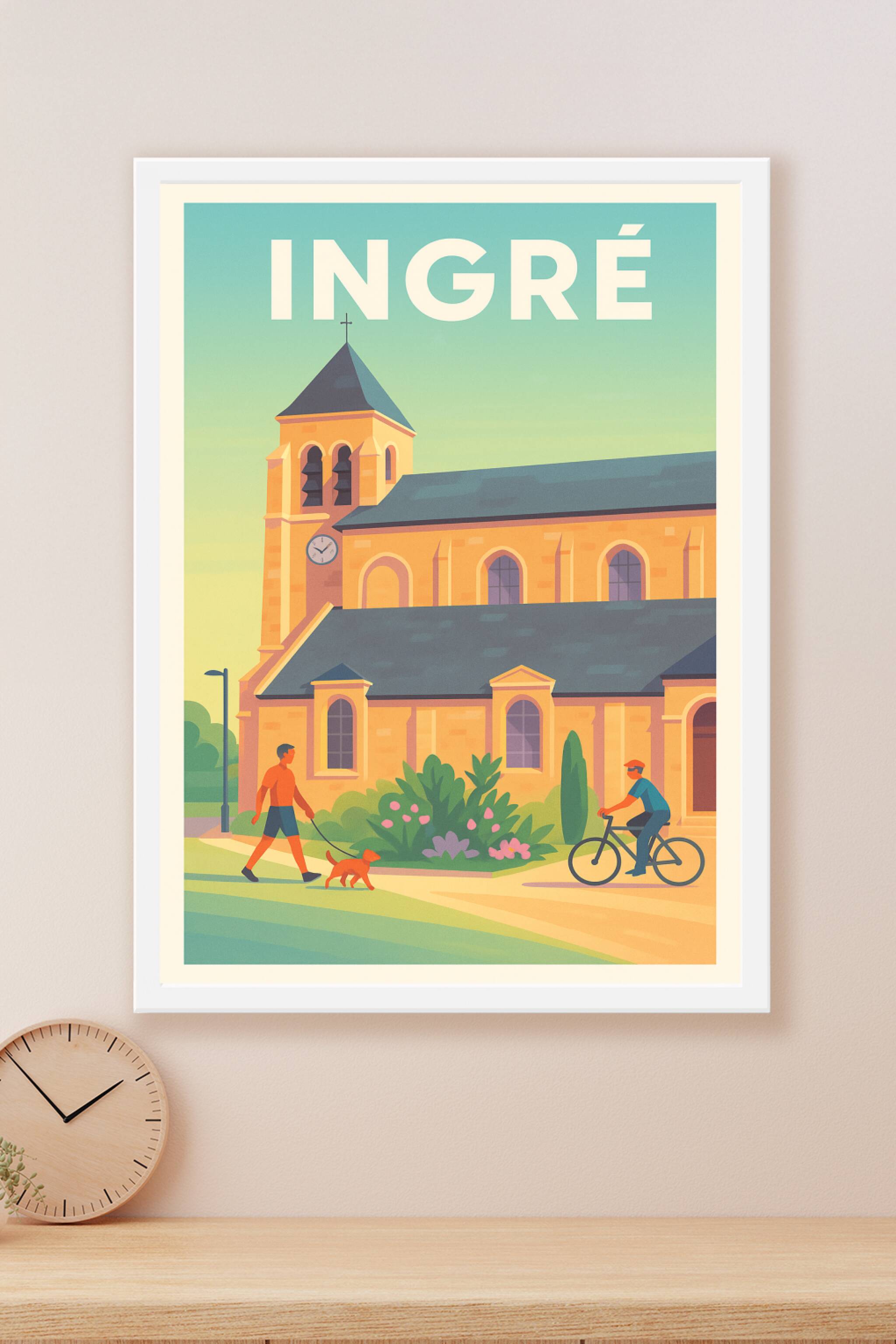 Découvrez l'ambiance paisible et conviviale d'Ingré à travers cette affiche illustrée mettant en scène l'église emblématique entourée d'un cadre na...
