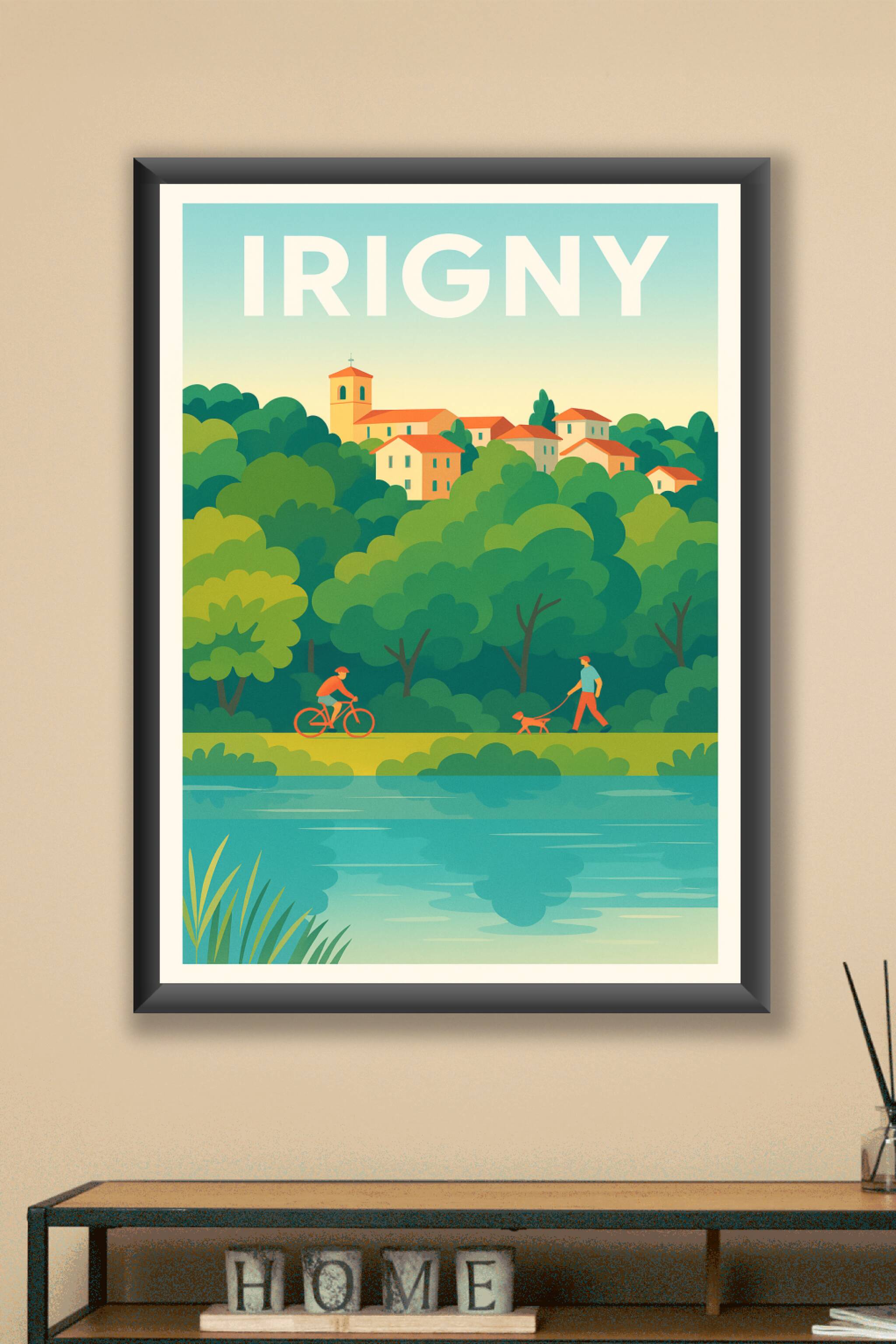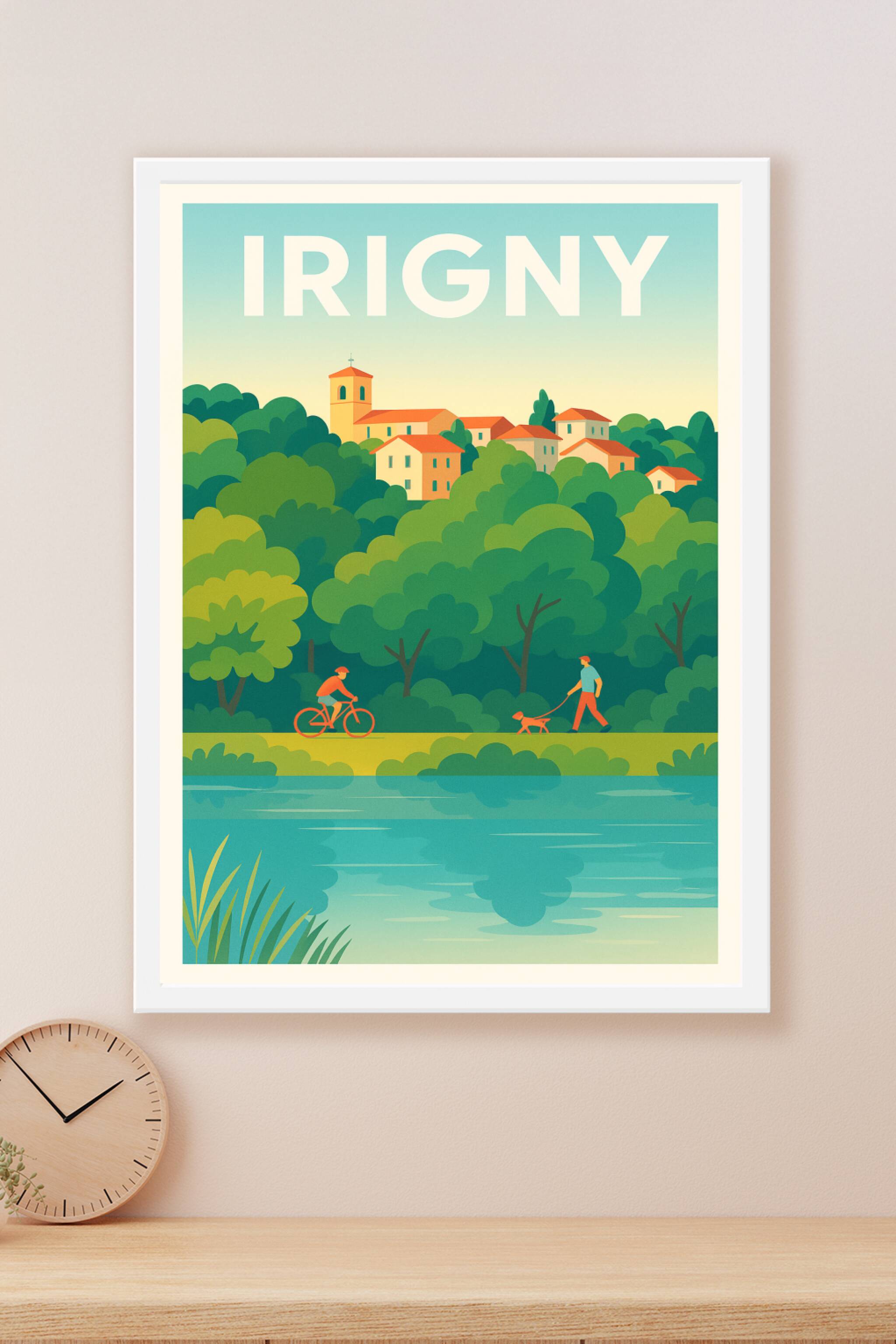 Découvrez la quiétude et la verdure d'Irigny à travers cette affiche illustrée au style rétro, mettant en scène le charme d'un village niché parmi ...