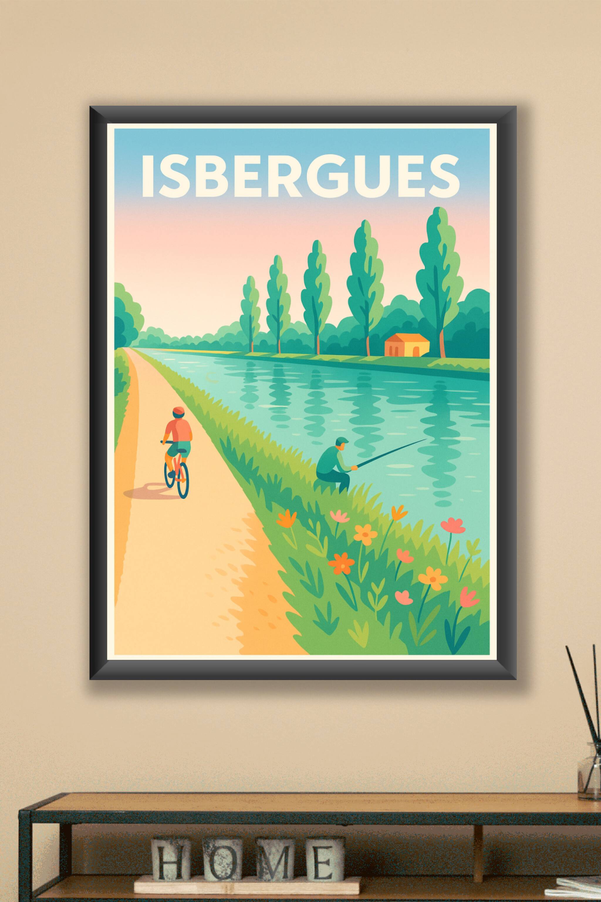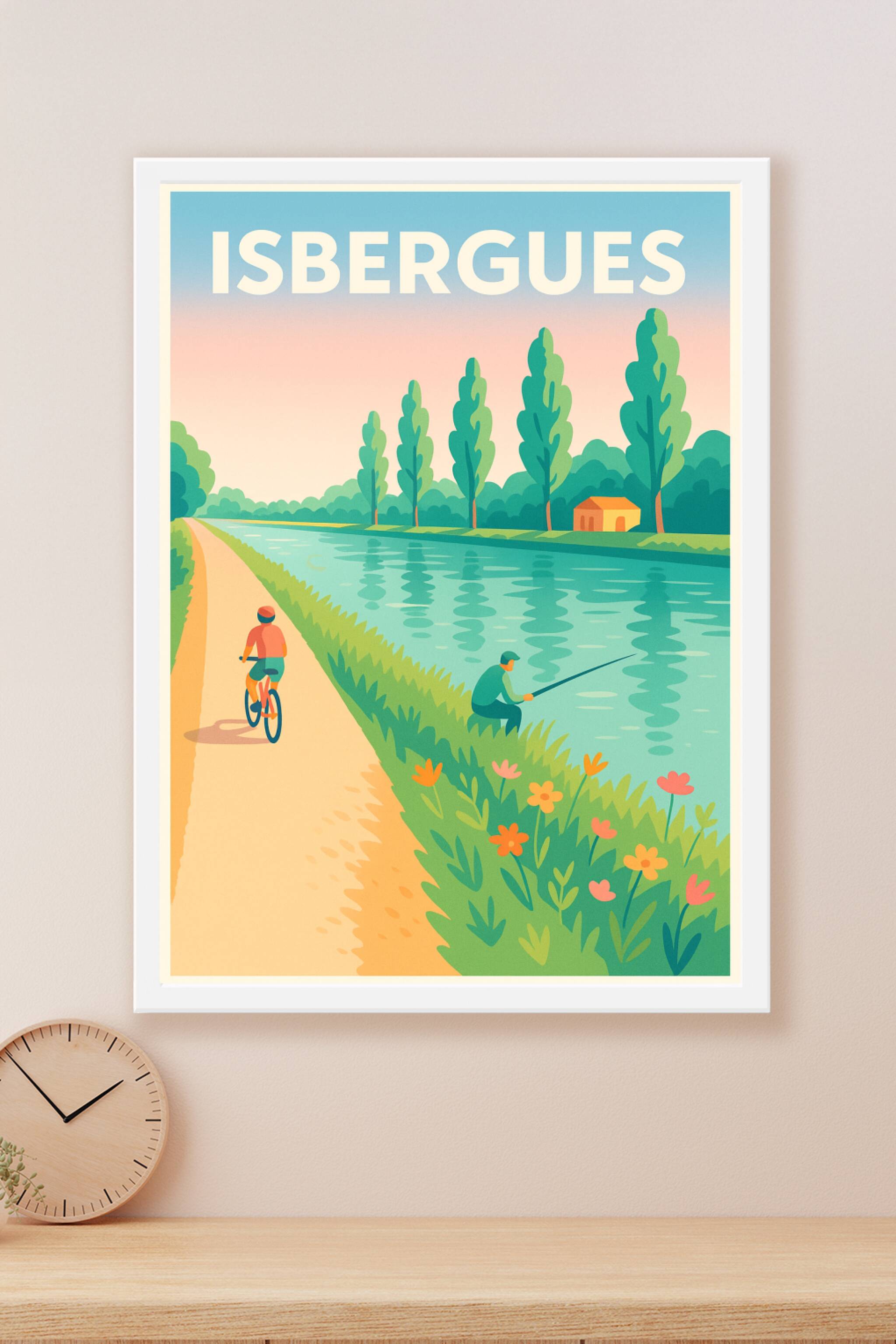 Découvrez la douceur d'Isbergues avec cette affiche illustrant une scène paisible au bord du canal, où cycliste et pêcheur profitent d'un moment de...