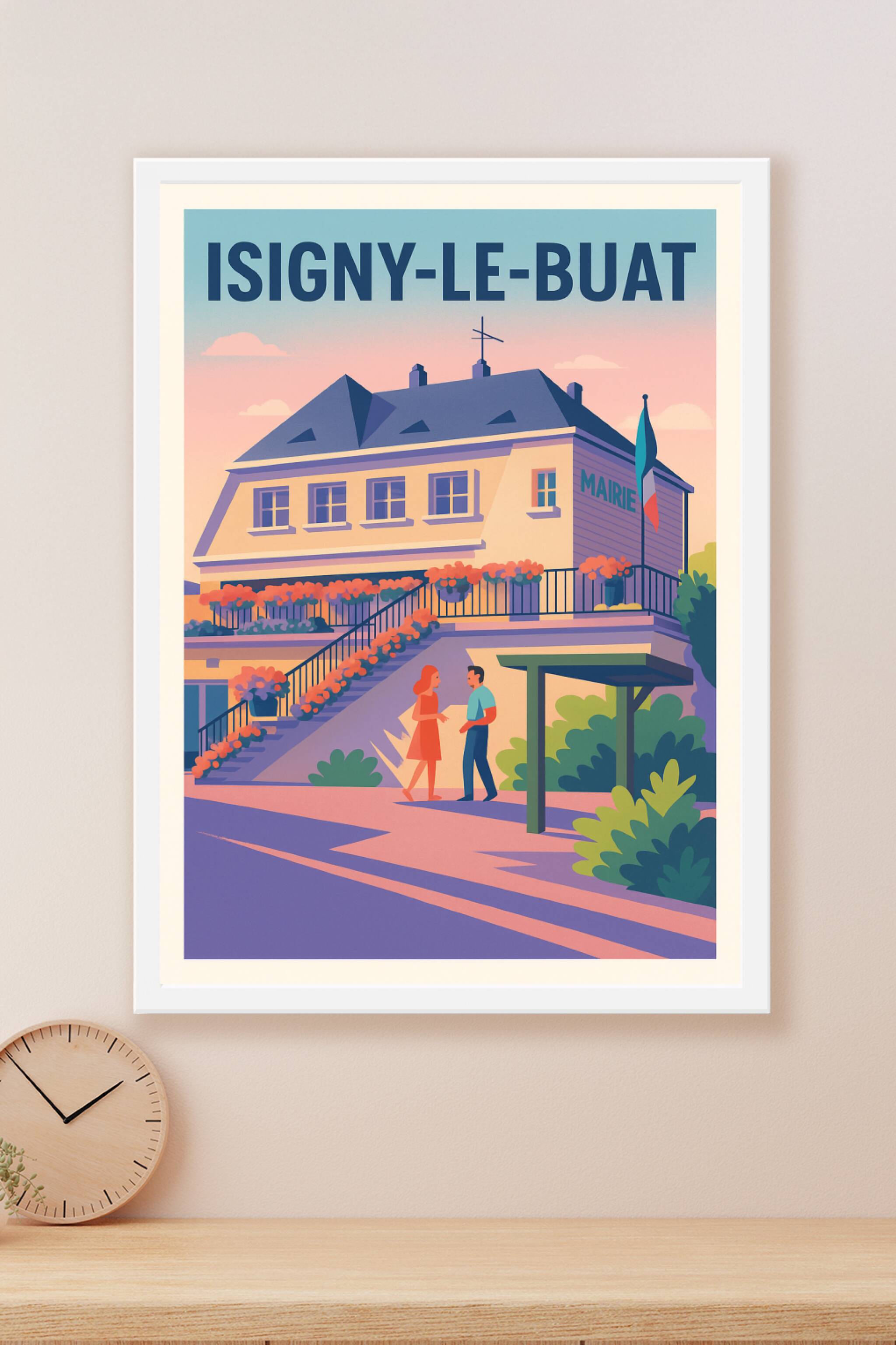 Apportez une touche de sérénité et d'authenticité à votre décoration avec cette affiche illustrée d'Isigny-le-Buat, représentant la mairie emblémat...
