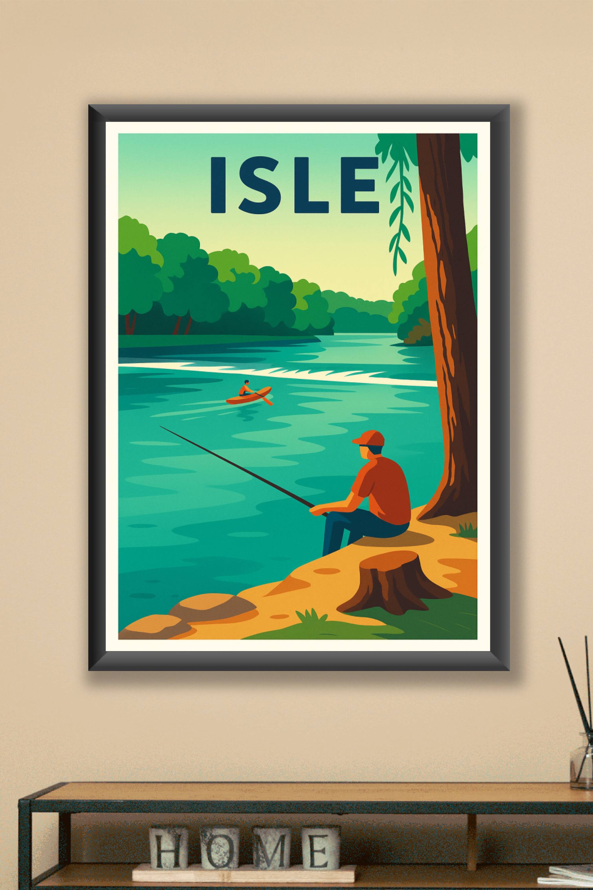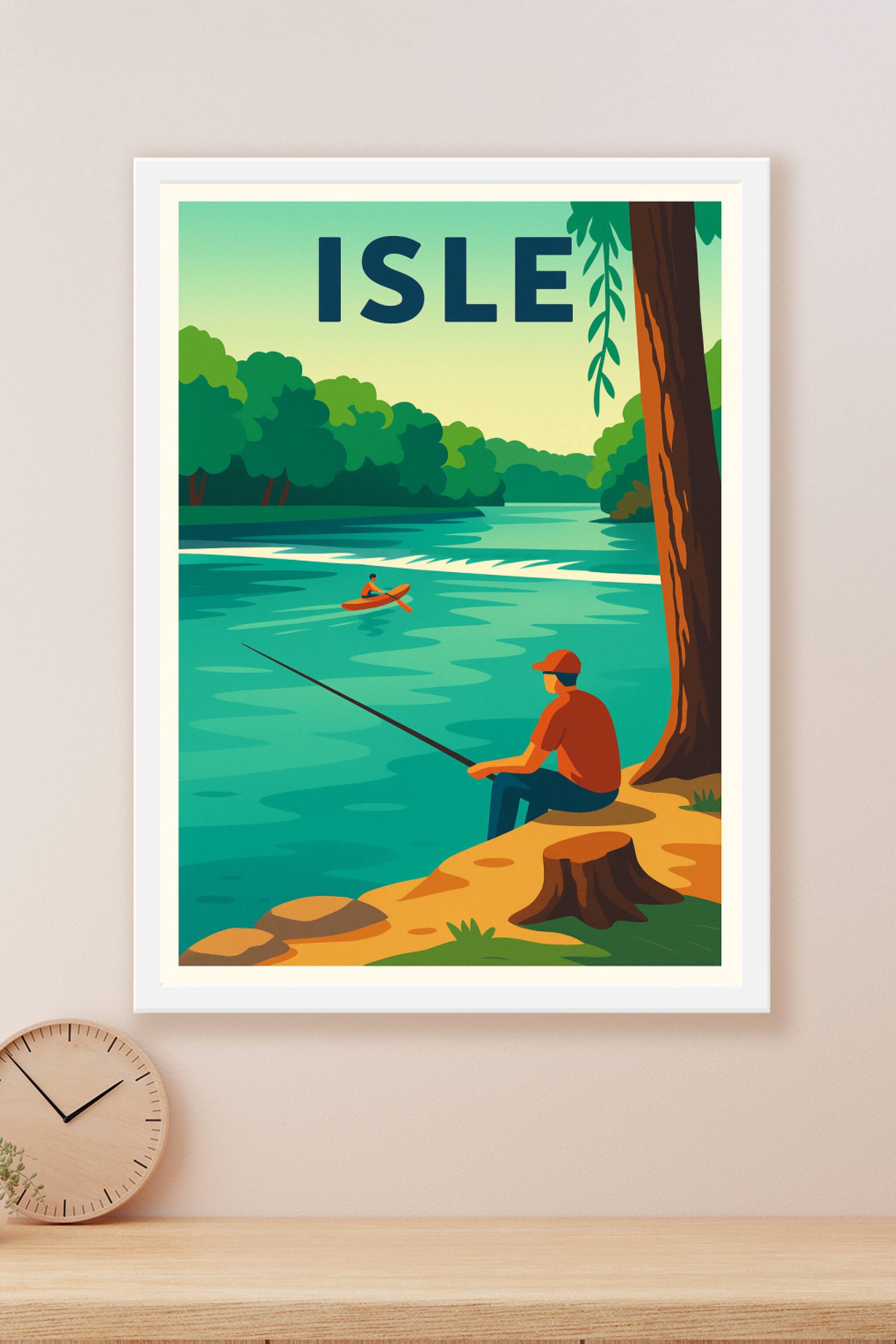 Découvrez la sérénité de la nature avec cette affiche Isle représentant un moment paisible de pêche au bord de l'eau, renforcé par la présence d'un...
