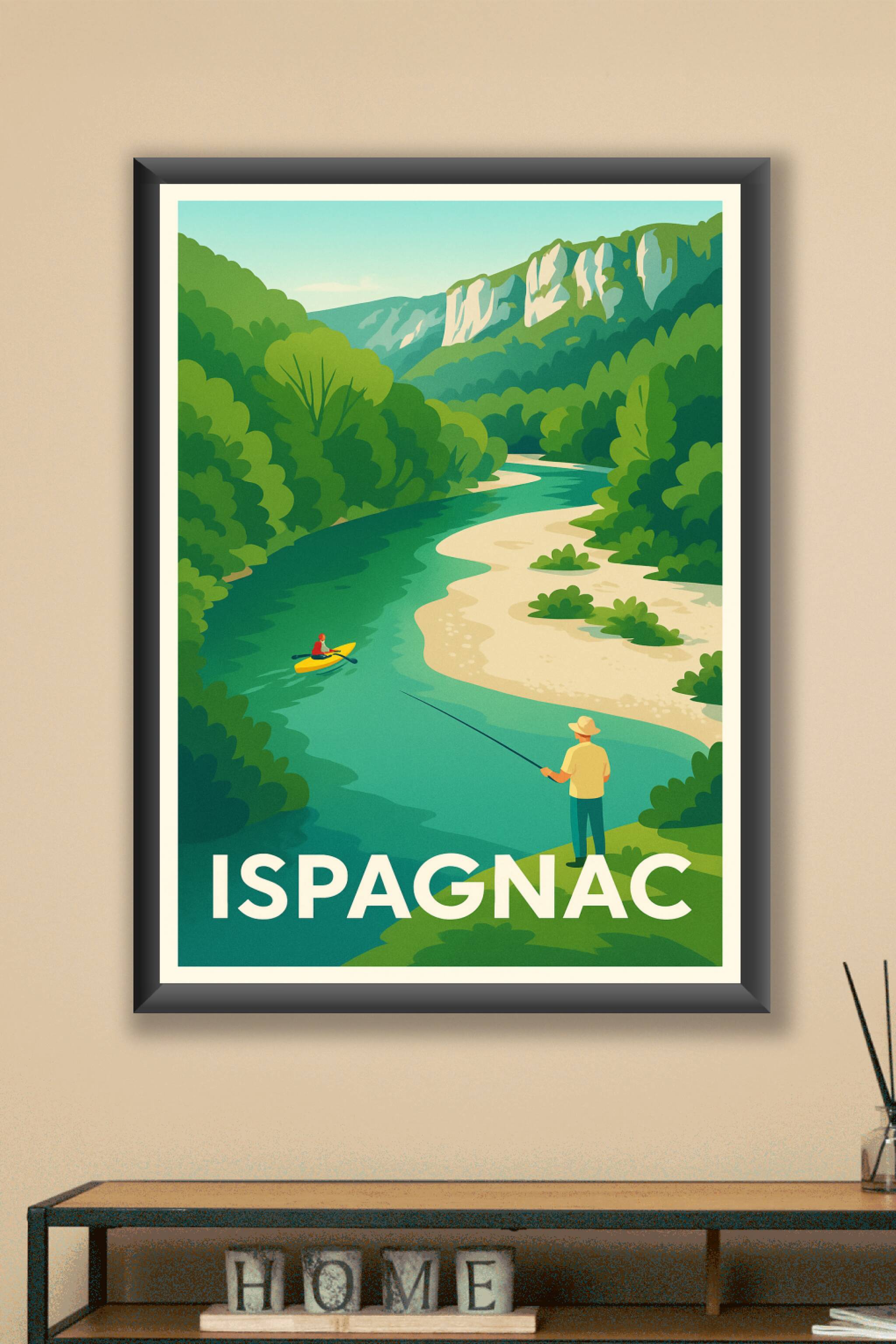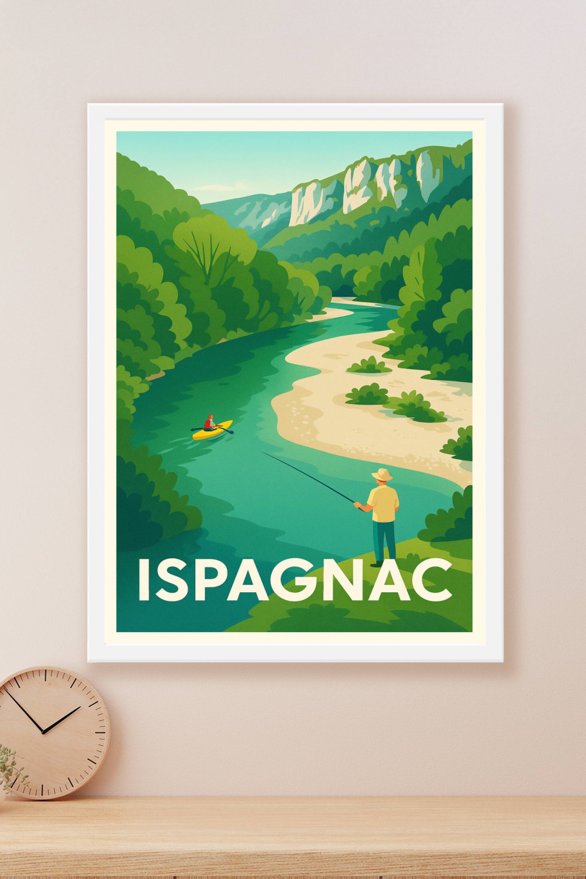 Découvrez la sérénité des paysages verdoyants d'Ispagnac avec cette affiche illustrée mettant en scène une rivière paisible où un pêcheur et un kay...