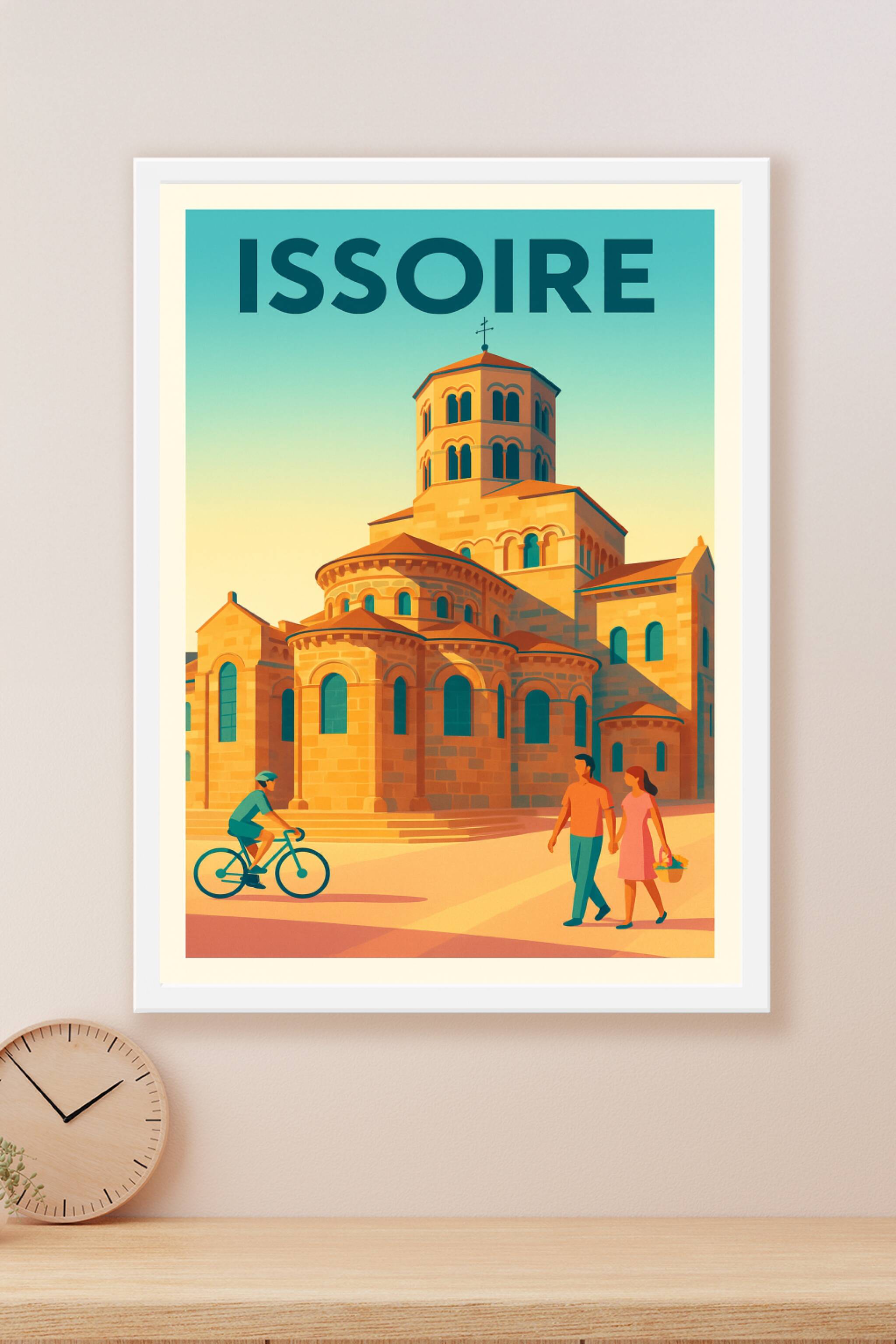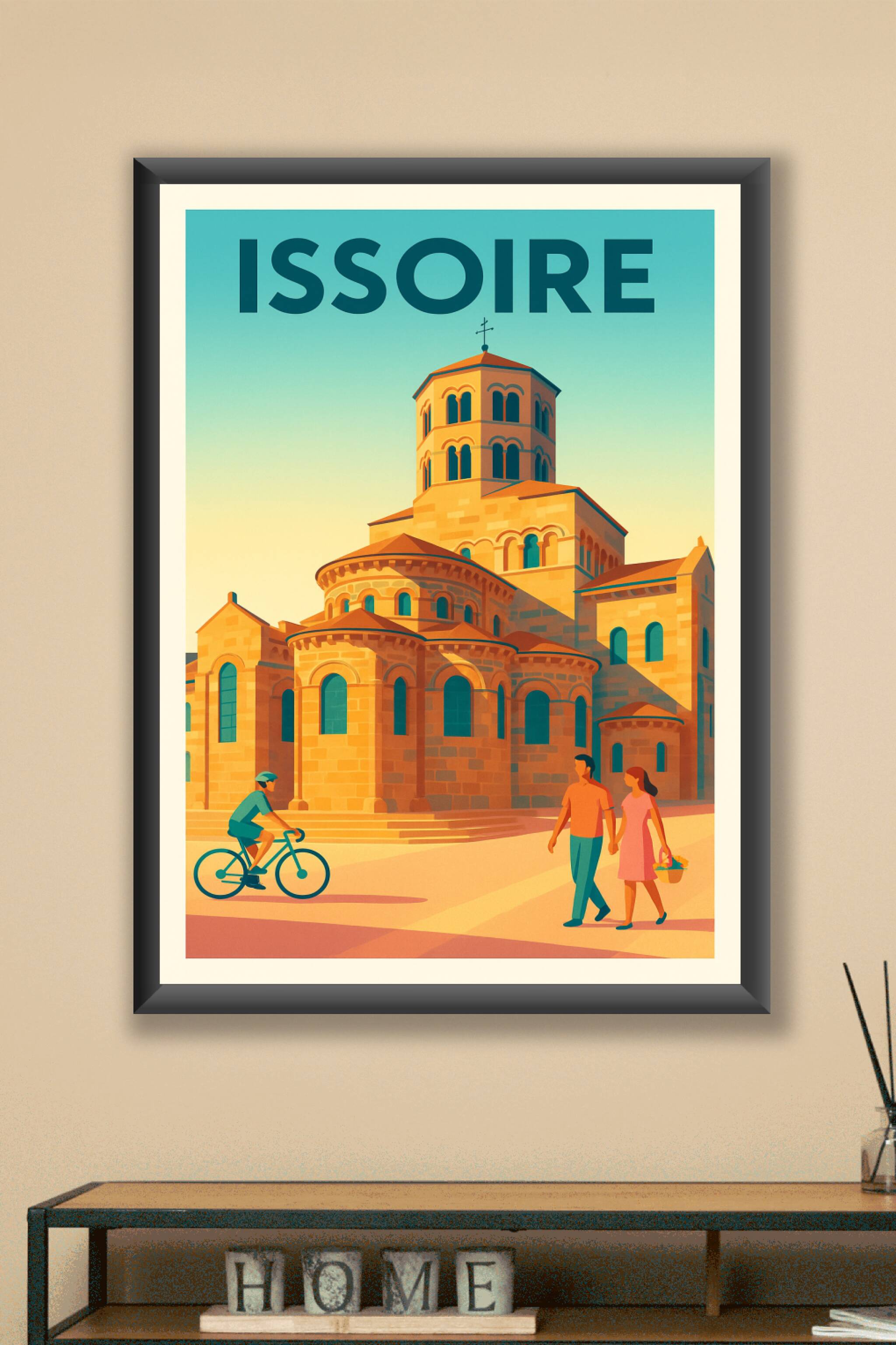 Découvrez le patrimoine exceptionnel d'Issoire avec cette affiche illustrée mettant en avant la majestueuse abbaye Saint-Austremoine, joyau de l'ar...
