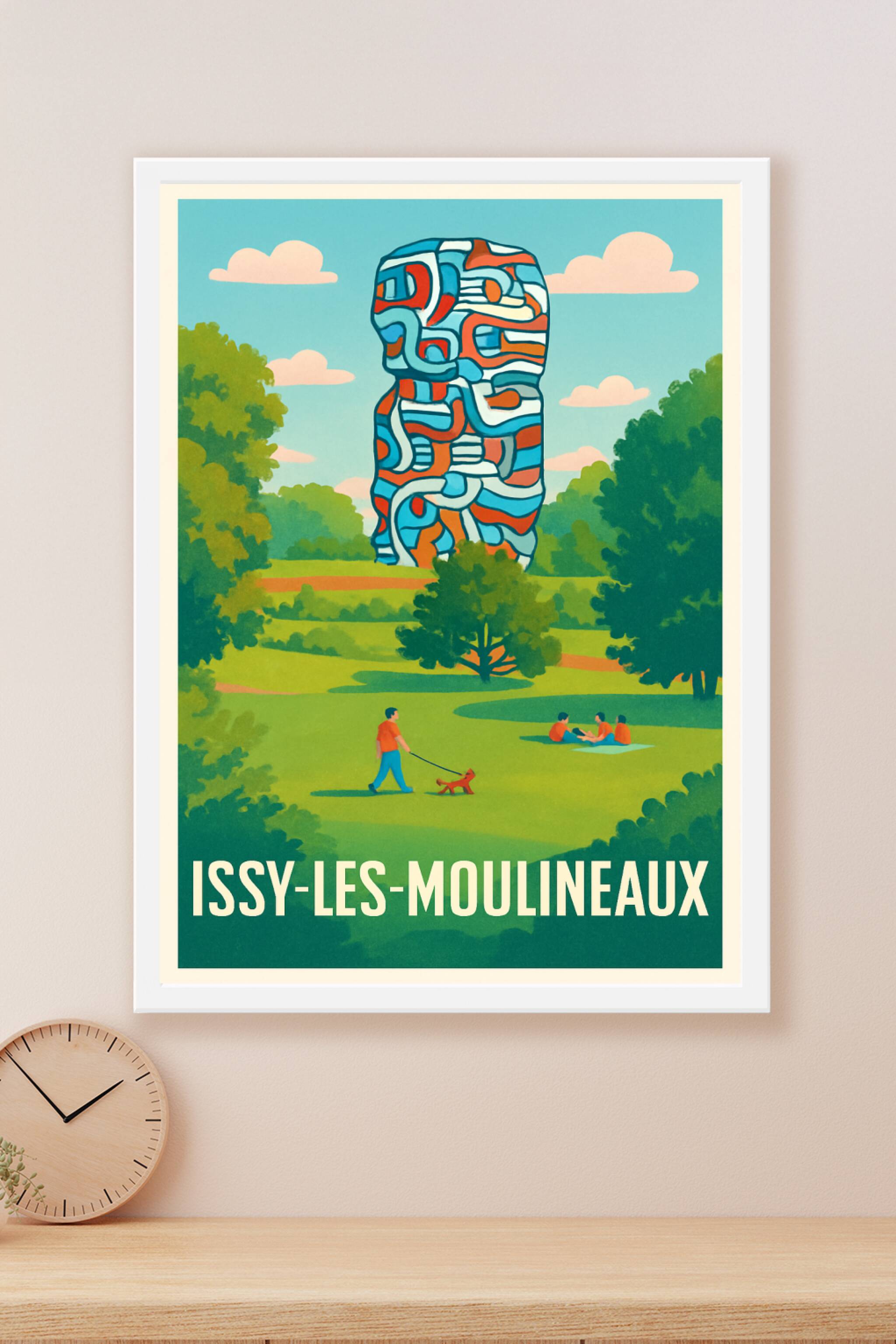 Découvrez la sérénité d'Issy-les-Moulineaux à travers cette affiche qui capture un parc verdoyant où se dresse une sculpture moderne aux lignes col...