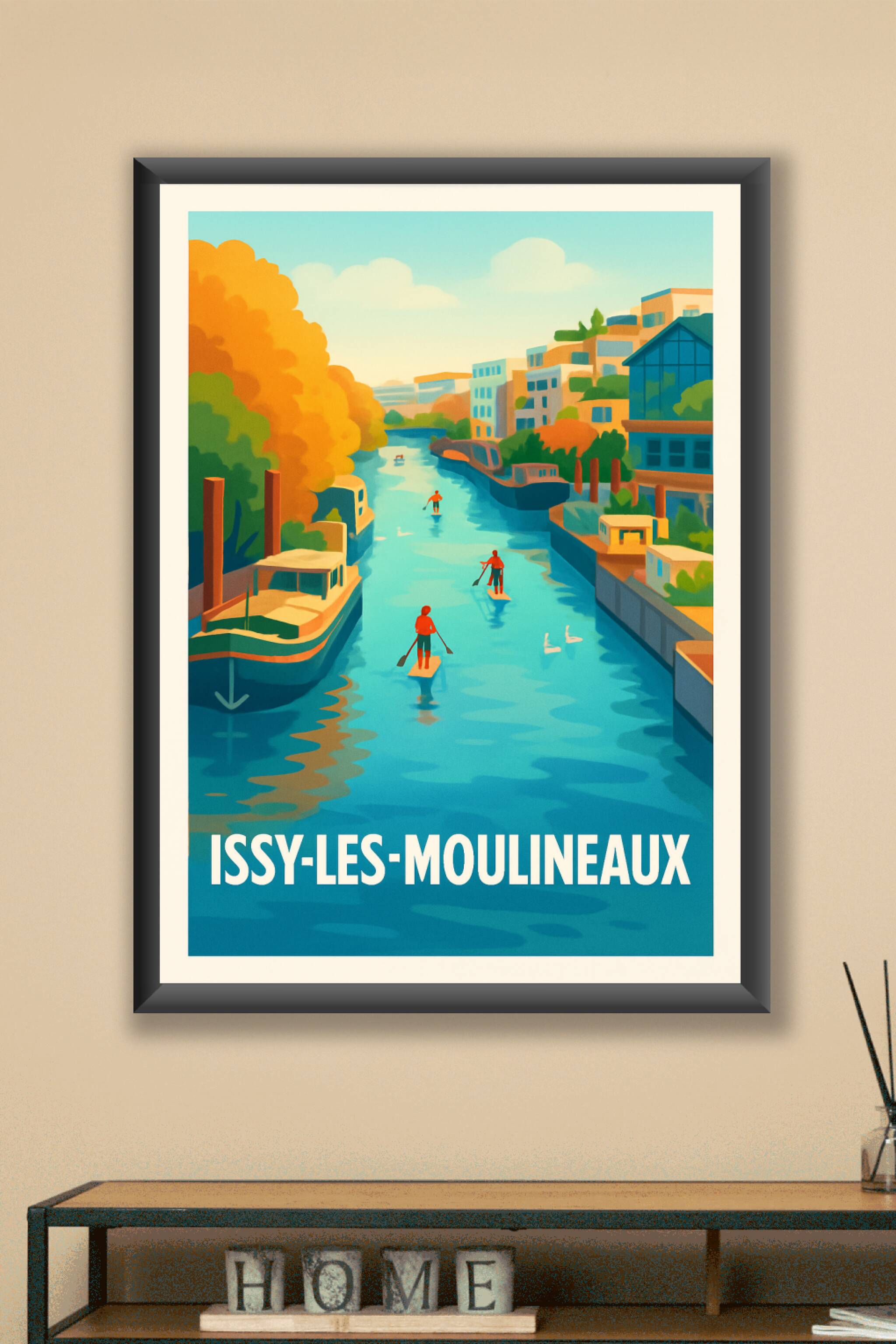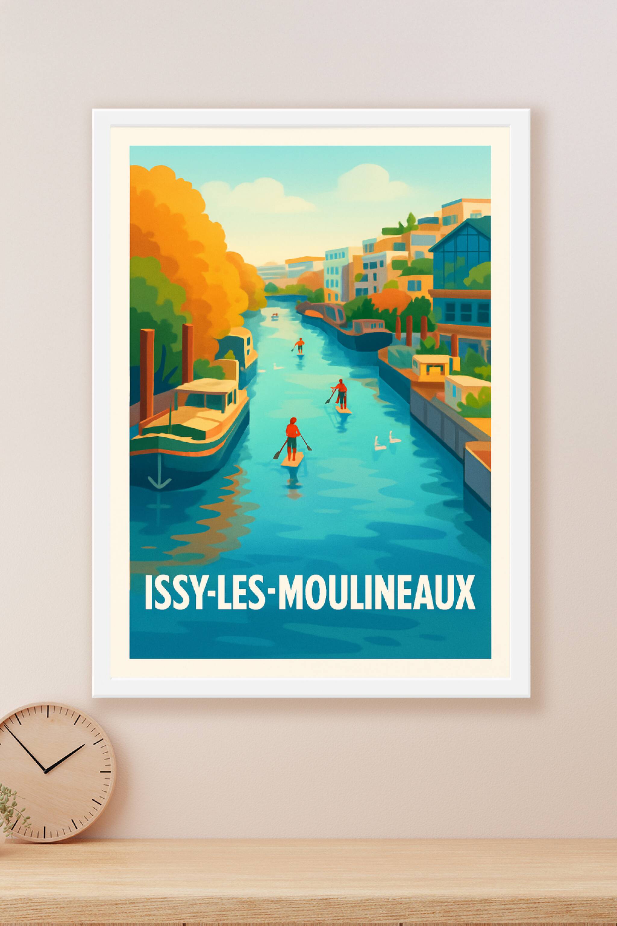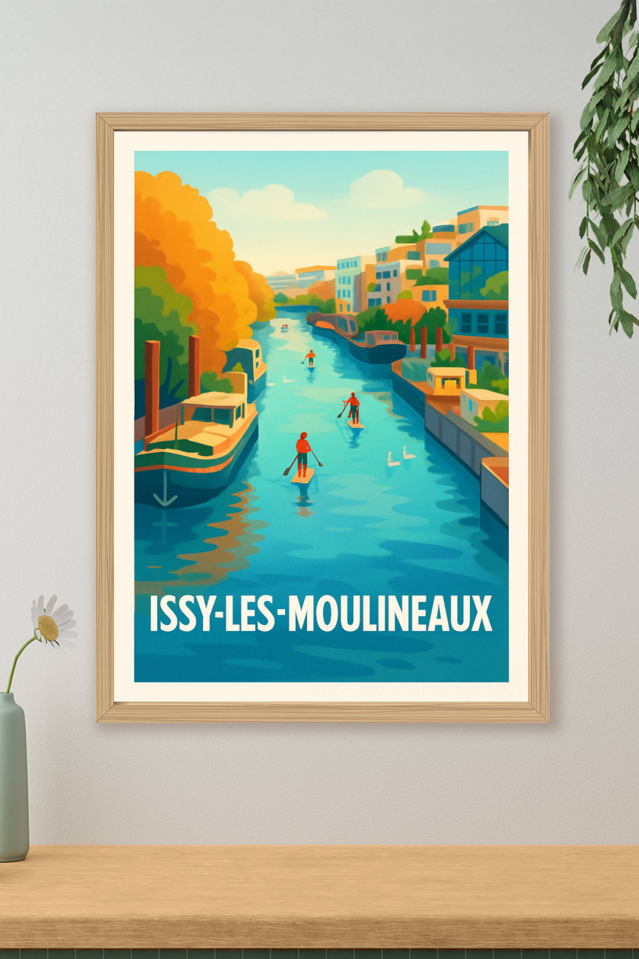 Découvrez la sérénité d'Issy-les-Moulineaux avec cette affiche illustrée représentant une scène paisible sur la Seine, où les amateurs de paddle gl...
