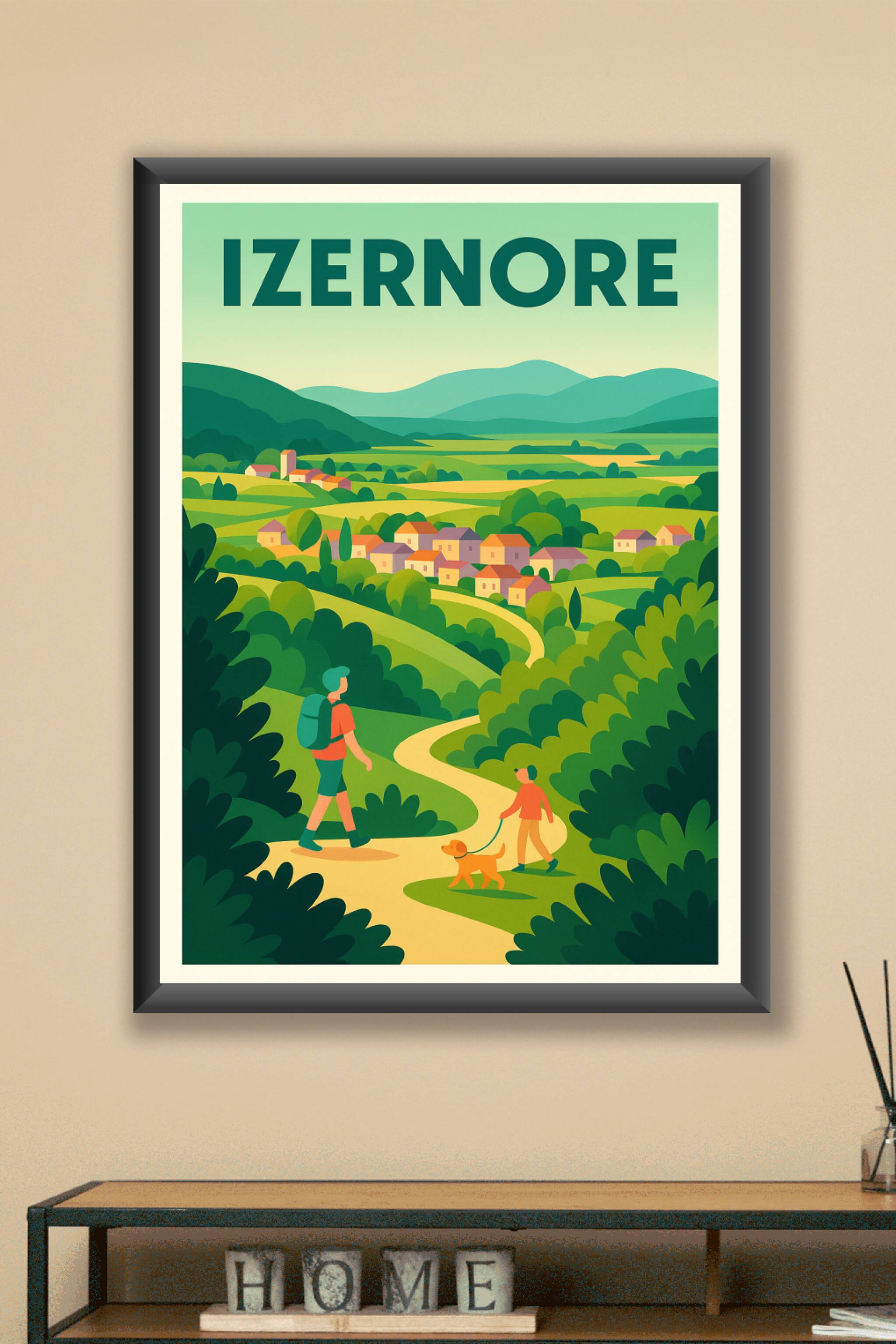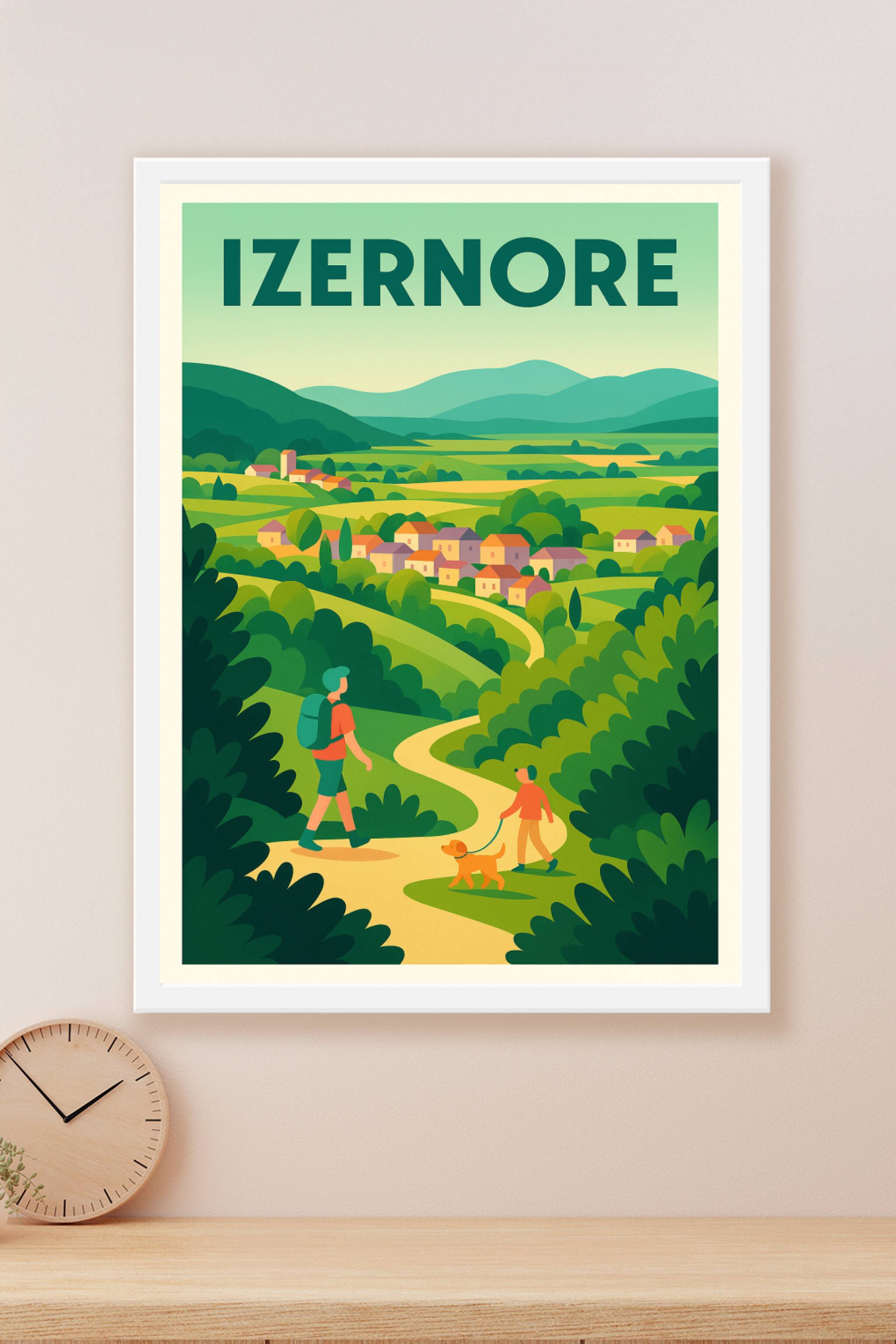 Découvrez la sérénité de la campagne d'Izernore avec cette affiche illustrée aux couleurs douces et harmonieuses. Ce poster capture un chemin sinueux bordé de verdure où marcheurs et promeneurs profitent d'un cadre paisible entre petits villages et collines. Imprimé en tirage "Fine Art" sur un papier 305g coton de haute qualité, il garantit une durabilité et une finesse des détails exceptionnelles. Disponible en plusieurs formats A1 à A4, avec ou sans cadre, cette affiche est parfaite pour embellir votre intérieur tout en apportant une touche bucolique et apaisante. Offrez-vous ou offrez un souvenir élégant alliant art et nature, 100% fabriqué en France.