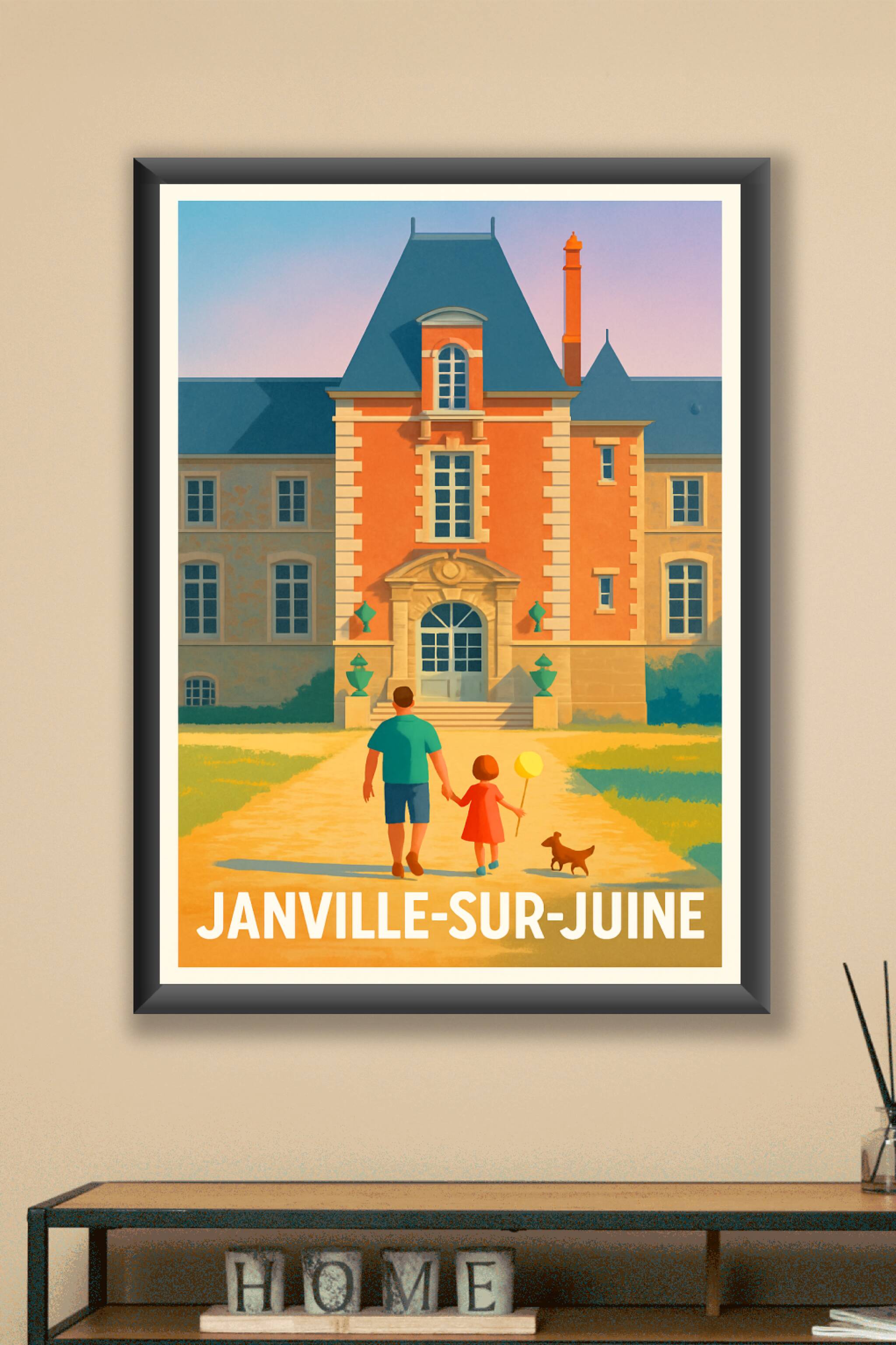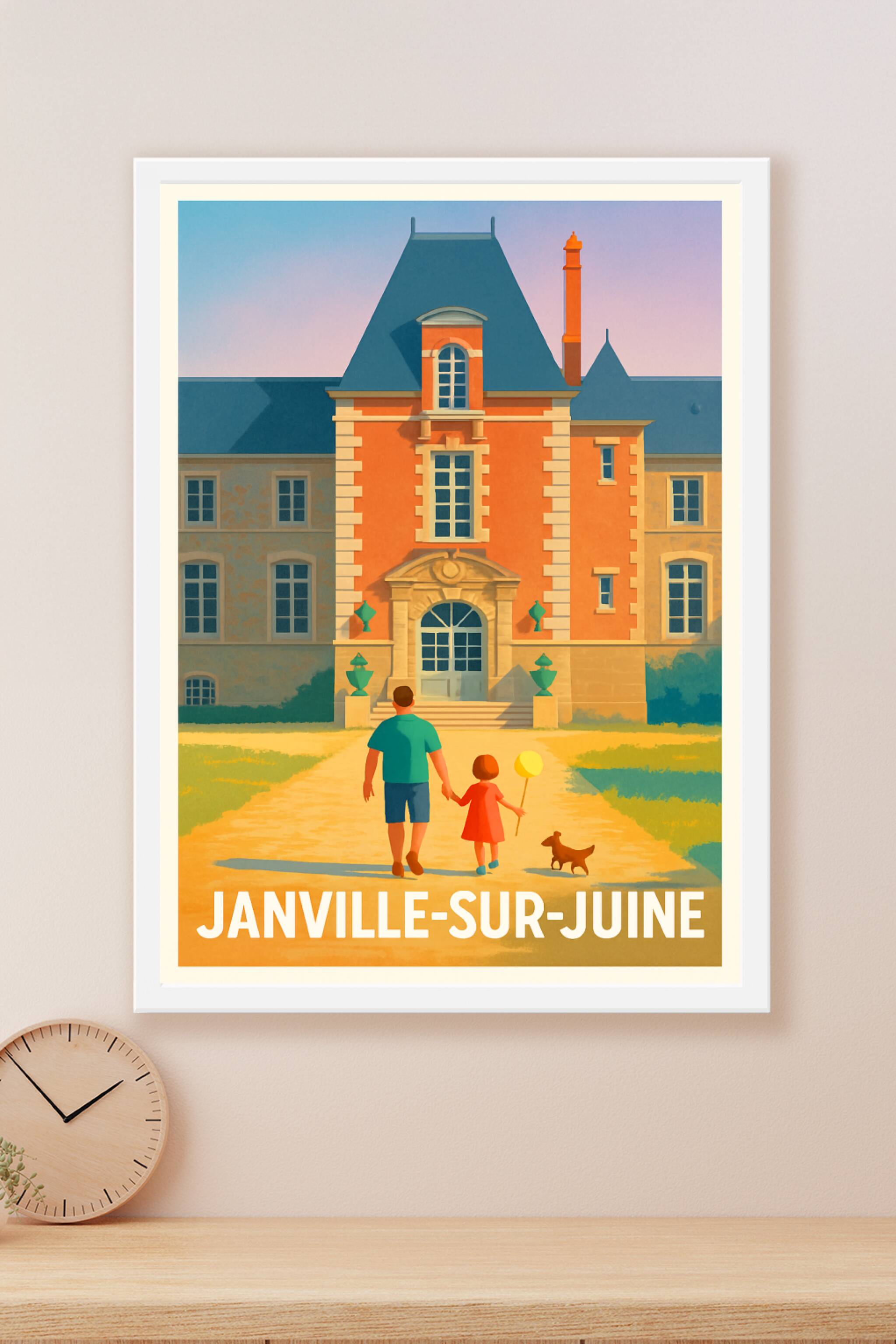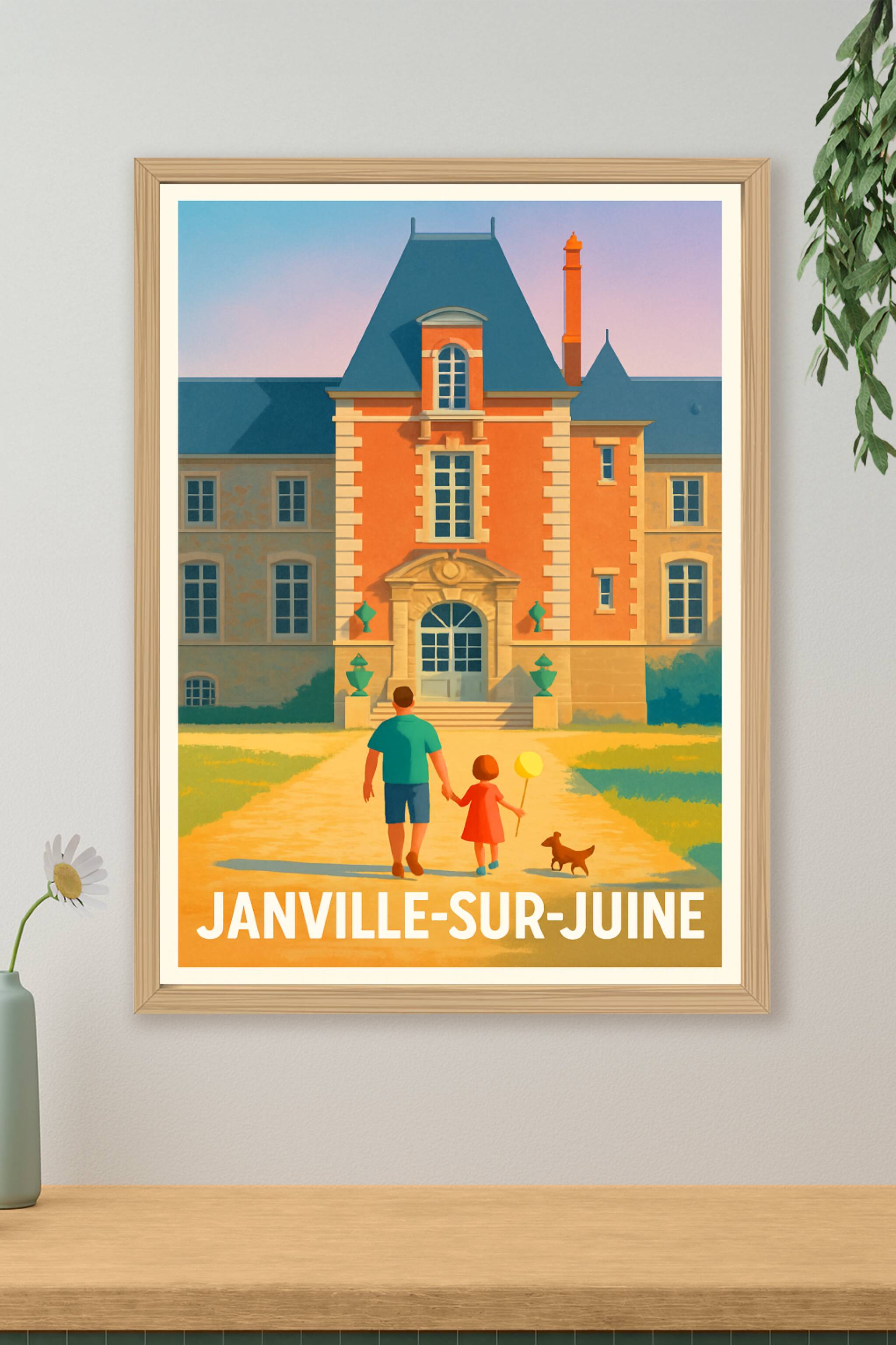 Découvrez la douceur de vivre à Janville-sur-Juine avec cette affiche illustrée mettant en scène une promenade paisible devant un magnifique châtea...