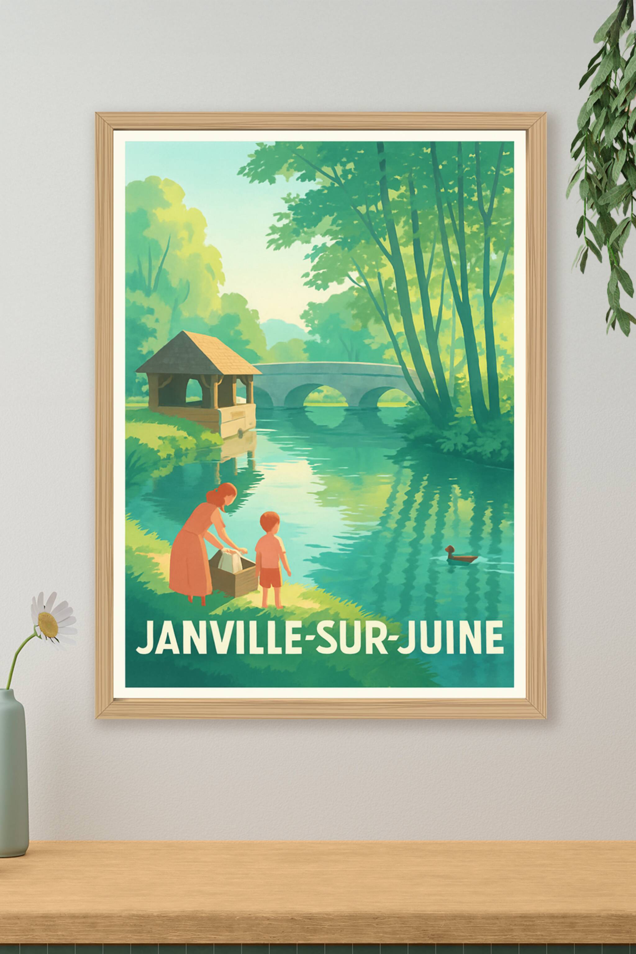 Découvrez la douceur de vivre à Janville-sur-Juine avec ce poster illustré empreint de sérénité, où une mère et son enfant partagent un moment tran...