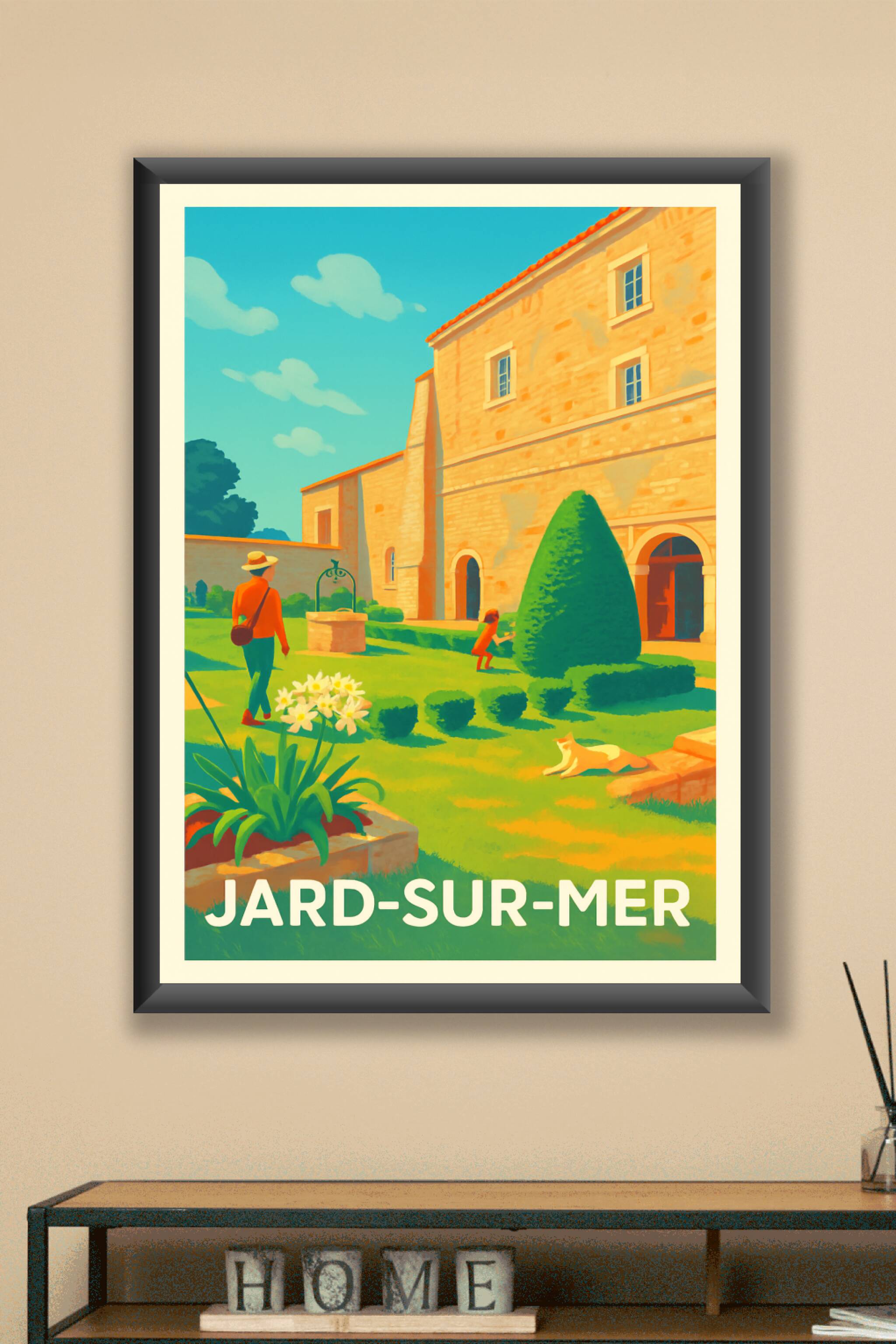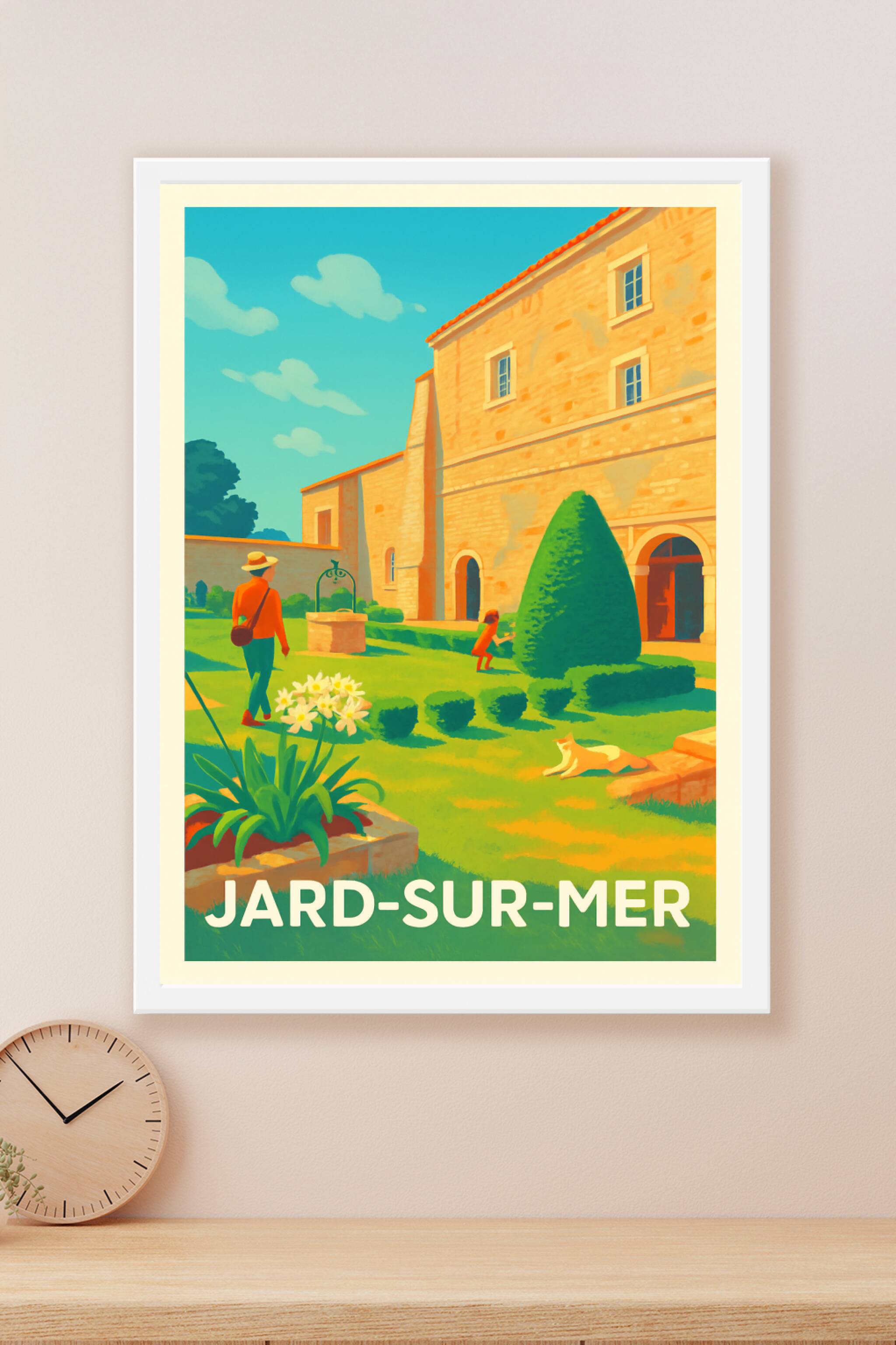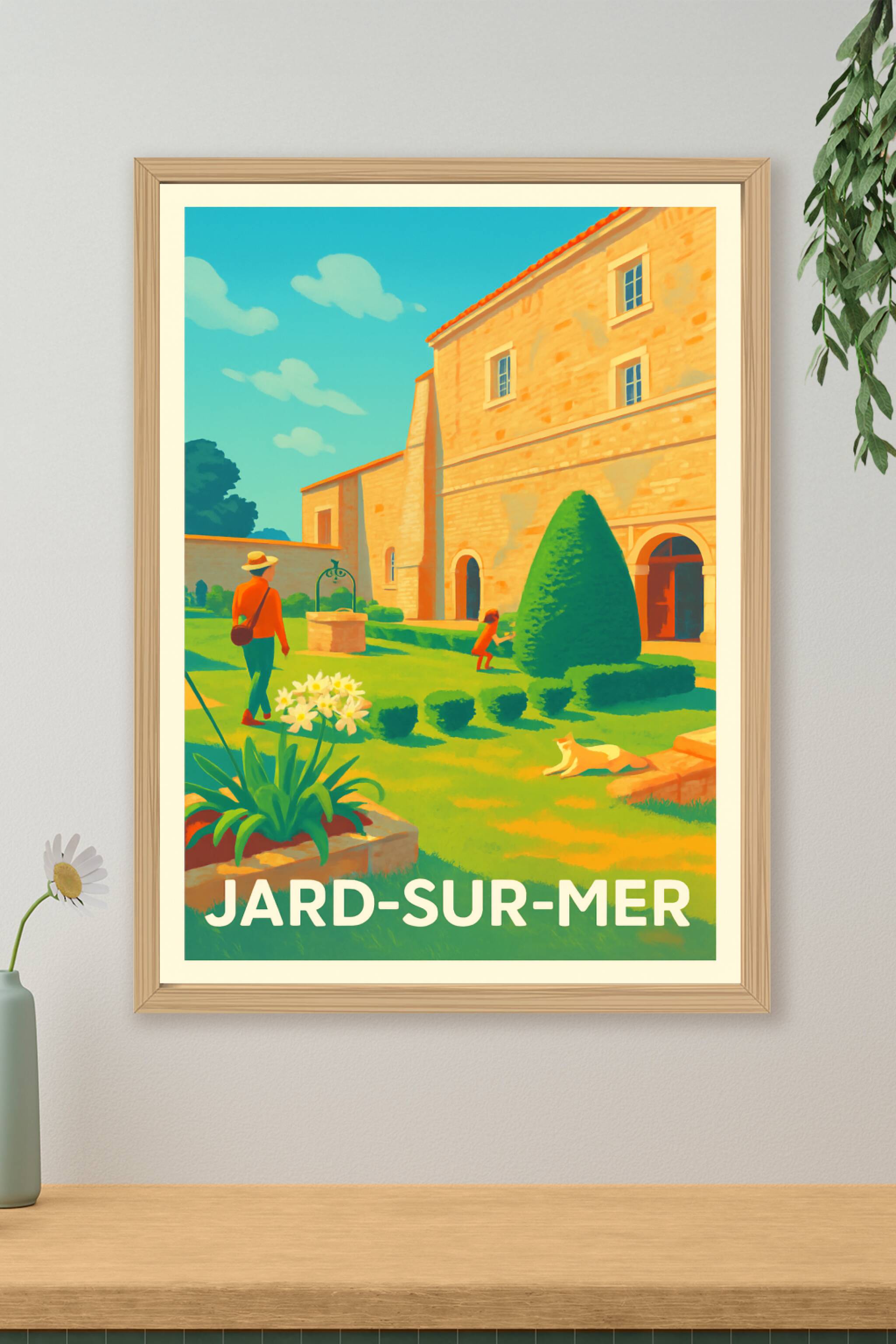 Découvrez l'élégance et la sérénité du patrimoine de Jard-sur-Mer avec cette magnifique affiche illustrant un jardin baigné de lumière, où se mêlen...