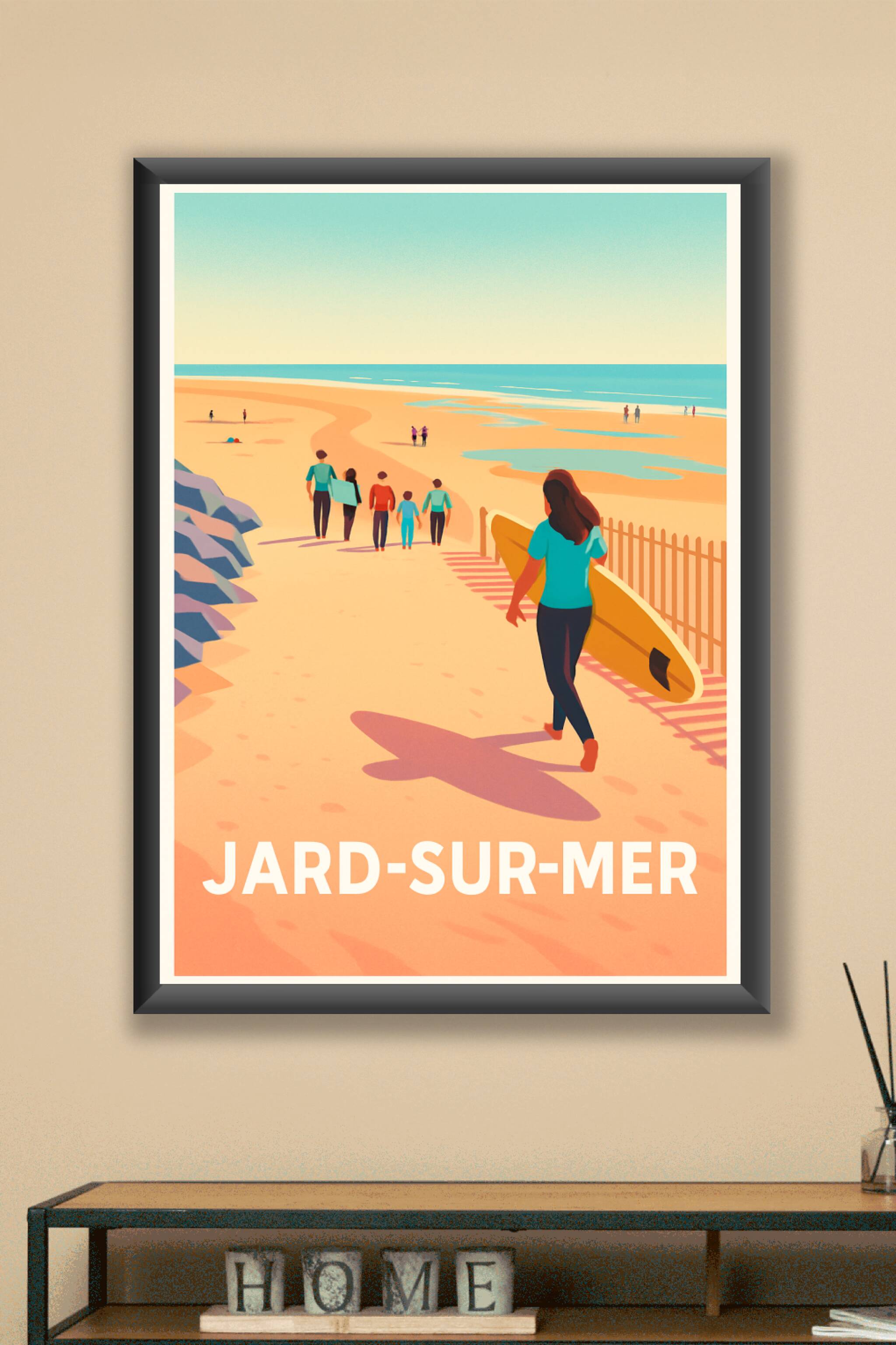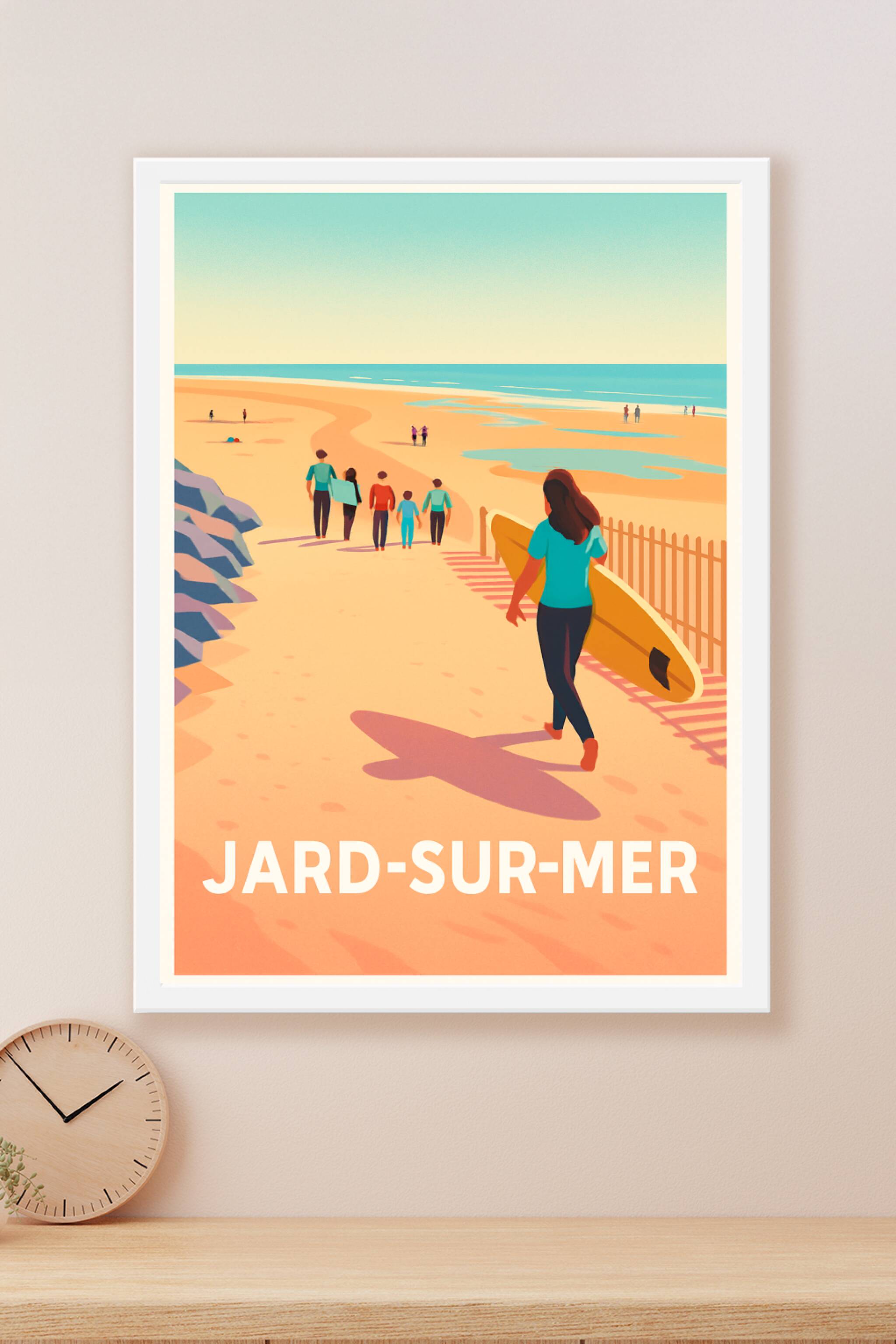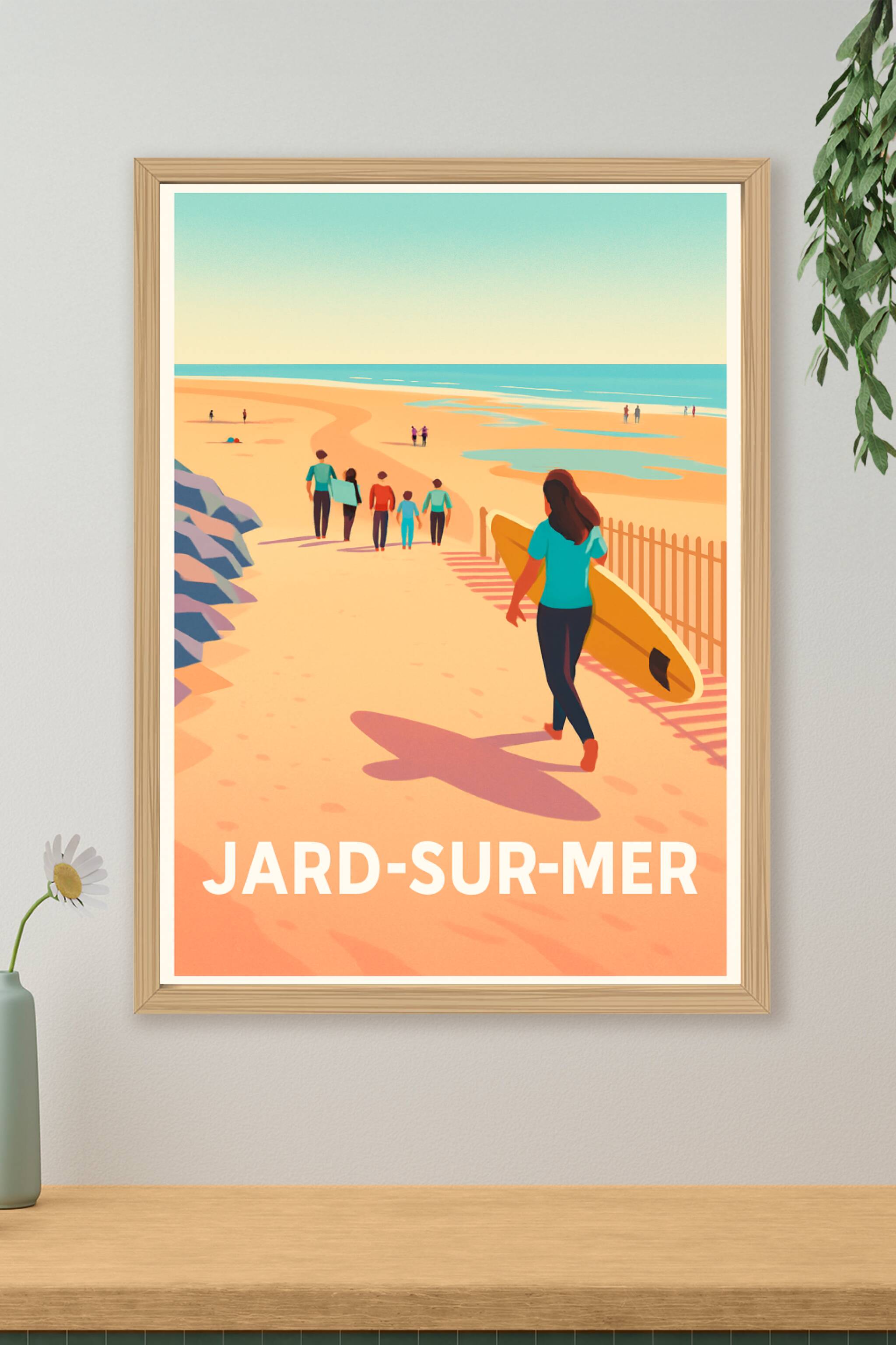 Découvrez la douceur et la sérénité des plages de Jard-sur-Mer avec cette affiche illustrée aux couleurs chaudes et lumineuses. Le poster met en scène une scène de bord de mer où un groupe de personnes se dirige vers l'eau, tandis qu'une surfeuse portant sa planche incarne l'esprit sportif et détendu de cette ville côtière.Cette affiche est imprimée en tirage "Fine Art" sur papier 305g coton de haute qualité, garantissant une impression aux couleurs vives et durables. Disponible en dimensions A1 à A4, avec ou sans cadre, ce poster apportera une ambiance estivale et relaxante à votre intérieur.Profitez d'une finition premium et d'une fabrication 100% française pour embellir votre décoration ou offrir un souvenir élégant de Jard-sur-Mer.