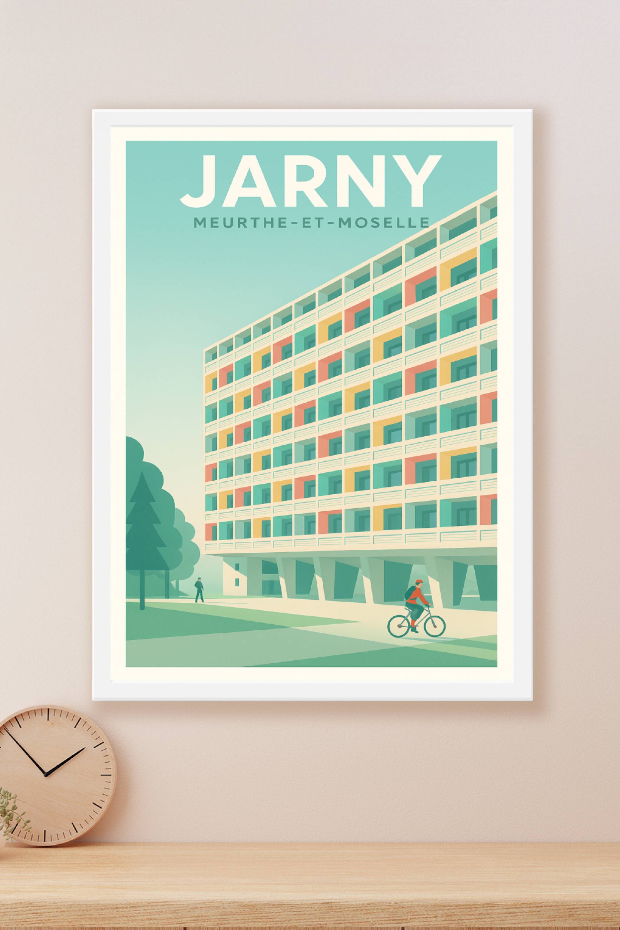 Découvrez cette affiche moderne et colorée illustrant un immeuble emblématique de Jarny, au coeur de Meurthe-et-Moselle. Ce poster graphique offre ...