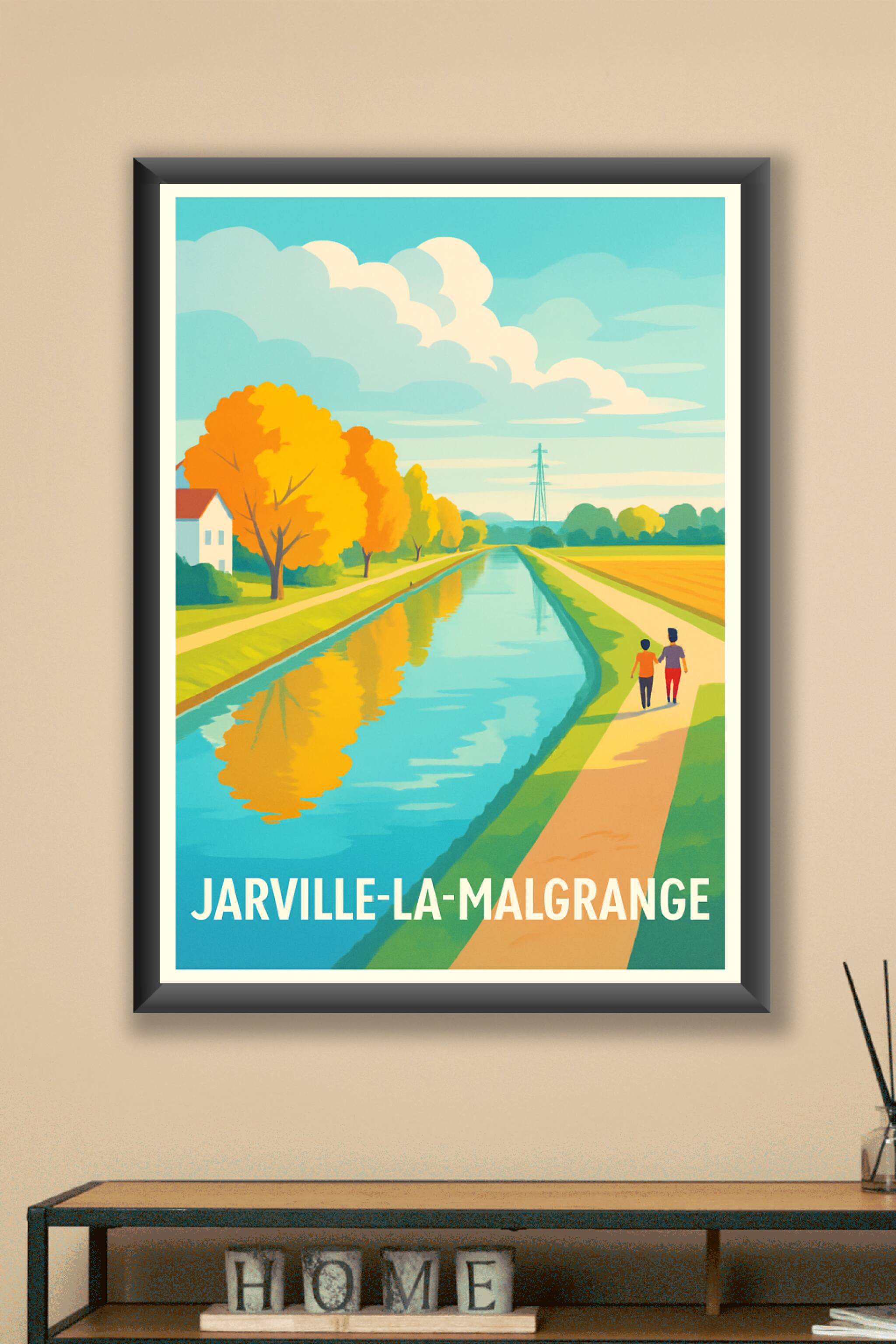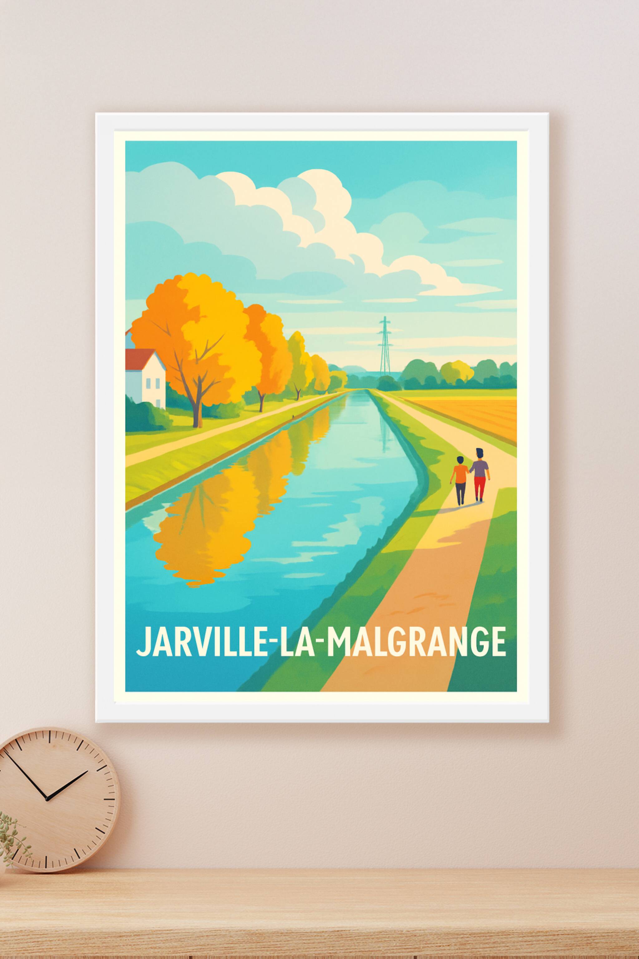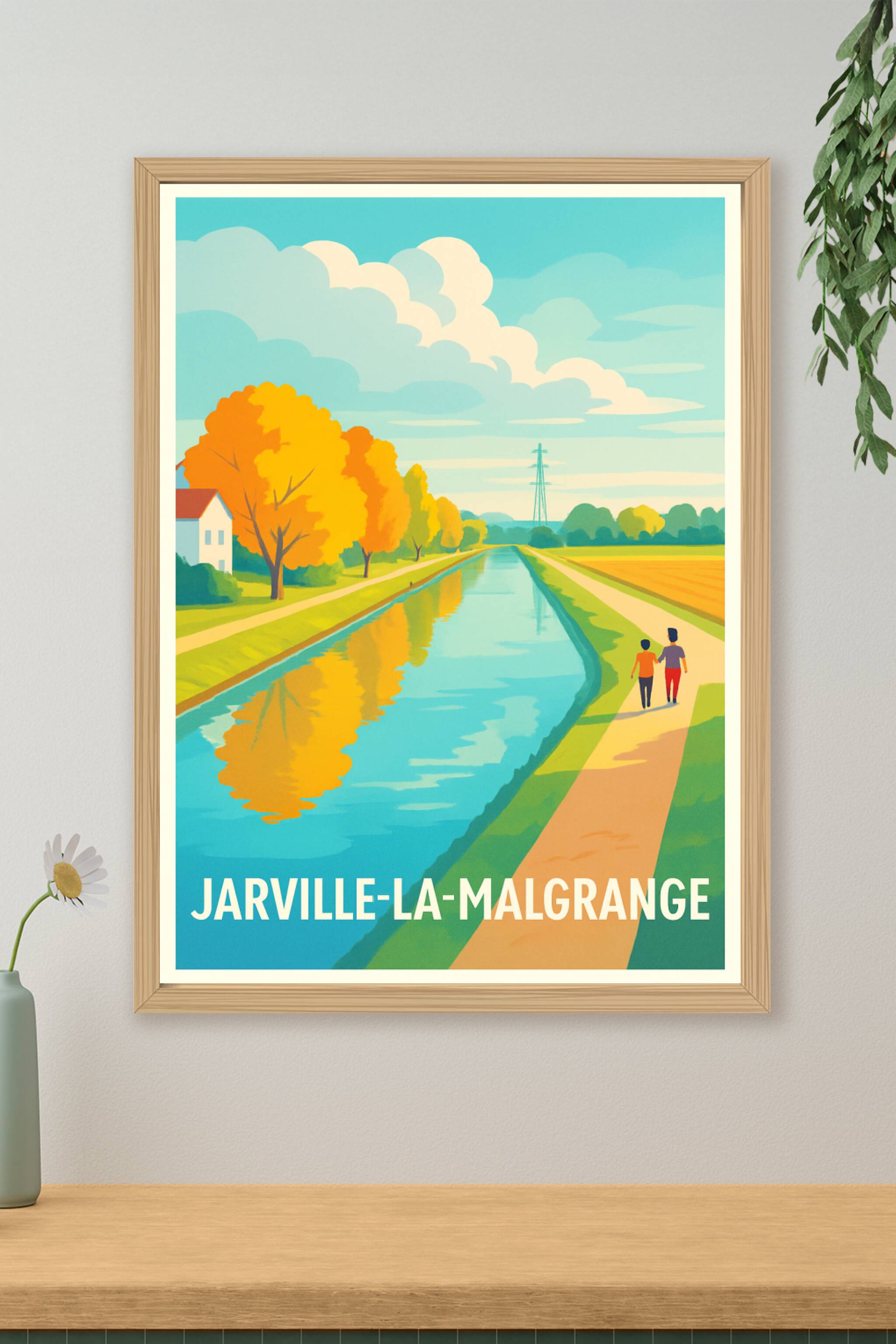 Découvrez la sérénité de Jarville-la-Malgrange avec cette affiche illustrée mettant en scène une promenade le long d’un canal bordé d’arbres aux te...