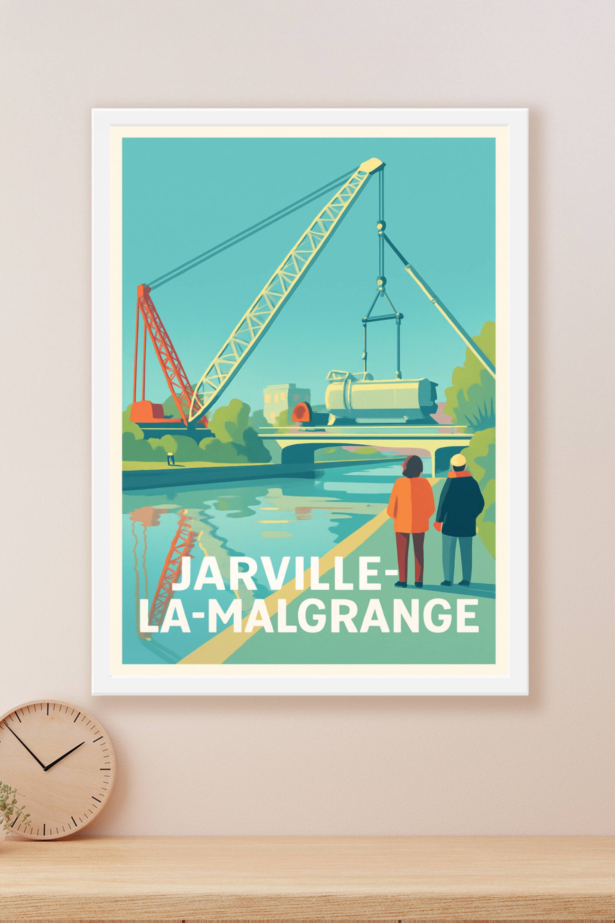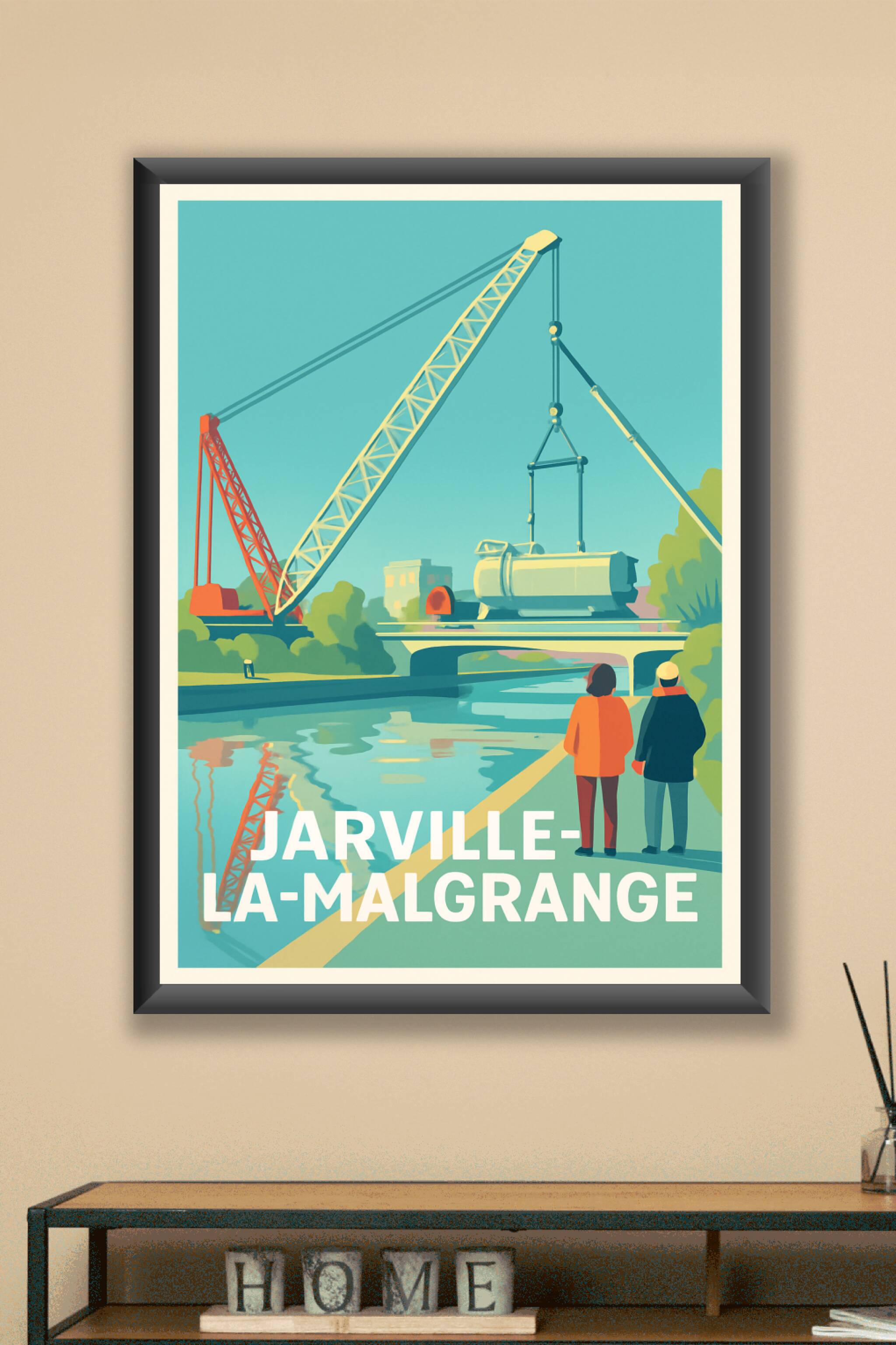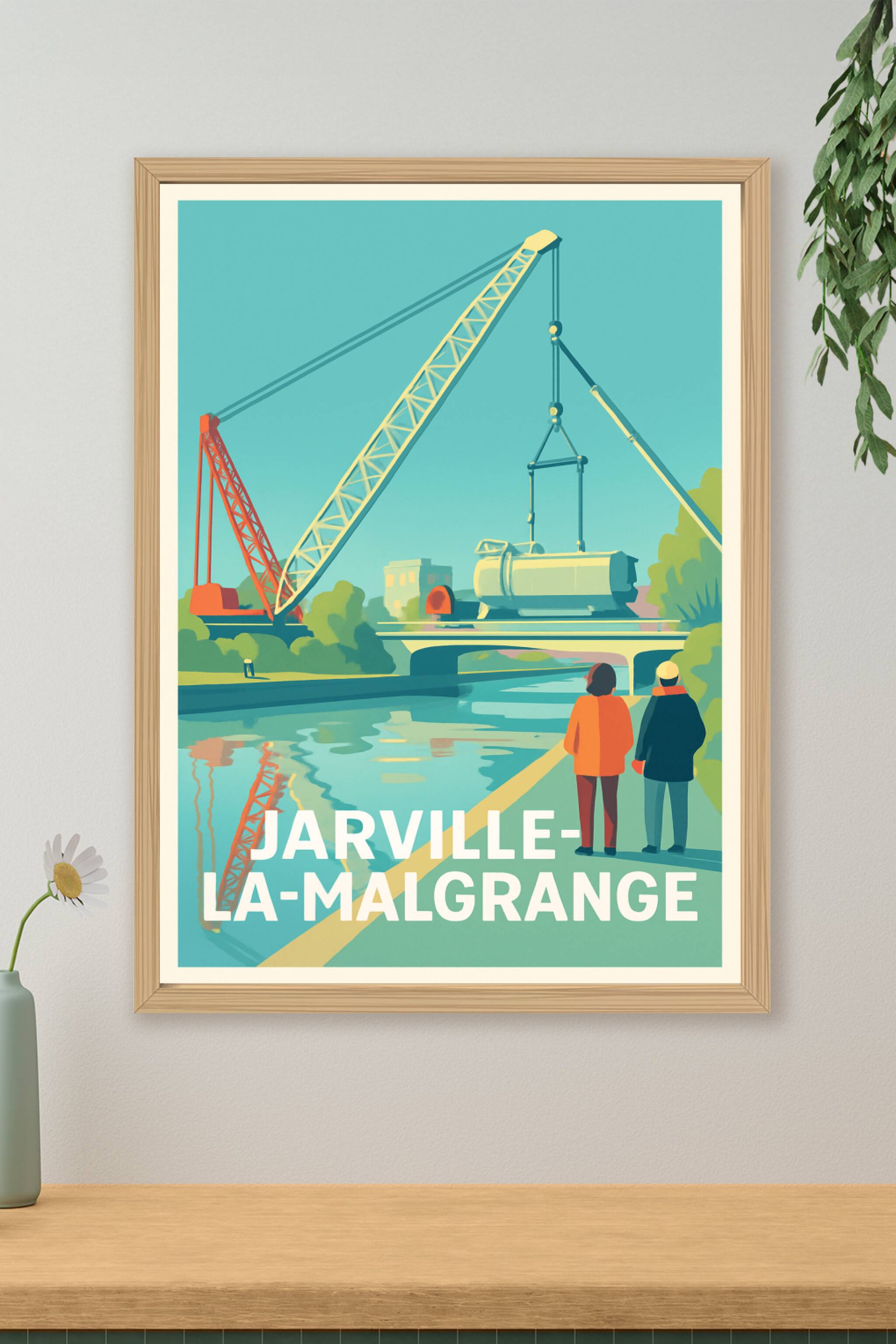 Découvrez l'atmosphère singulière de Jarville-la-Malgrange avec cette affiche représentant une scène industrielle relevée par le calme du canal et ...