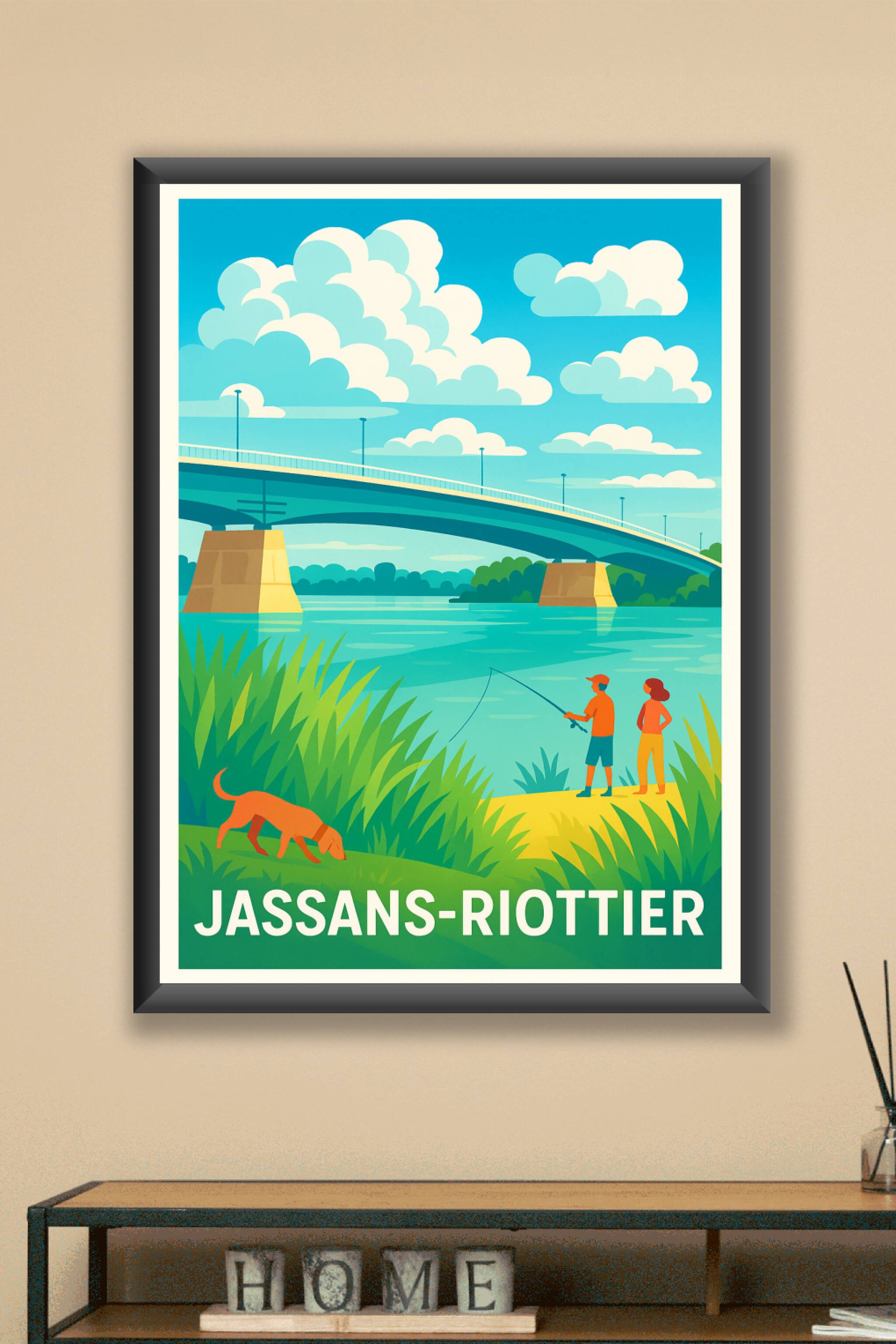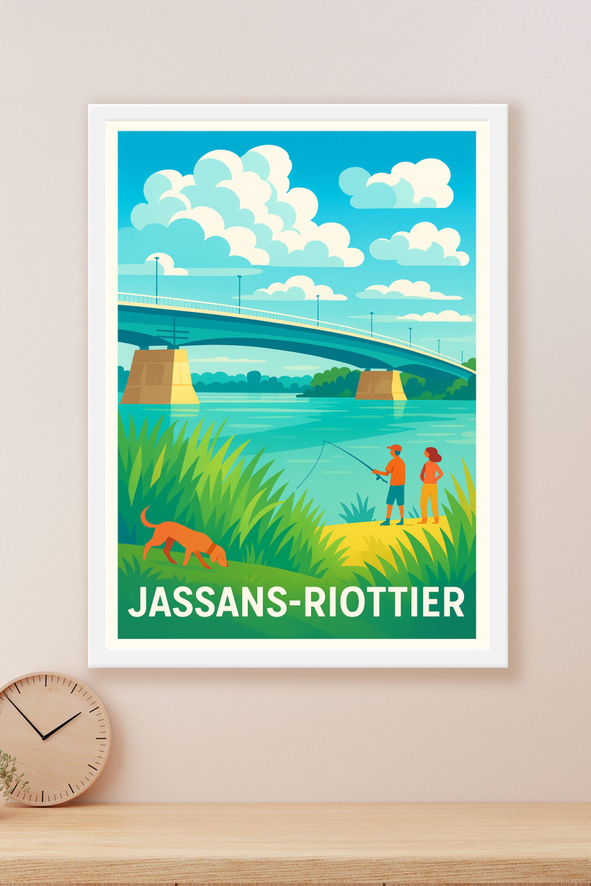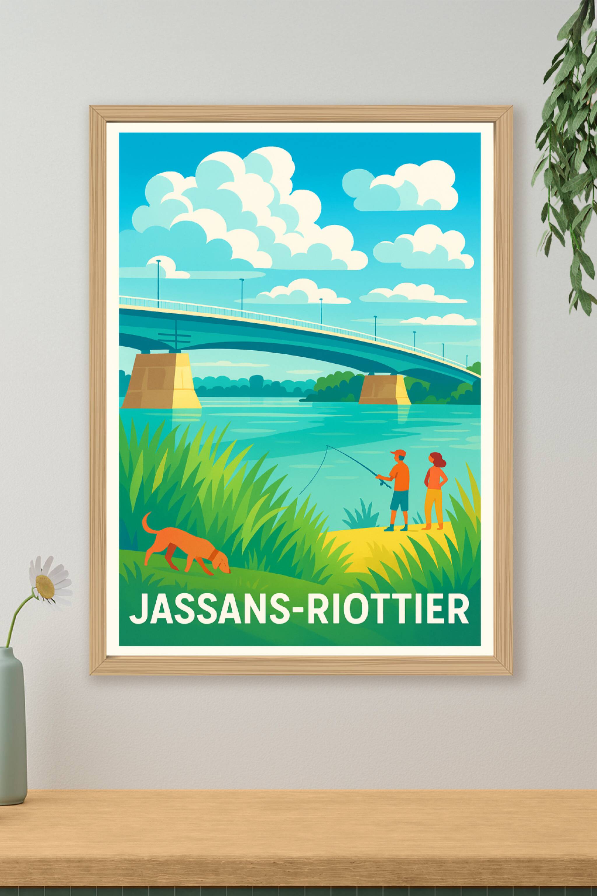 Découvrez la sérénité et la douceur de vivre à Jassans-Riottier avec cette affiche illustrée mettant en scène un pont élégant et les bords paisible...