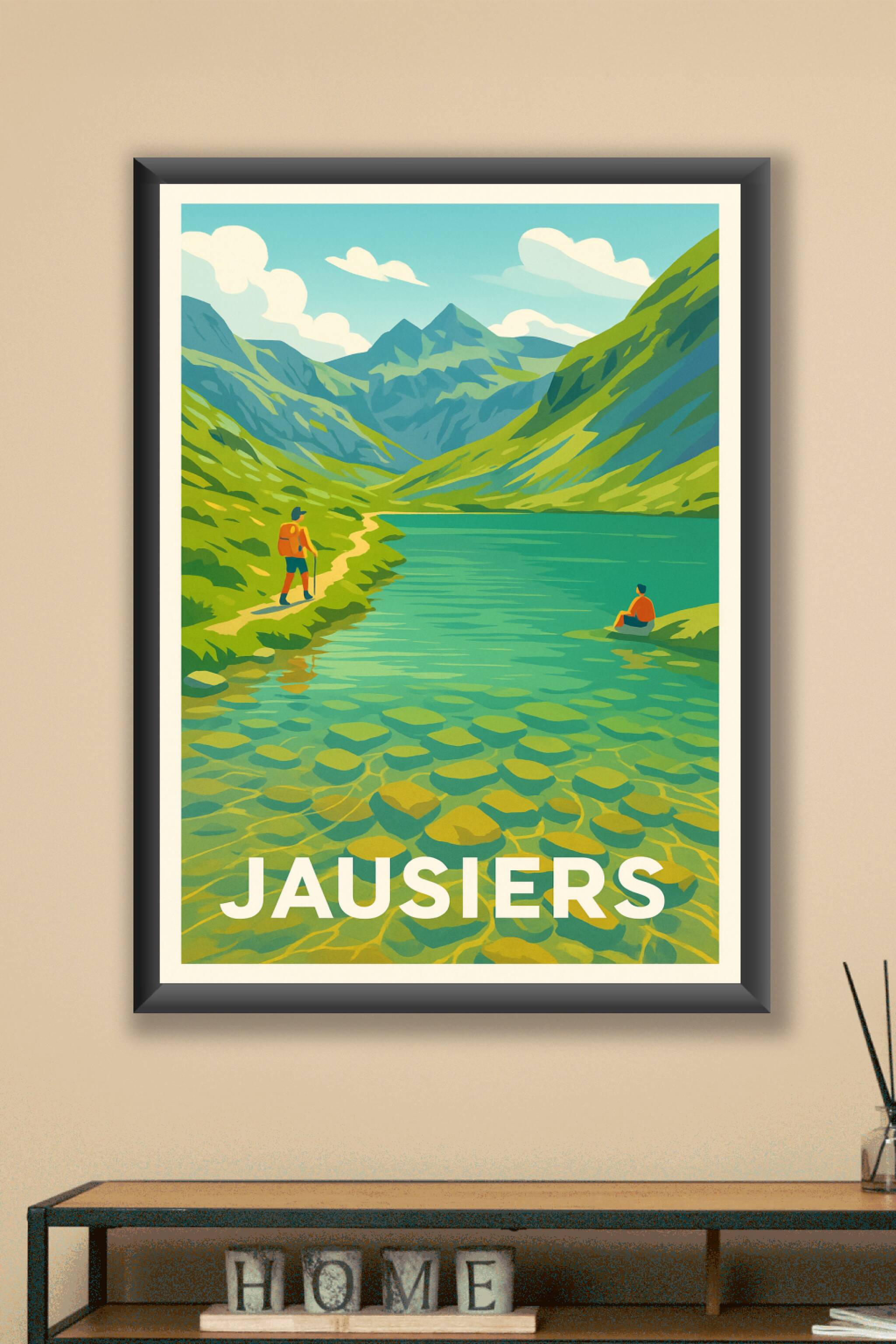 Découvrez la beauté sauvage et apaisante de Jausiers à travers cette affiche inspirante qui capture les paysages majestueux des montagnes et l'eau ...