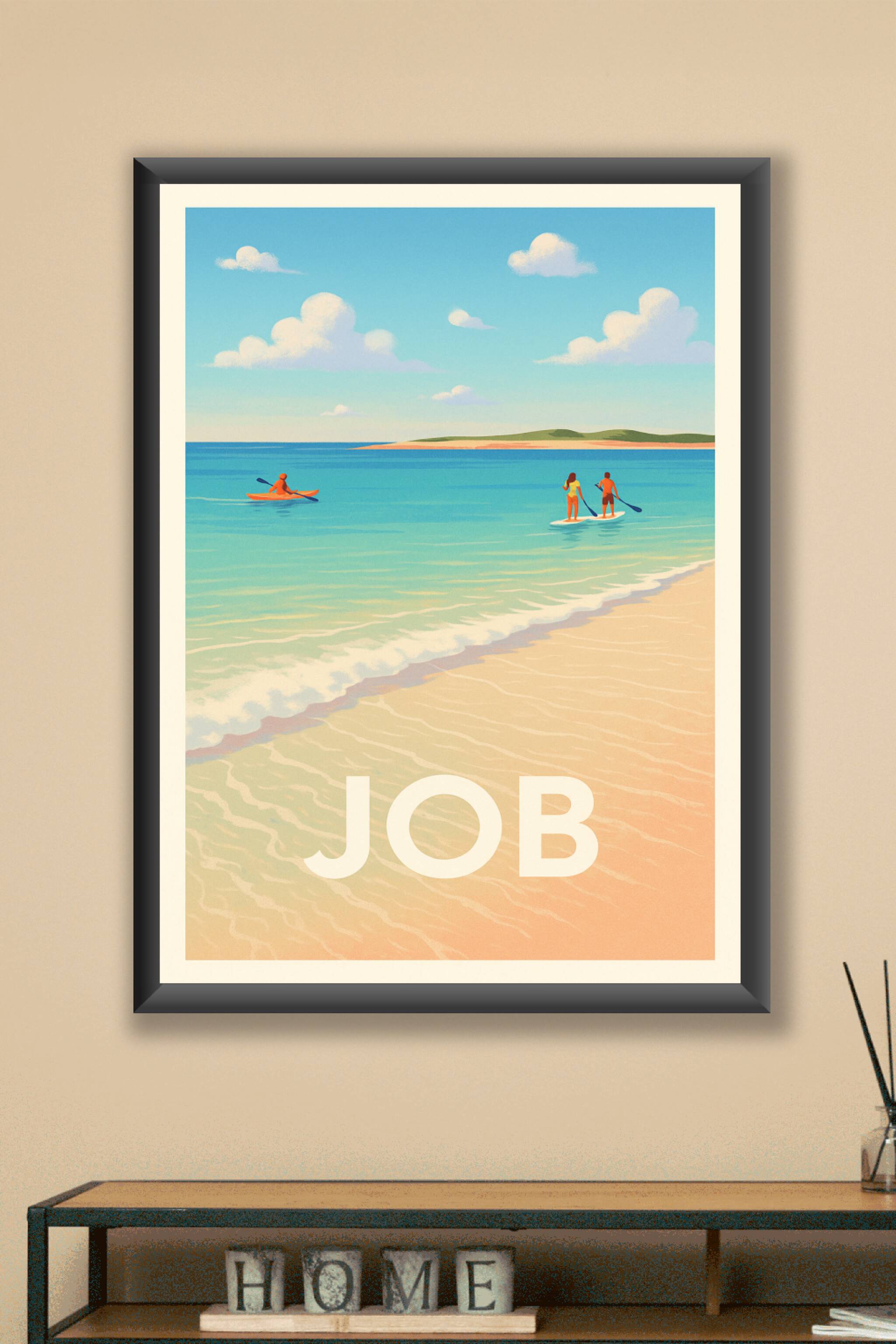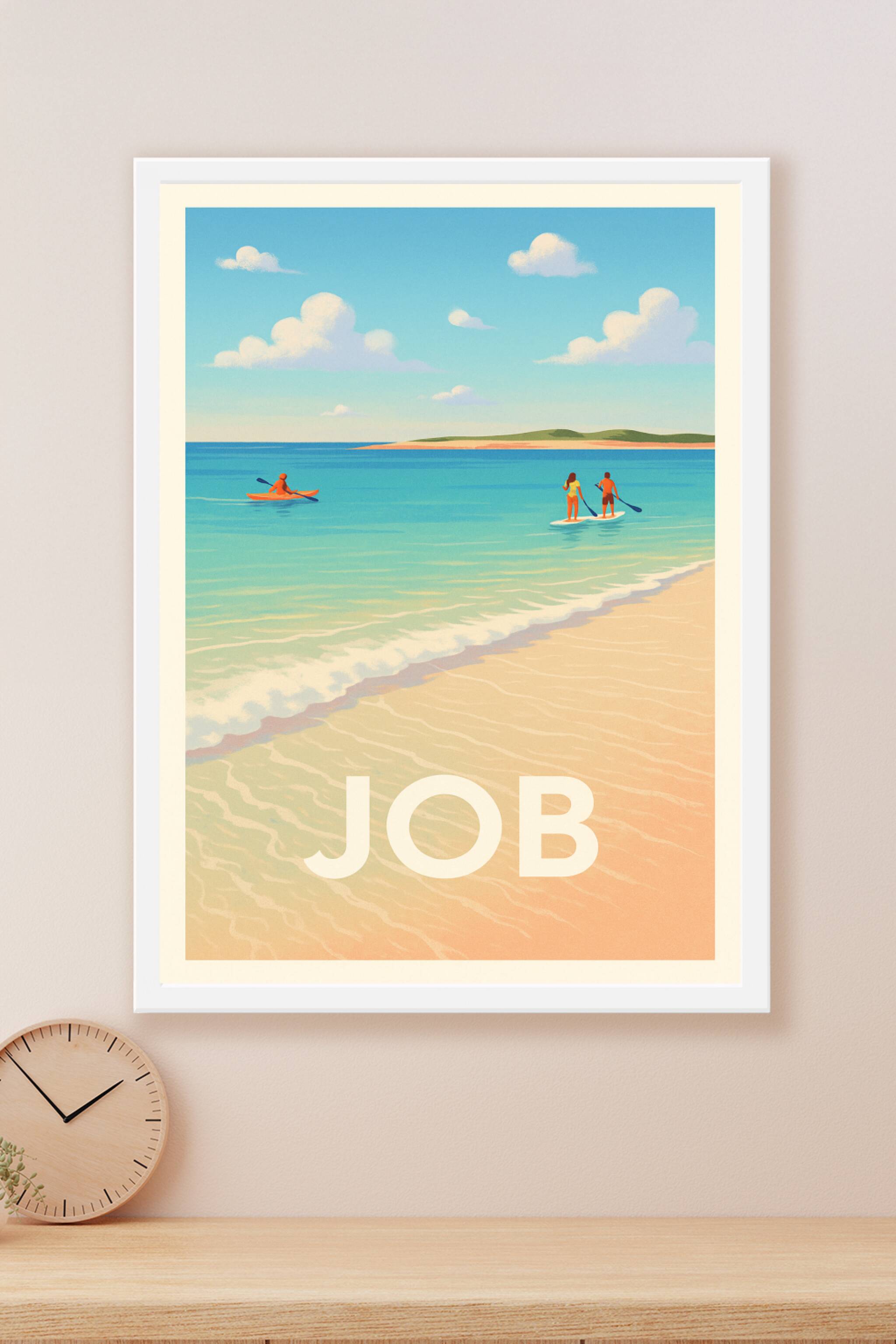 Découvrez cette magnifique affiche illustrant la plage de Job, un lieu paisible où l'eau turquoise rencontre le sable fin sous un ciel serein. Ce p...