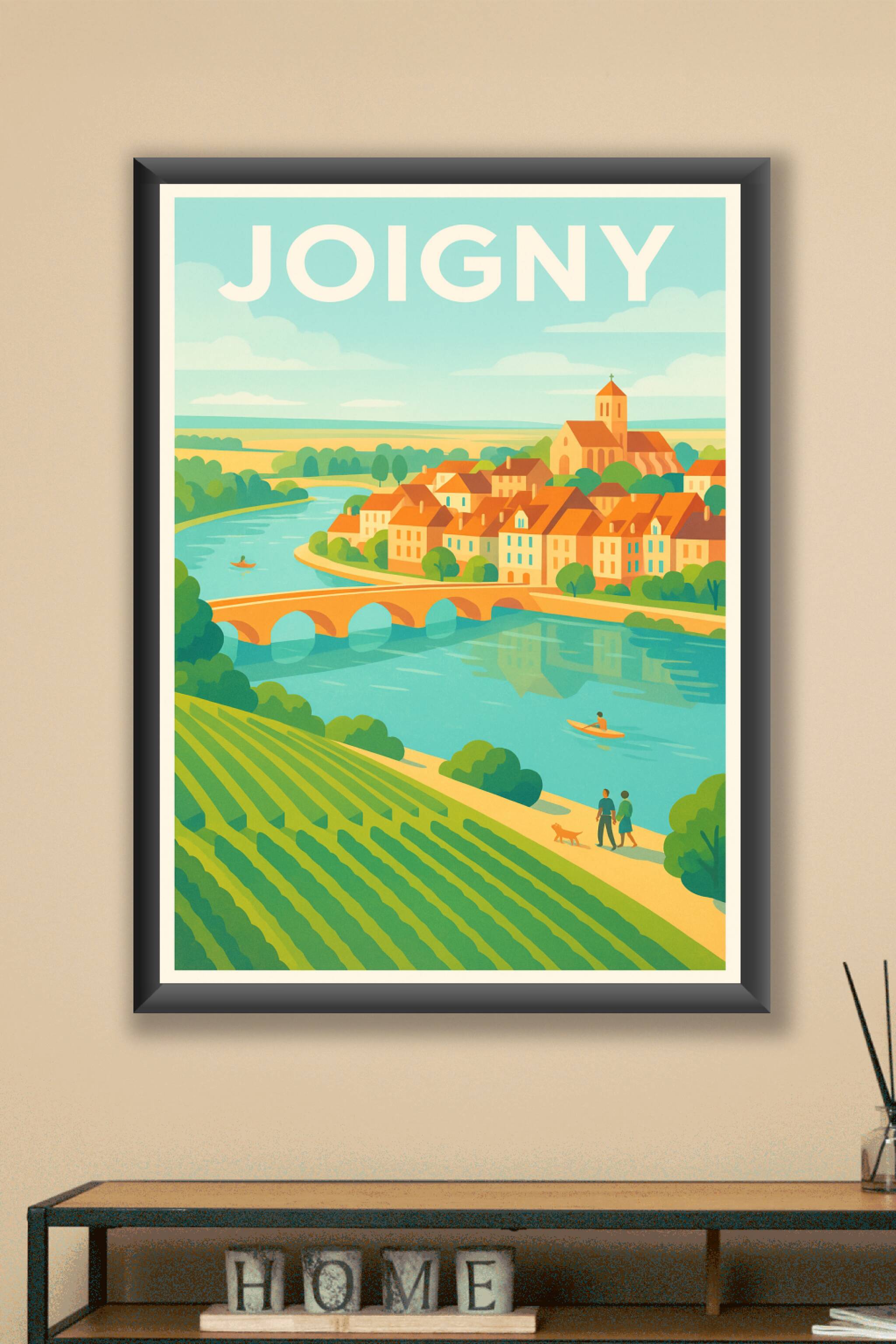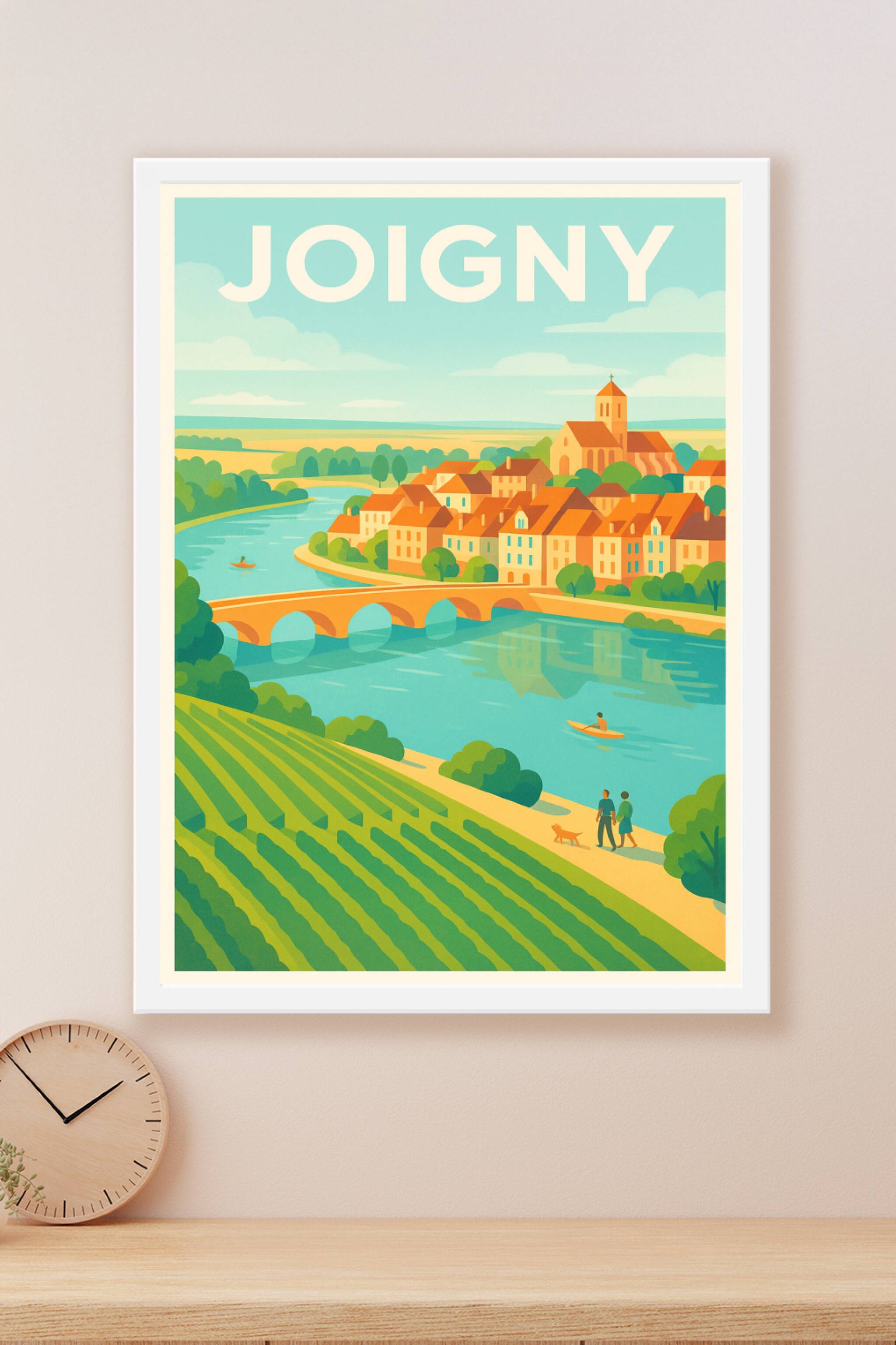Découvrez la douceur de vivre à Joigny avec cette affiche illustrée d'un paysage bucolique où coule la rivière, bordée de vignes et de charmantes m...