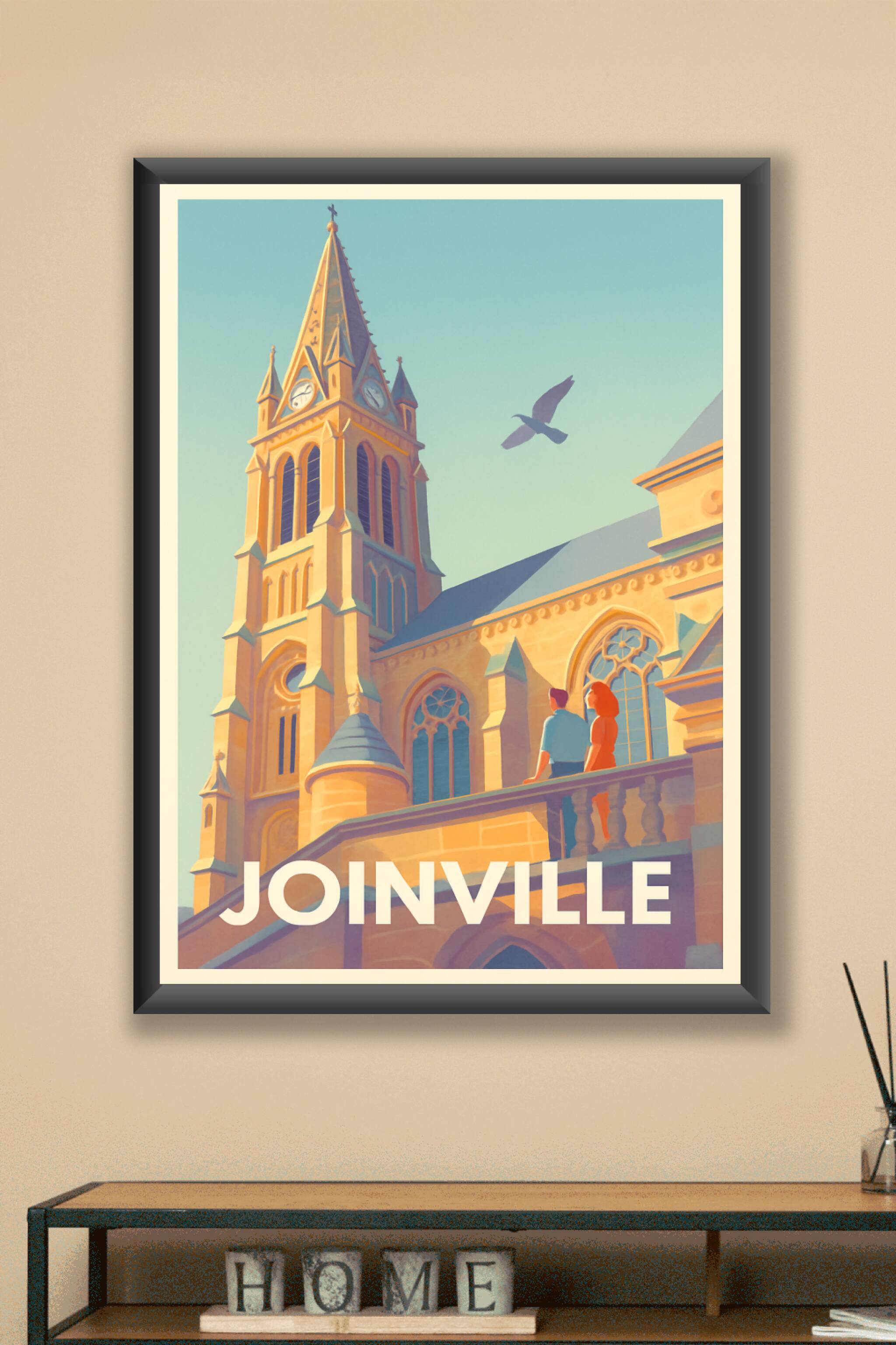 Découvrez la beauté architecturale de Joinville avec cette affiche captivante mettant en avant le clocher emblématique baigné par la lumière dorée du soleil. Ce poster illustre un moment paisible où deux personnages admirent le monument, avec un oiseau en plein vol soulignant la sérénité du lieu. Imprimée en tirage Fine Art sur papier 305g coton, cette affiche d’exception garantit des couleurs vibrantes et une qualité premium. Disponible en formats A1 à A4, avec ou sans cadre, elle s’adapte parfaitement à toutes vos envies de décoration intérieure. Apportez une touche de charme et d’histoire de Joinville à votre habitat ou offrez un souvenir unique grâce à ce poster de grande qualité, 100% fabriqué en France.