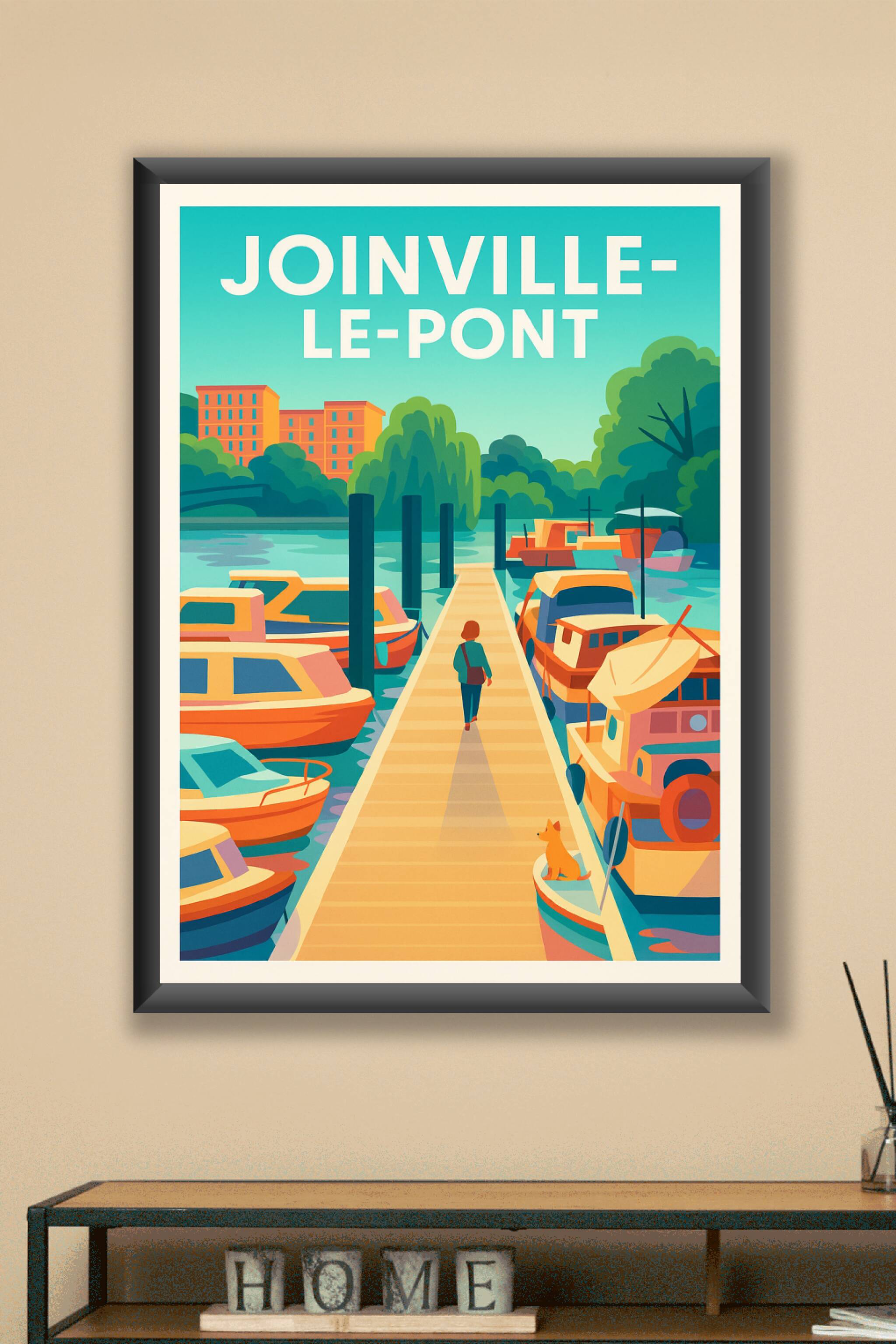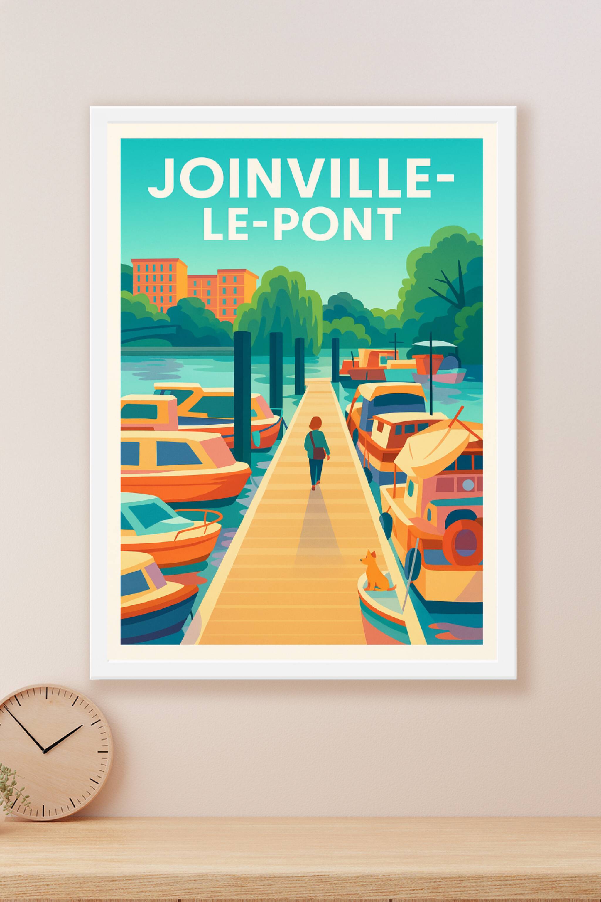 Découvrez la douceur de vivre de Joinville-le-Pont avec ce poster illustré qui capture une promenade paisible au bord du quai, entourée de bateaux ...